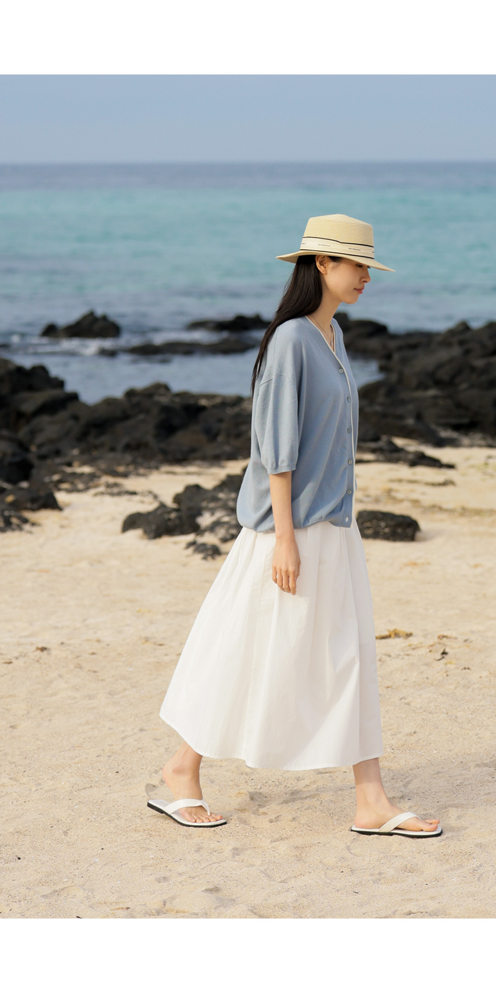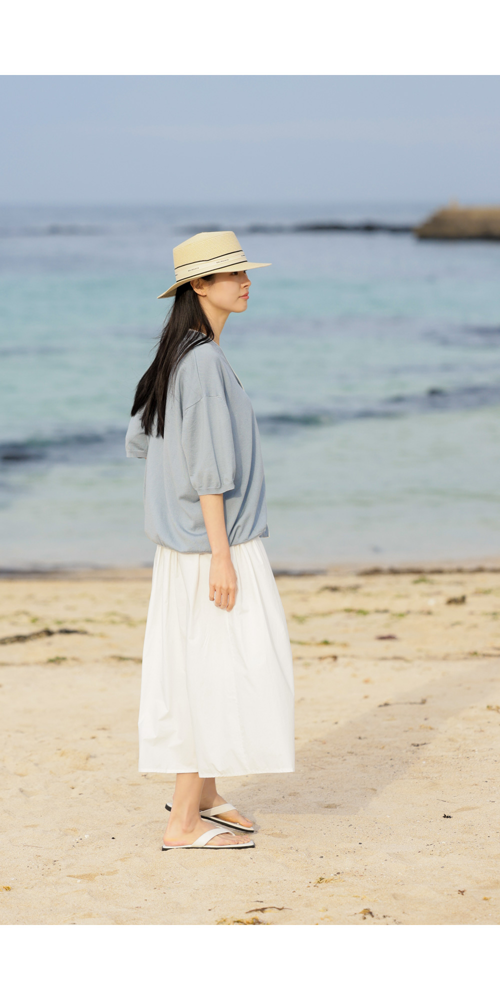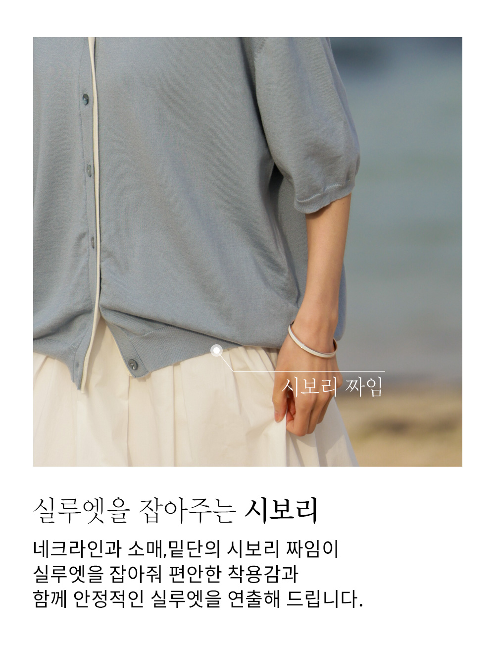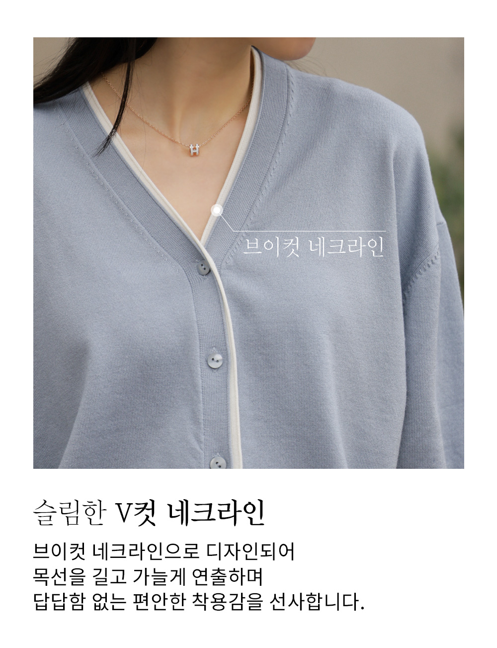 적당한 깊이의 V네크라인은 목선을 길어 보이게 만들어 얼굴형까지 갸름하게 보정해 주고요. 소매 끝단과 밑단은 탄탄한 시보리 마감 처리를 하여 늘어남 걱정 없이 오랫동안 깔끔한 핏을 유지하실 수 있어요.