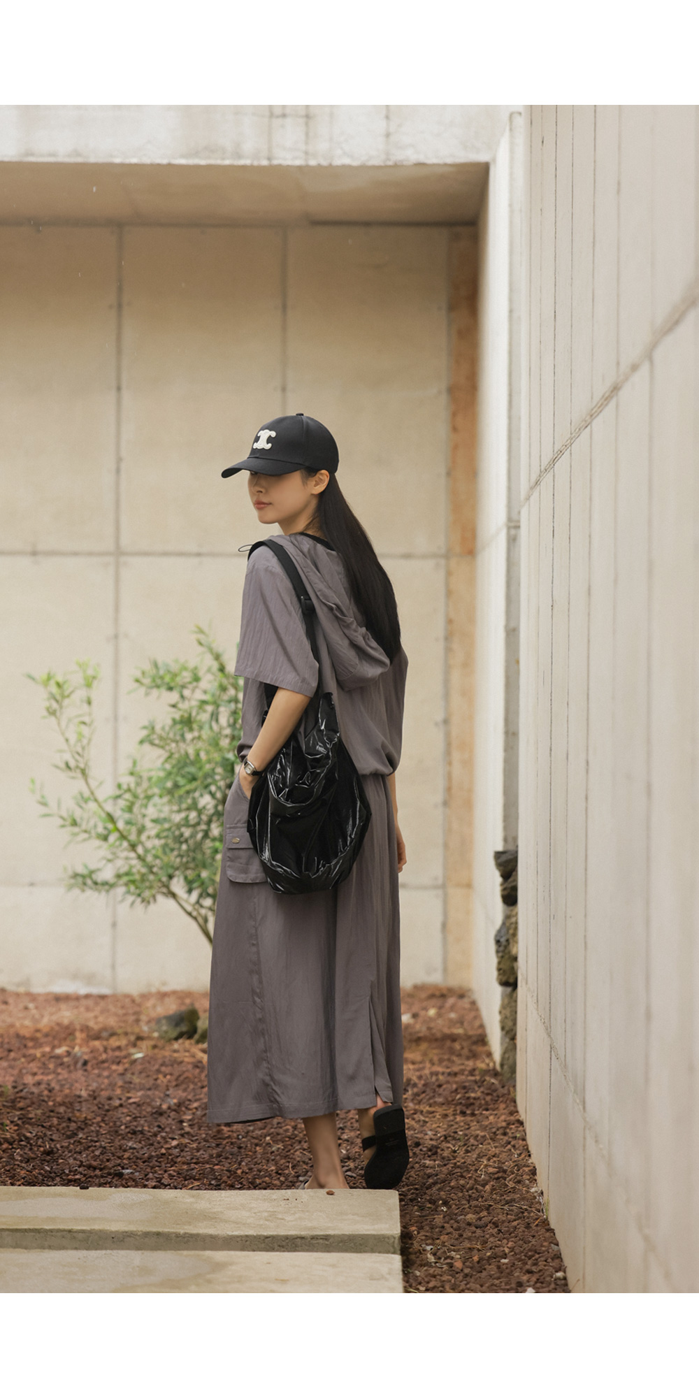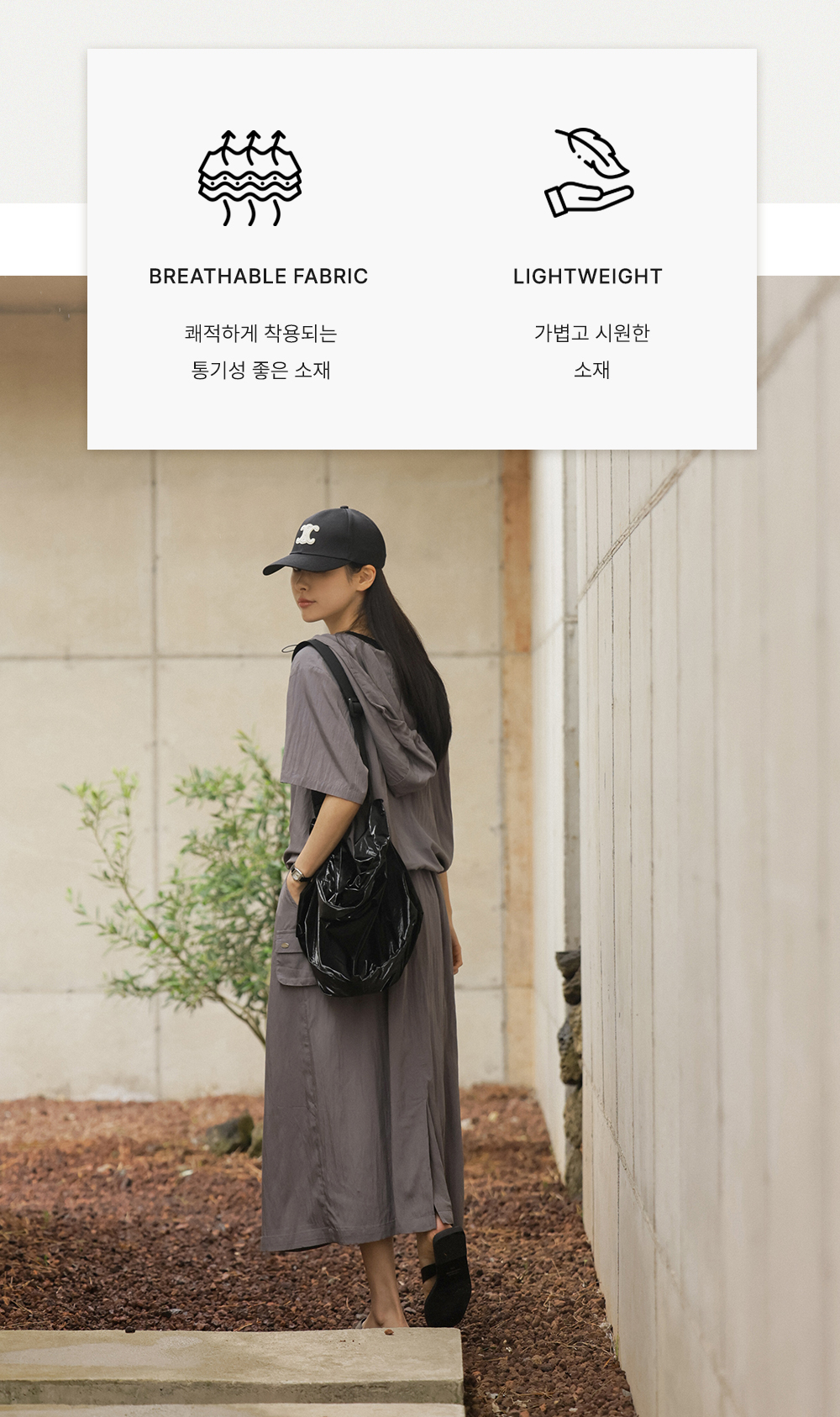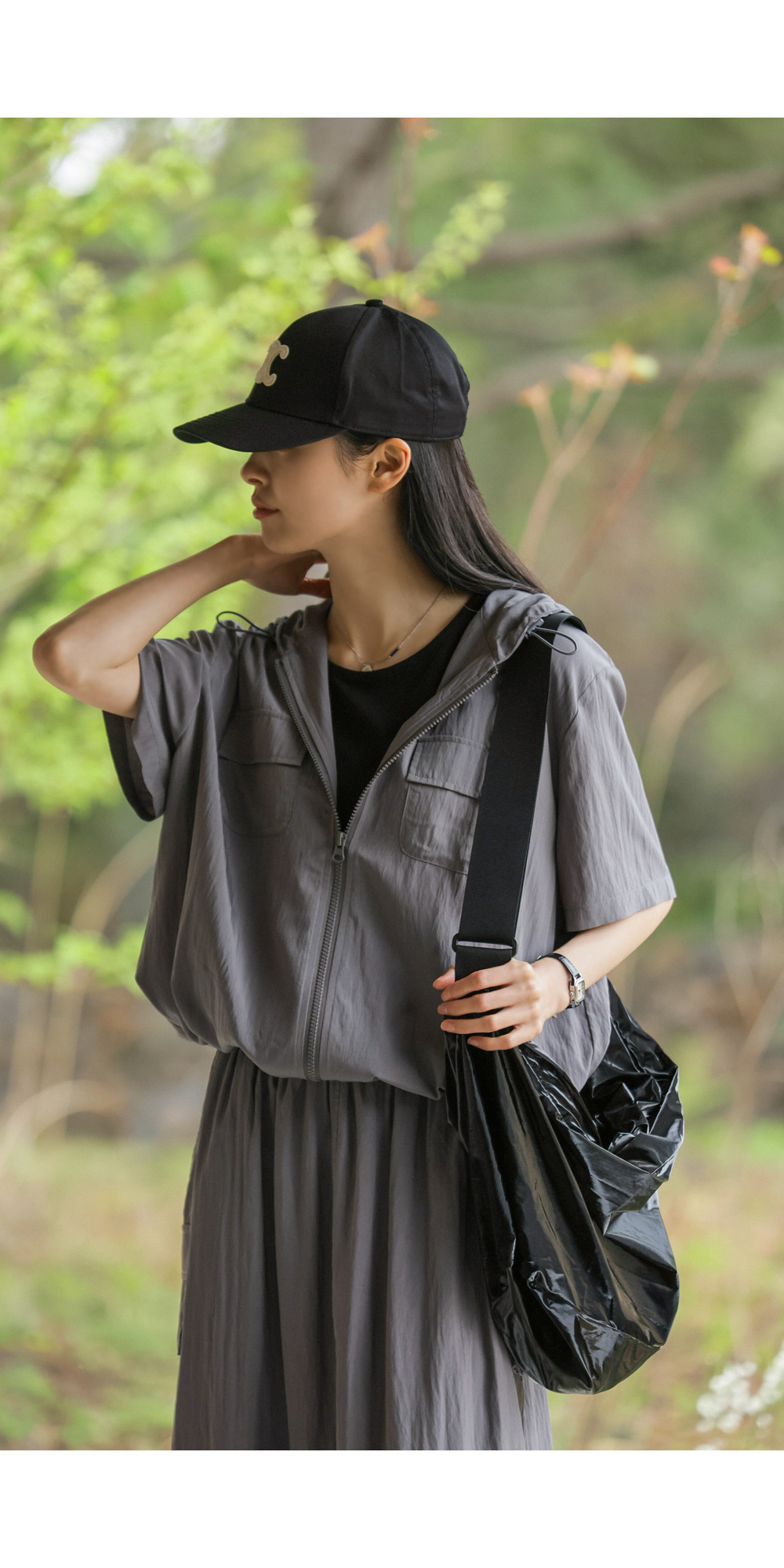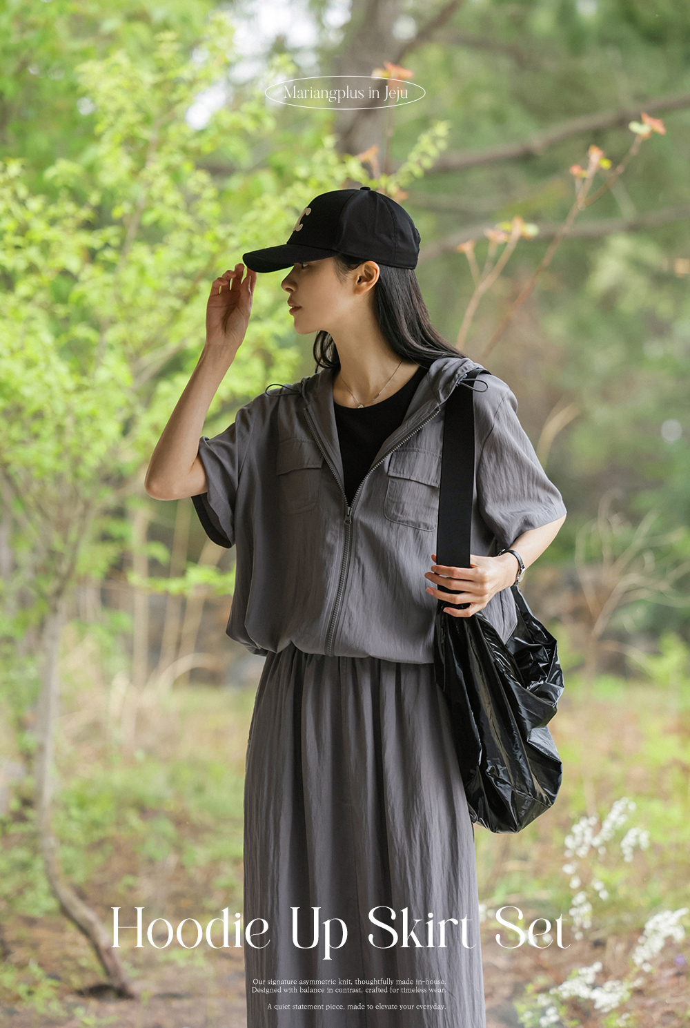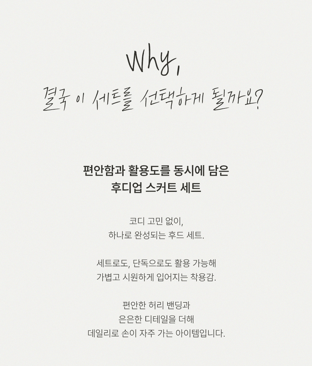 캐주얼한 후드 집업과 세련된 스커트의 조화가 일품이며, 컬러는 무게감 있는 차콜과 어디에나 시크하게 어울리는 블랙 두 가지로 준비되어 있답니다.