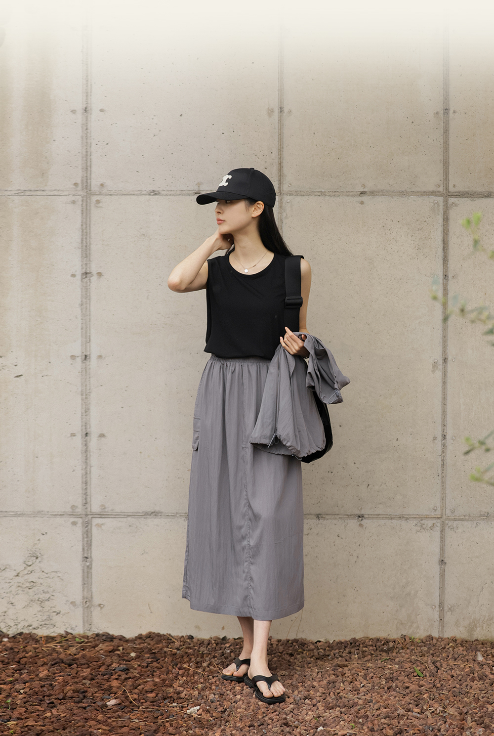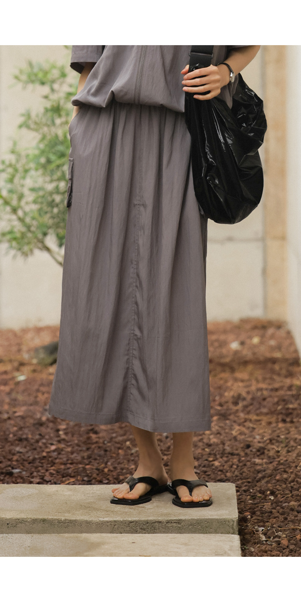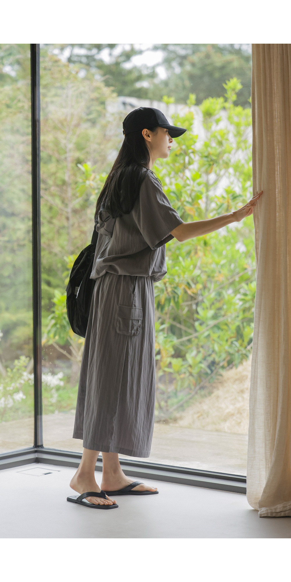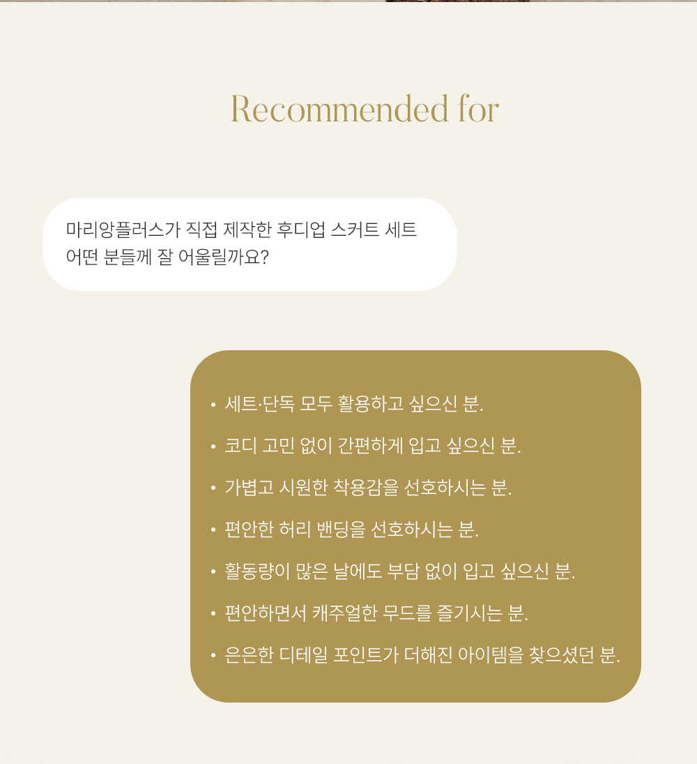 특히 스커트는 허리 전체 밴딩에 스트링 스토퍼까지 더해져 체형에 맞게 완벽한 조절이 가능하구요, 세트로 입었을 때 유틸리티룩의 진수를 보여주지만 각각 단독으로도 활용도가 매우 높은 아이템이예요.