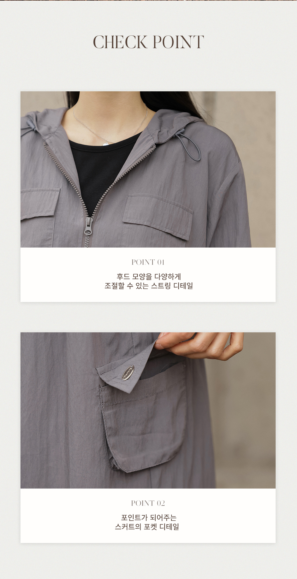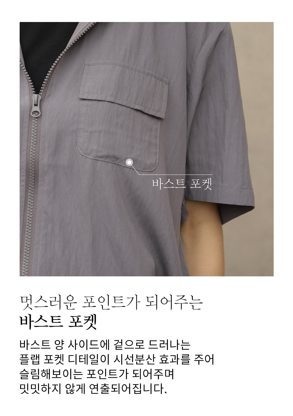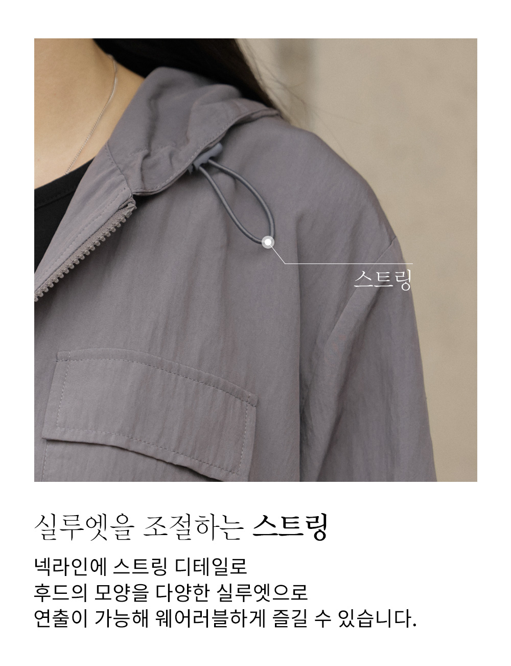가장 눈여겨봐야 할 부분은 바로 세심하게 설계된 '유틸리티 디테일'이에요. 후드 집업은 가슴 부분의 플랩 포켓과 밑단의 히든 스트링으로 원하는 실루엣을 자유롭게 연출할 수 있으며, 지퍼 여밈으로 입고 벗기 편하답니다.