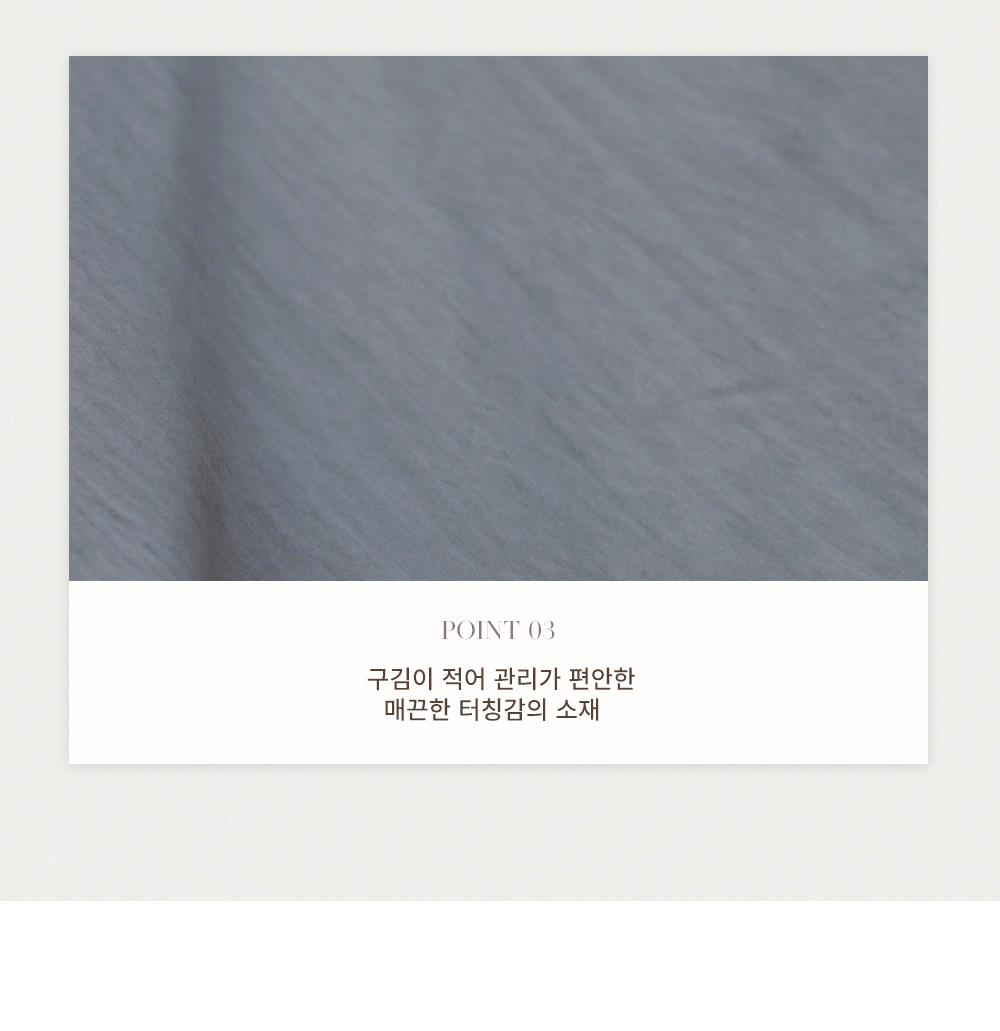 A:레이온 고함유로 피부에 닿는 촉감이 시원하며, 아주 가볍고 매끄러운 두께감이라 지금부터 여름까지도 시원하게 즐기실 수 있는 필수 소장 아이템이에요.