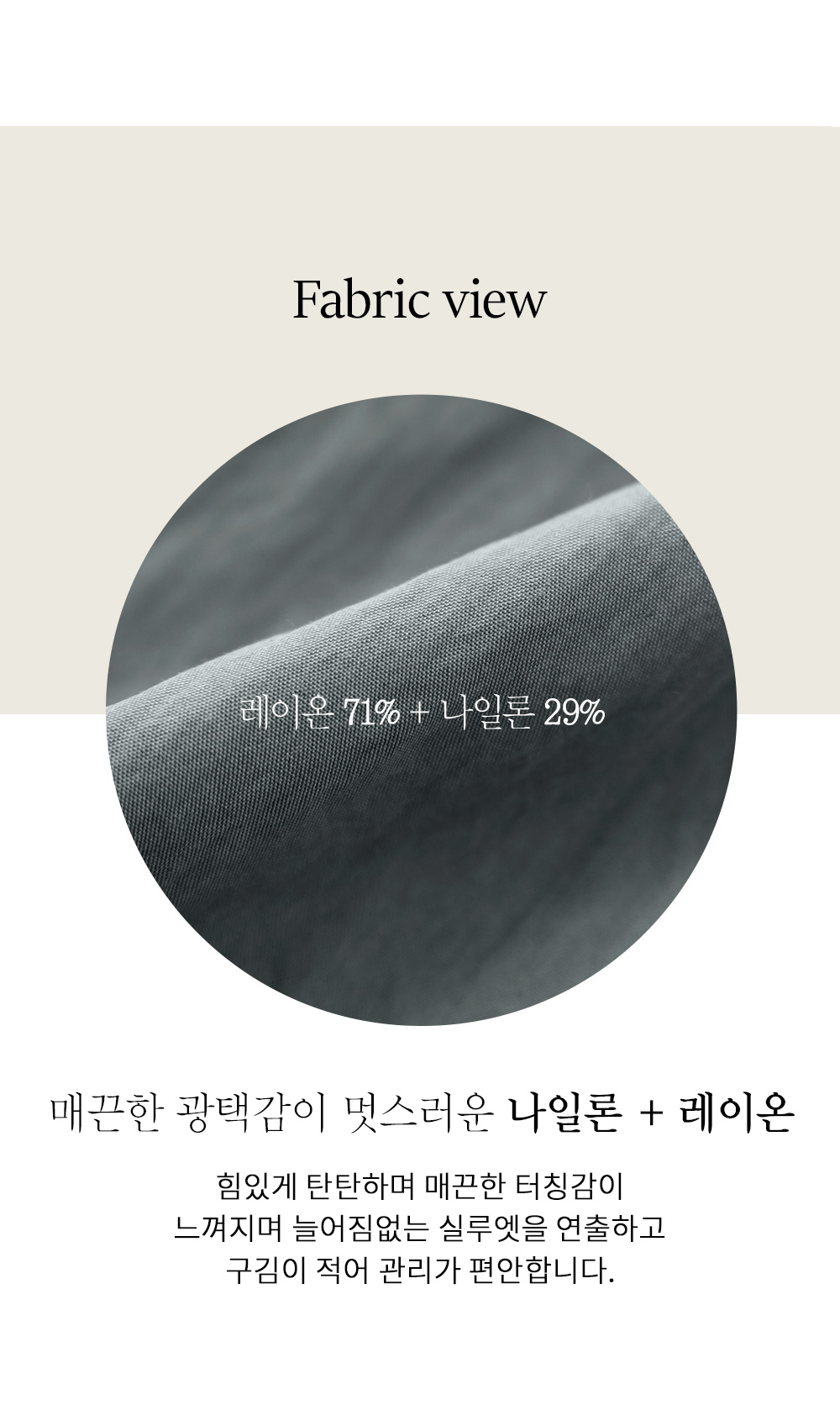 레이온과 나일론이 최적의 비율로 혼방되어 실크처럼 매끄럽고 차르르하게 떨어지는 텍스처가 특징이에요. 입는 순간 피부에 닿는 촉감이 아주 부드럽고 가벼우며, 은은한 광택감이 돌아 시각적으로도 고급스러워 보인답니다. 탄탄한 조직감을 가지고 있어 격한 움직임에도 늘어남 걱정 없이 오랫동안 깔끔한 핏을 유지하실 수 있어요. 가볍고 통기성이 좋은 소재라 기온이 올라가는 날씨에도 끈적임 없이 산뜻한 착용감을 선사하는 고기능성 소재예요.