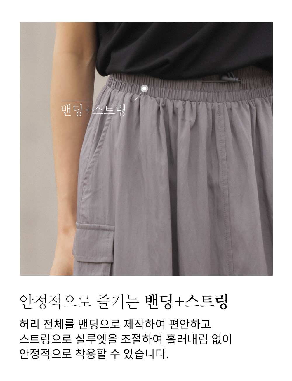 A:히든 스트링이라 깔끔하게 숨겨지며, 스트링을 조절하여 원하는 만큼 볼륨감을 살리거나 일자로 펴서 슬림하게 연출할 수 있어서 오히려 체형 보정에 효과적이에요.