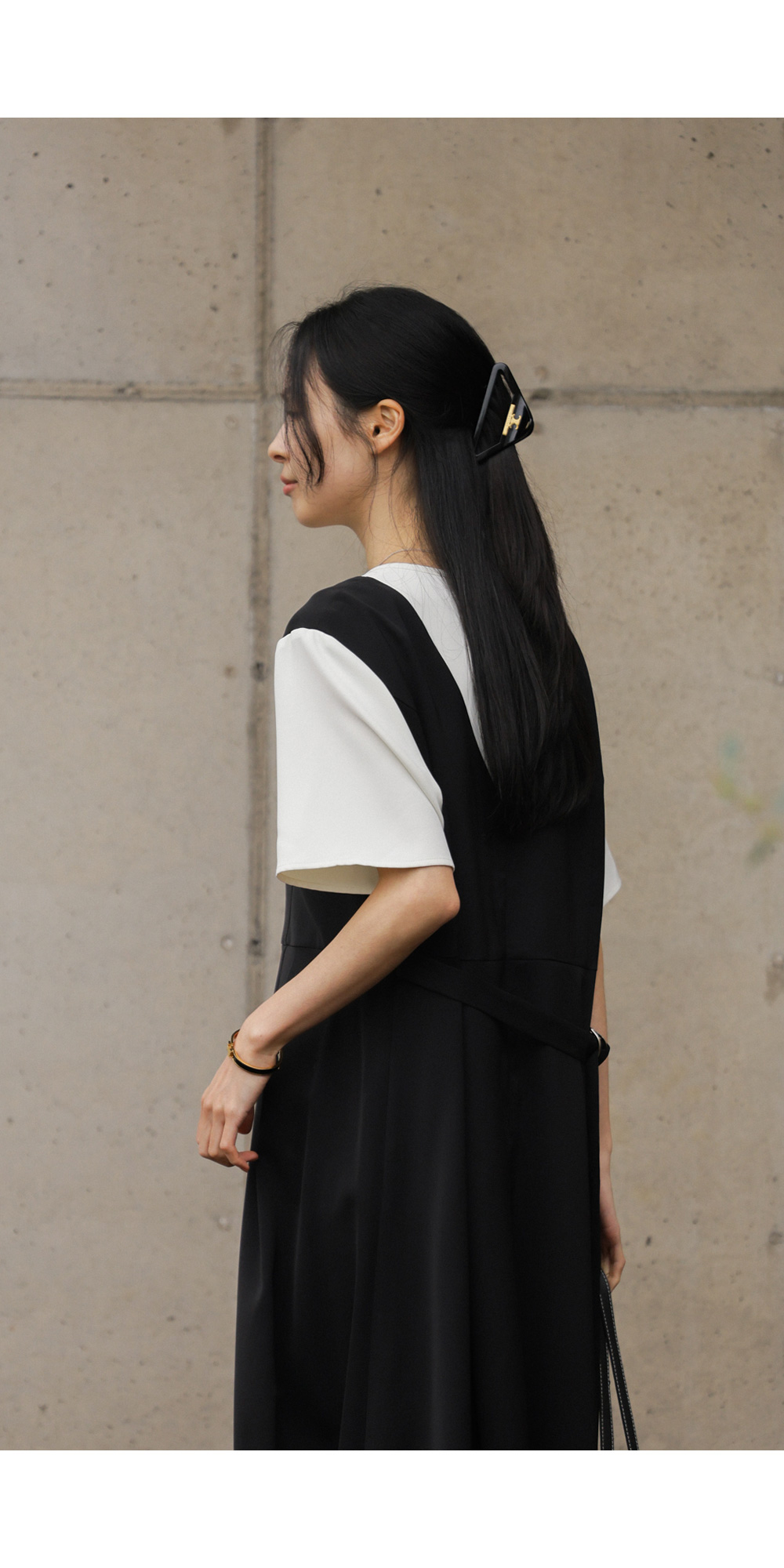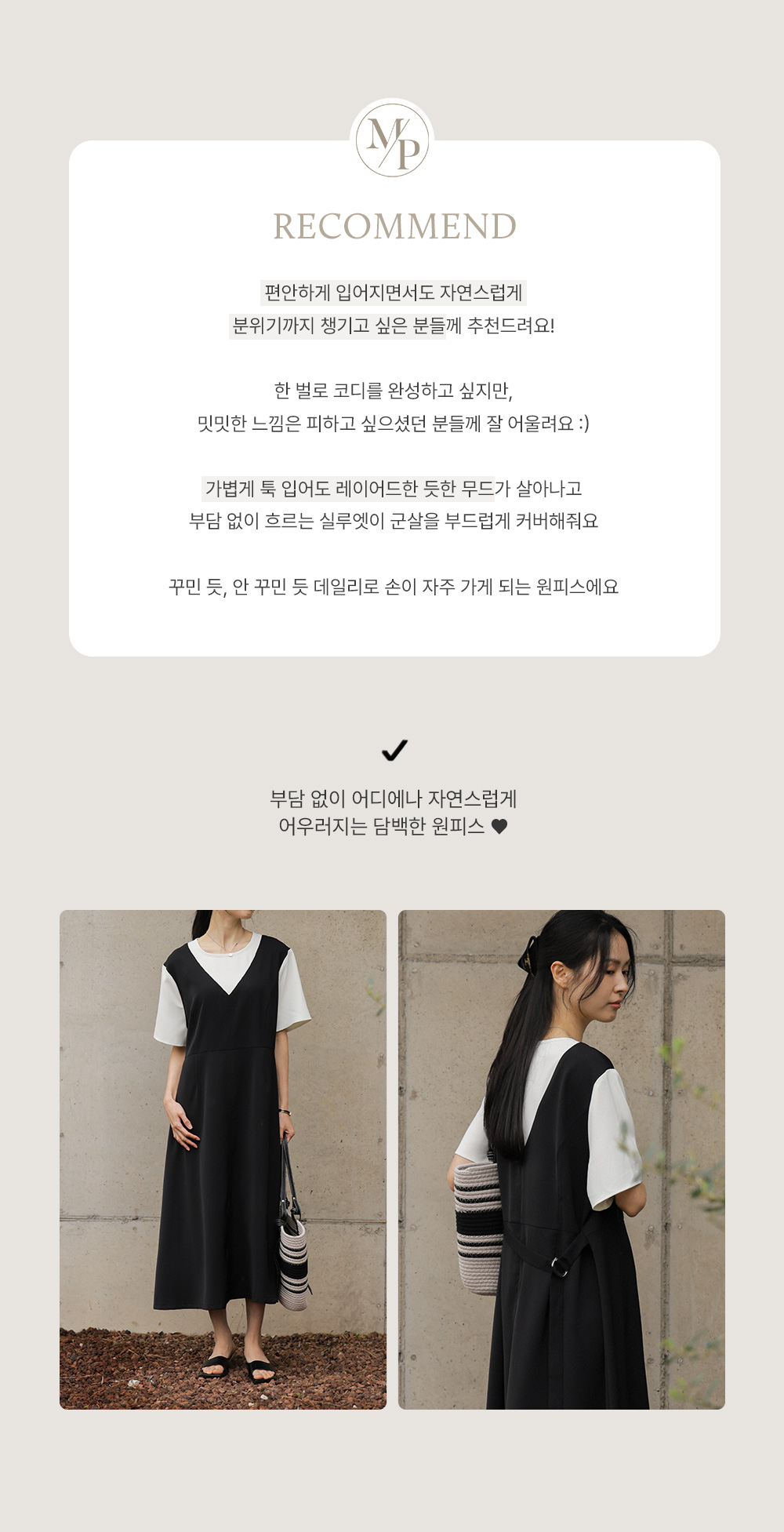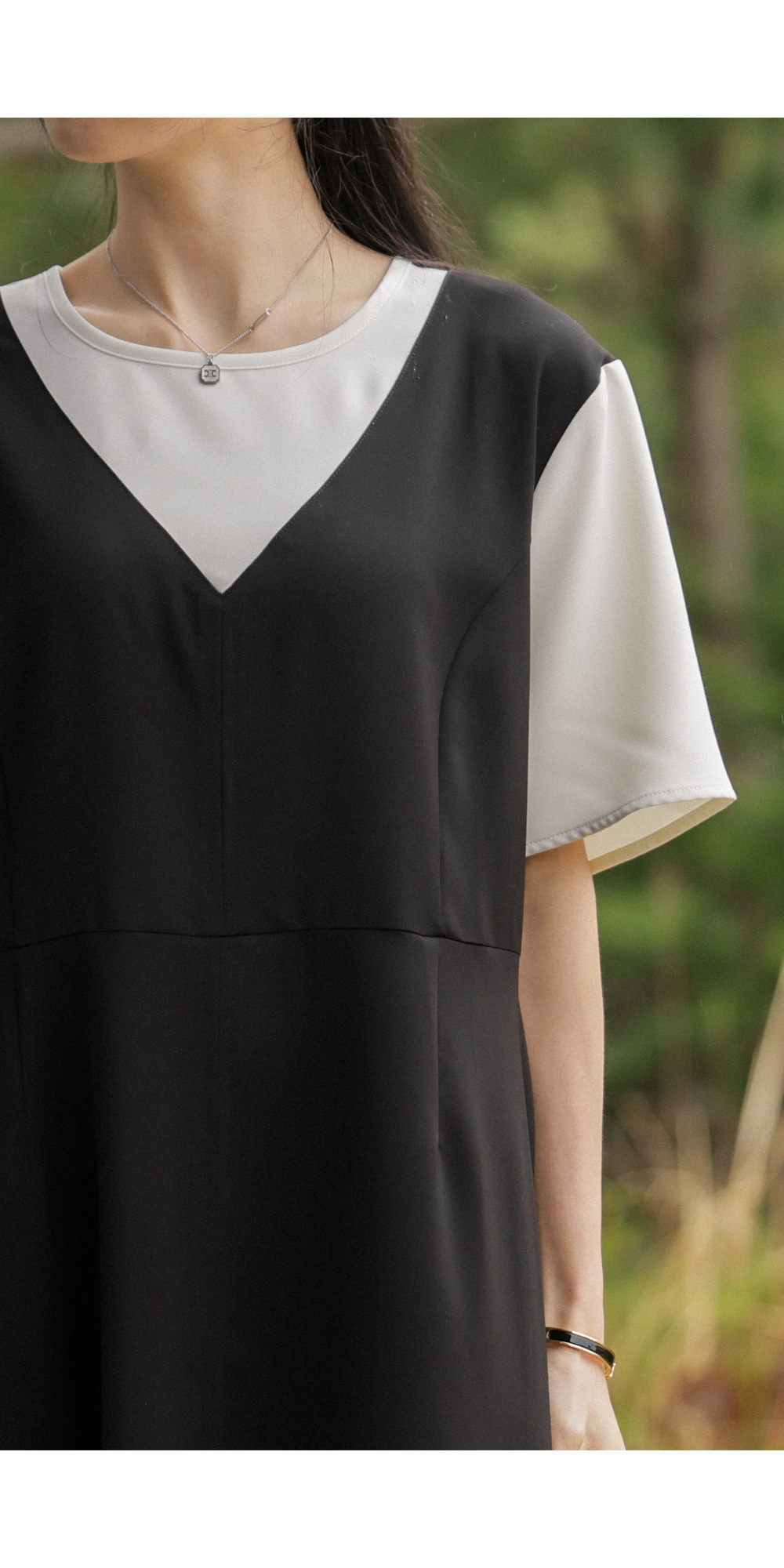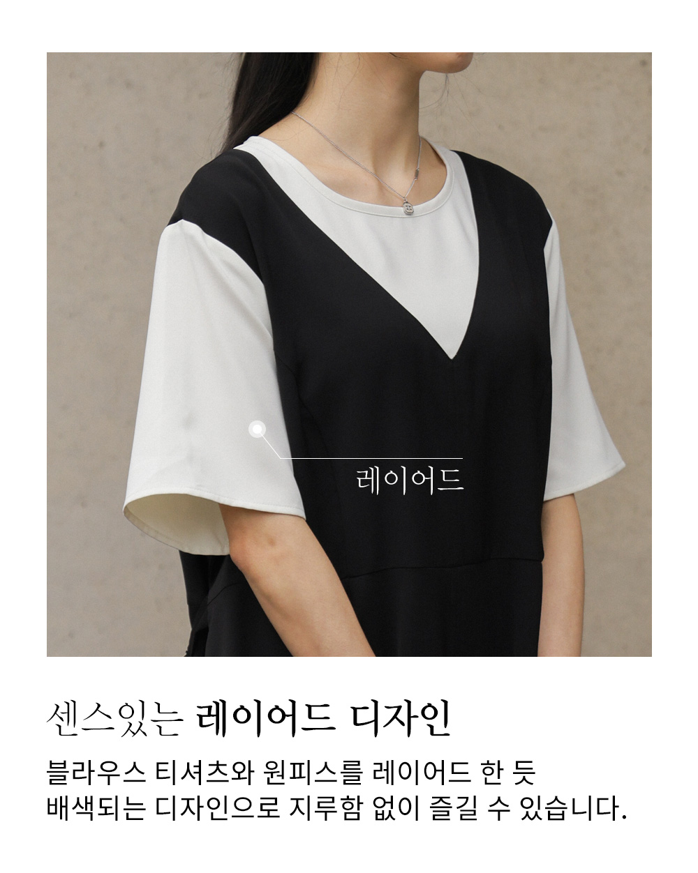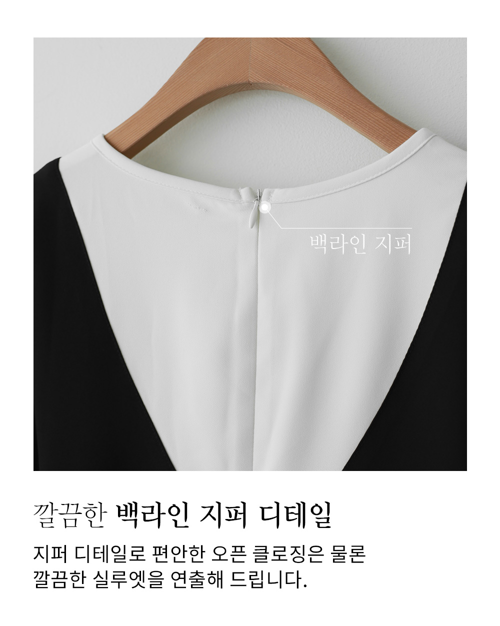깔끔하고 단정한 무드를 자아내는 원피스에요. 상반신의 화이트 배색 디자인이 시선을 위로 끌어올려 주어 전체적인 비율을 훨씬 좋아 보이게 만들어준답니다.