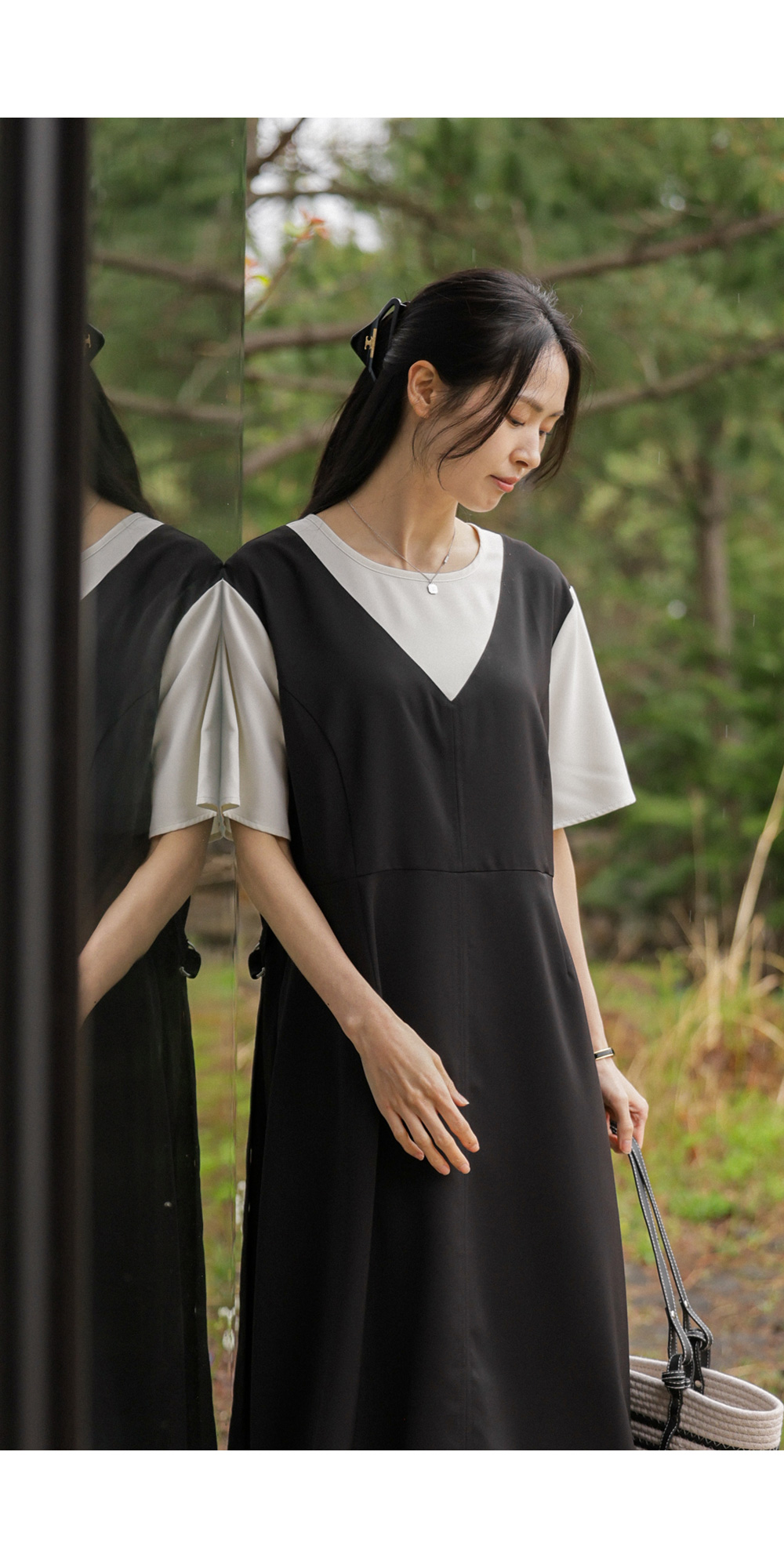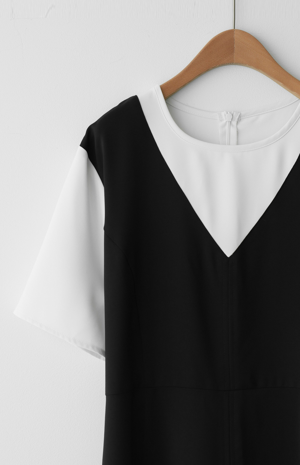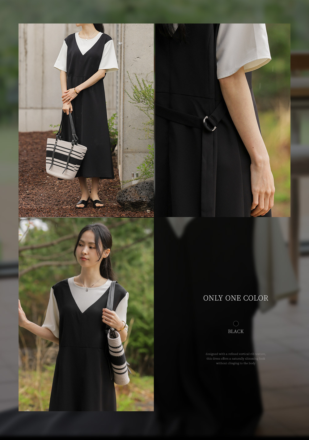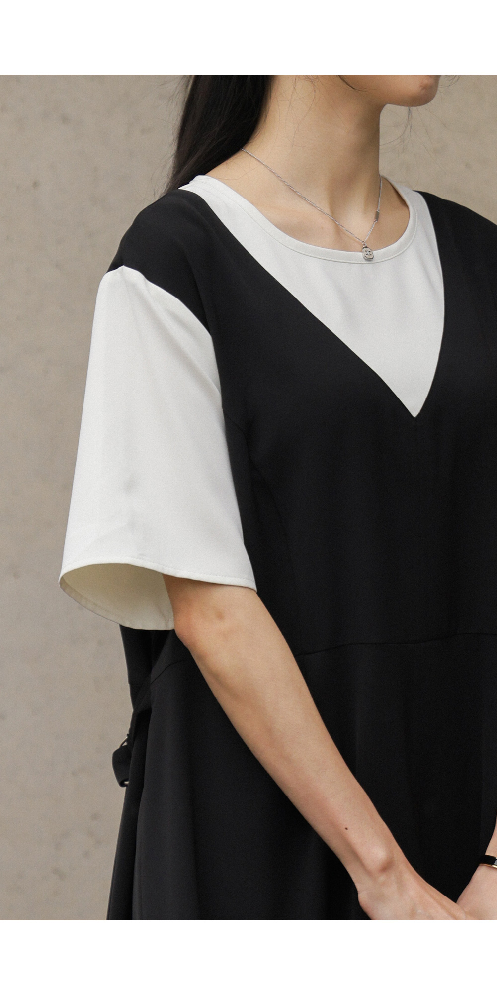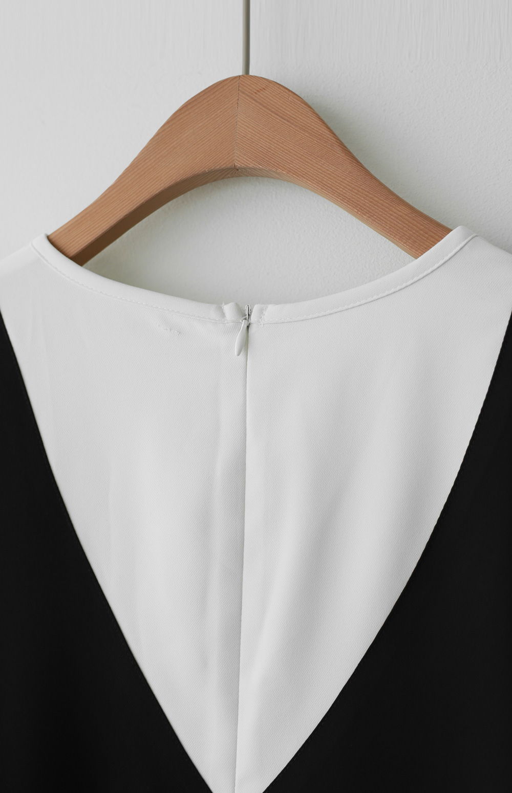 깔끔하고 단정한 무드를 자아내는 원피스에요. 상반신의 화이트 배색 디자인이 시선을 위로 끌어올려 주어 전체적인 비율을 훨씬 좋아 보이게 만들어준답니다.