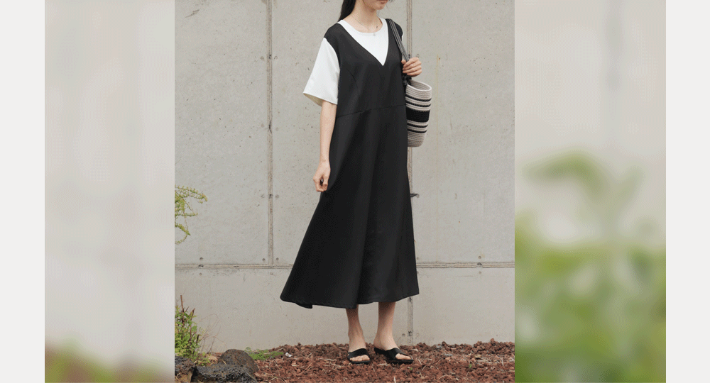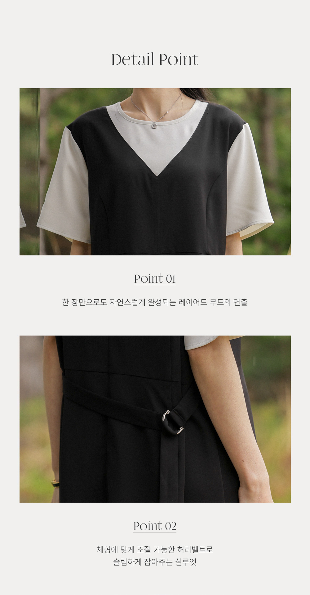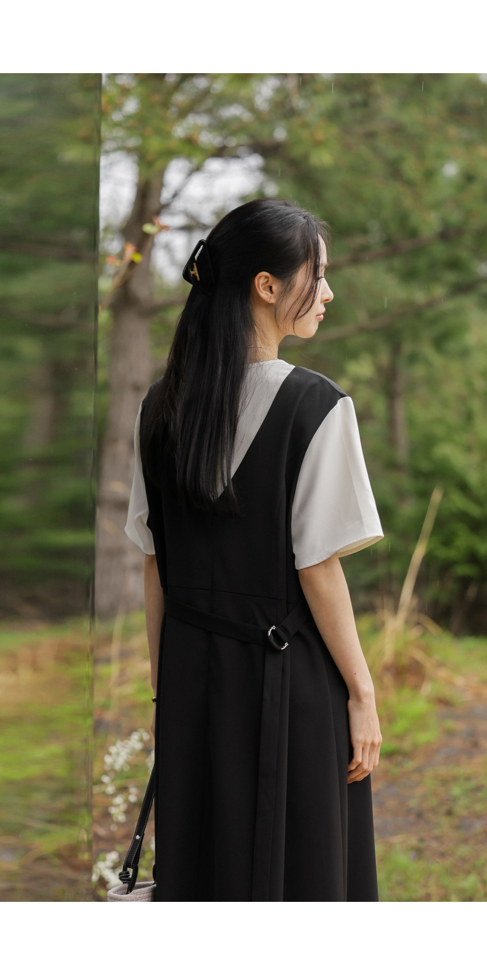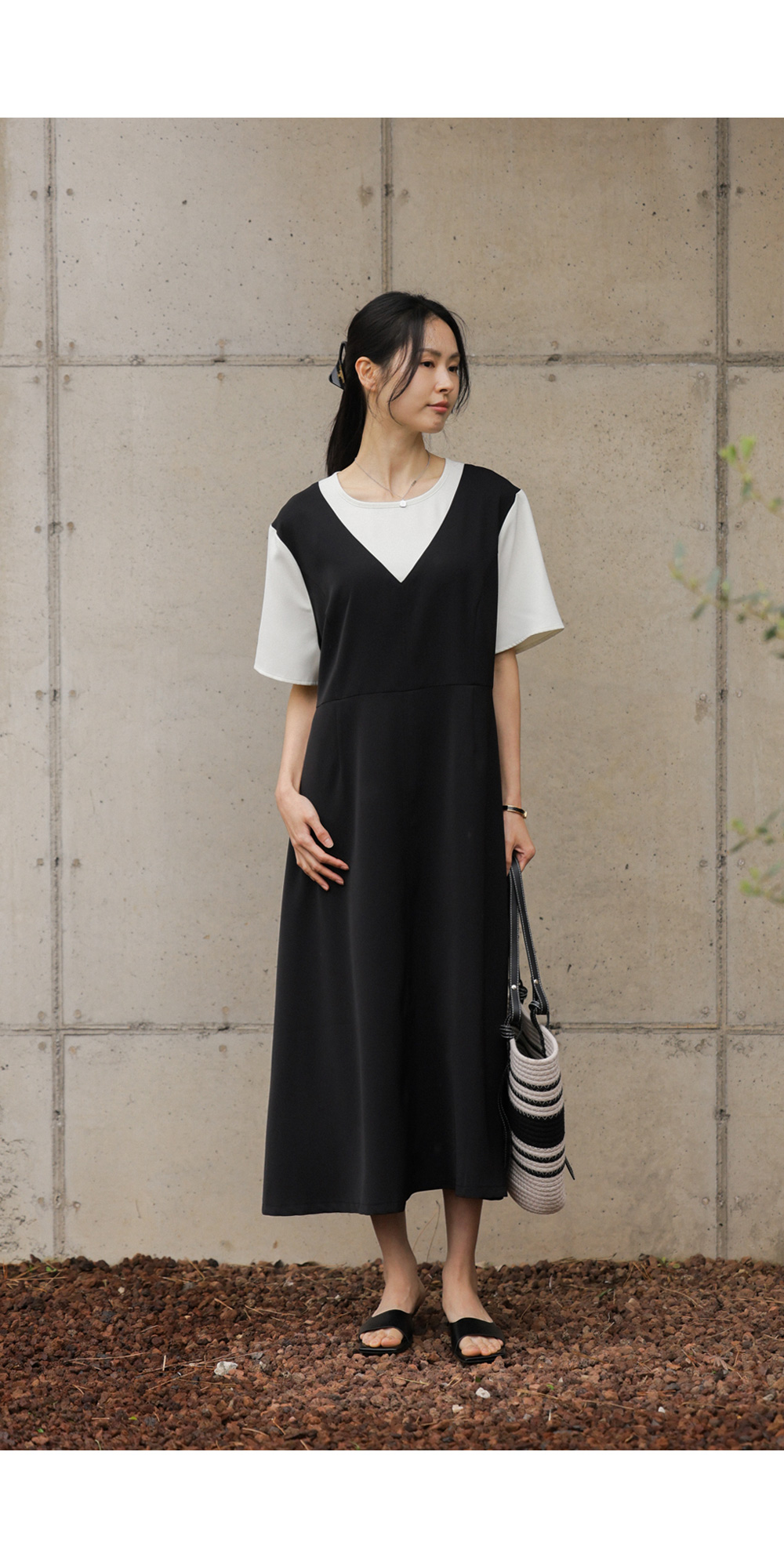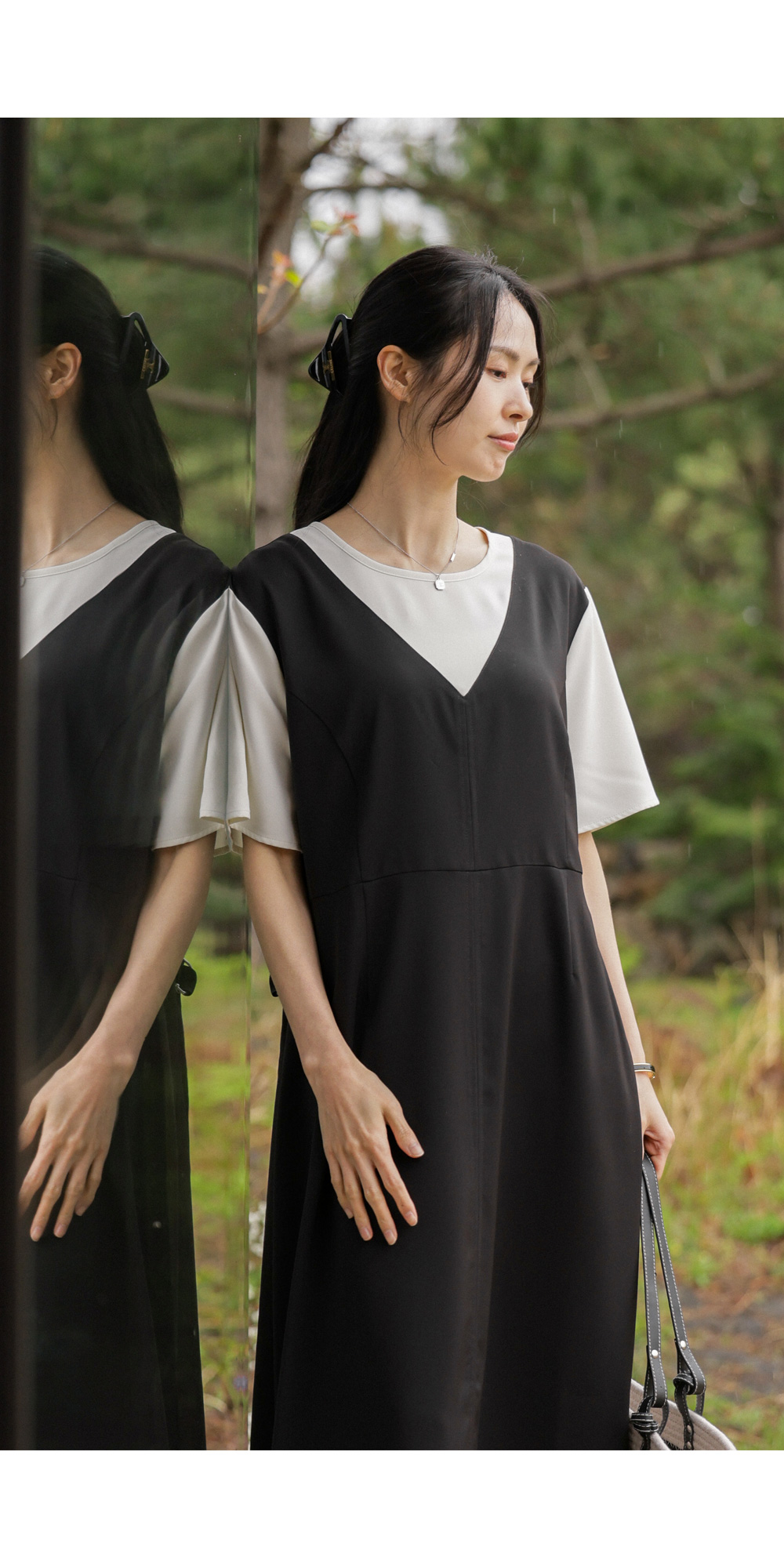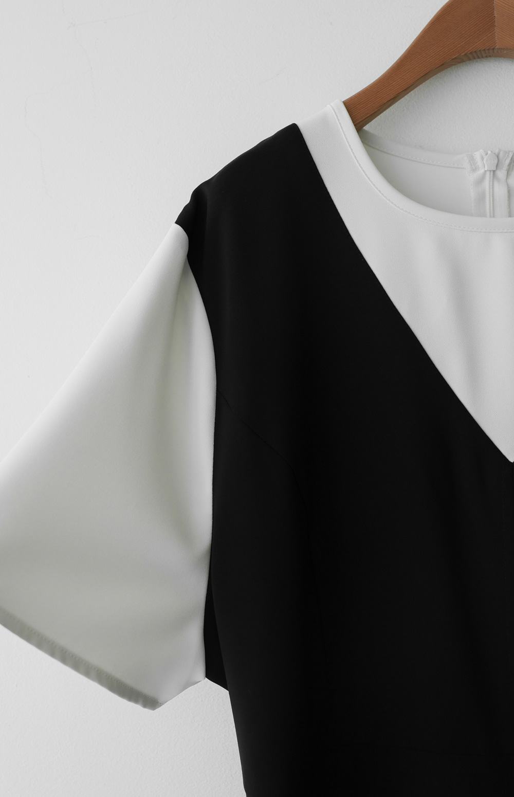깔끔하고 단정한 무드를 자아내는 원피스에요. 상반신의 화이트 배색 디자인이 시선을 위로 끌어올려 주어 전체적인 비율을 훨씬 좋아 보이게 만들어준답니다.