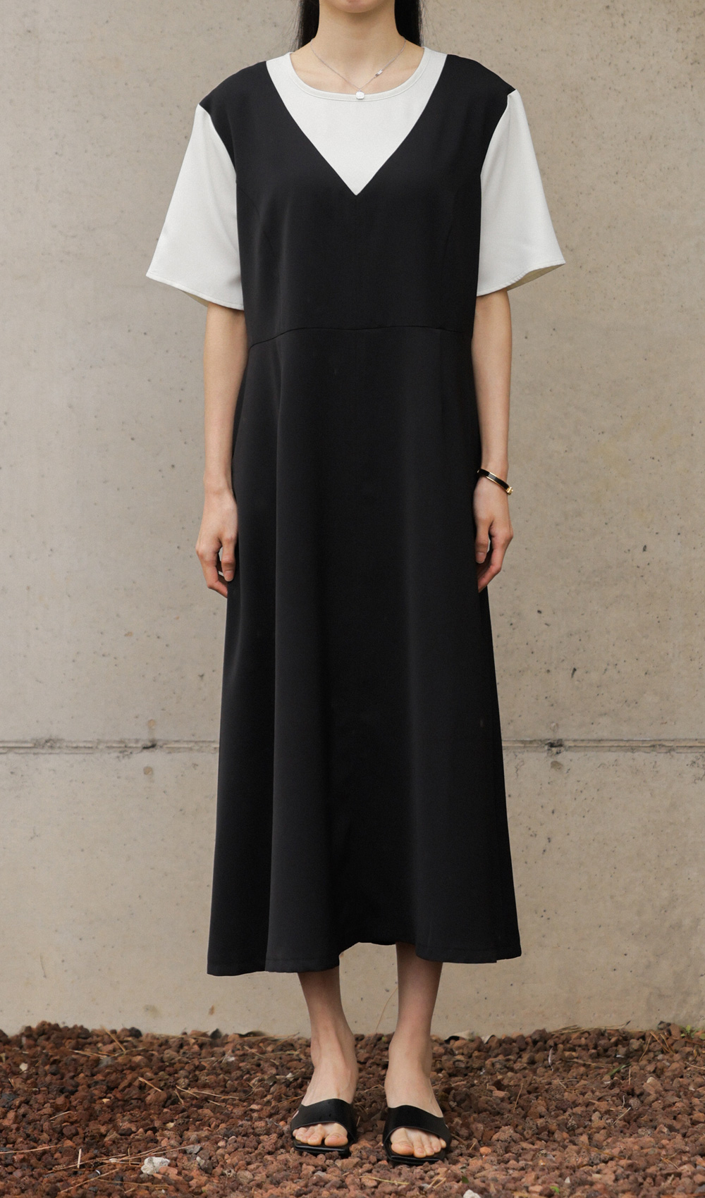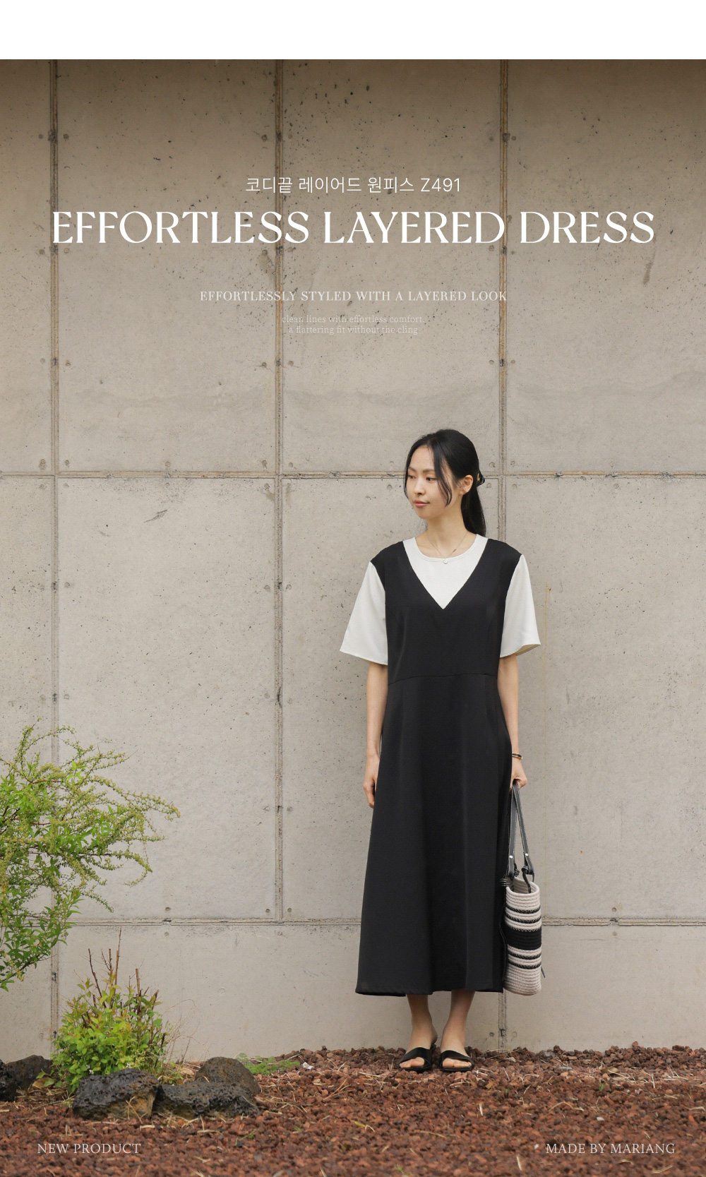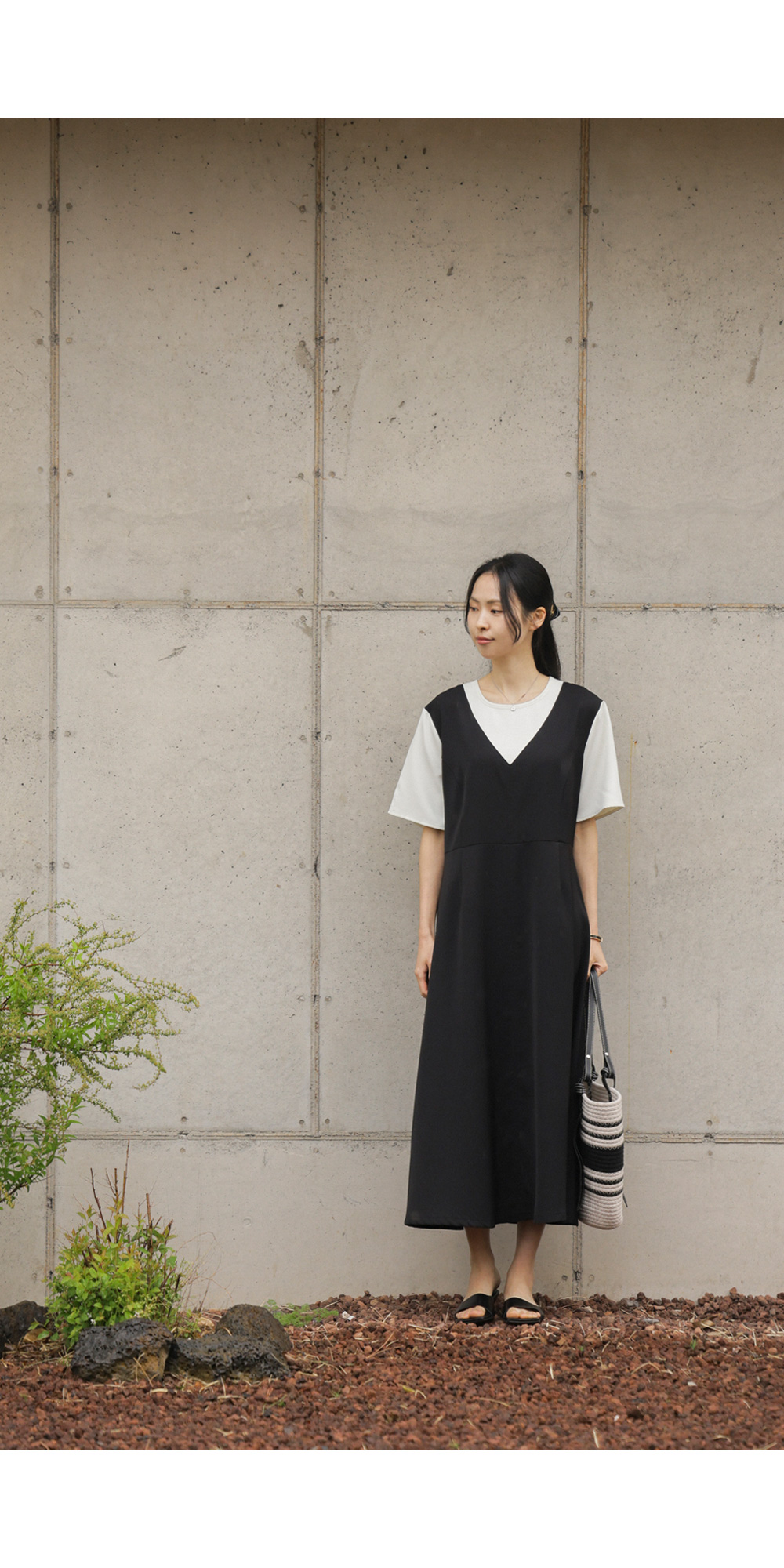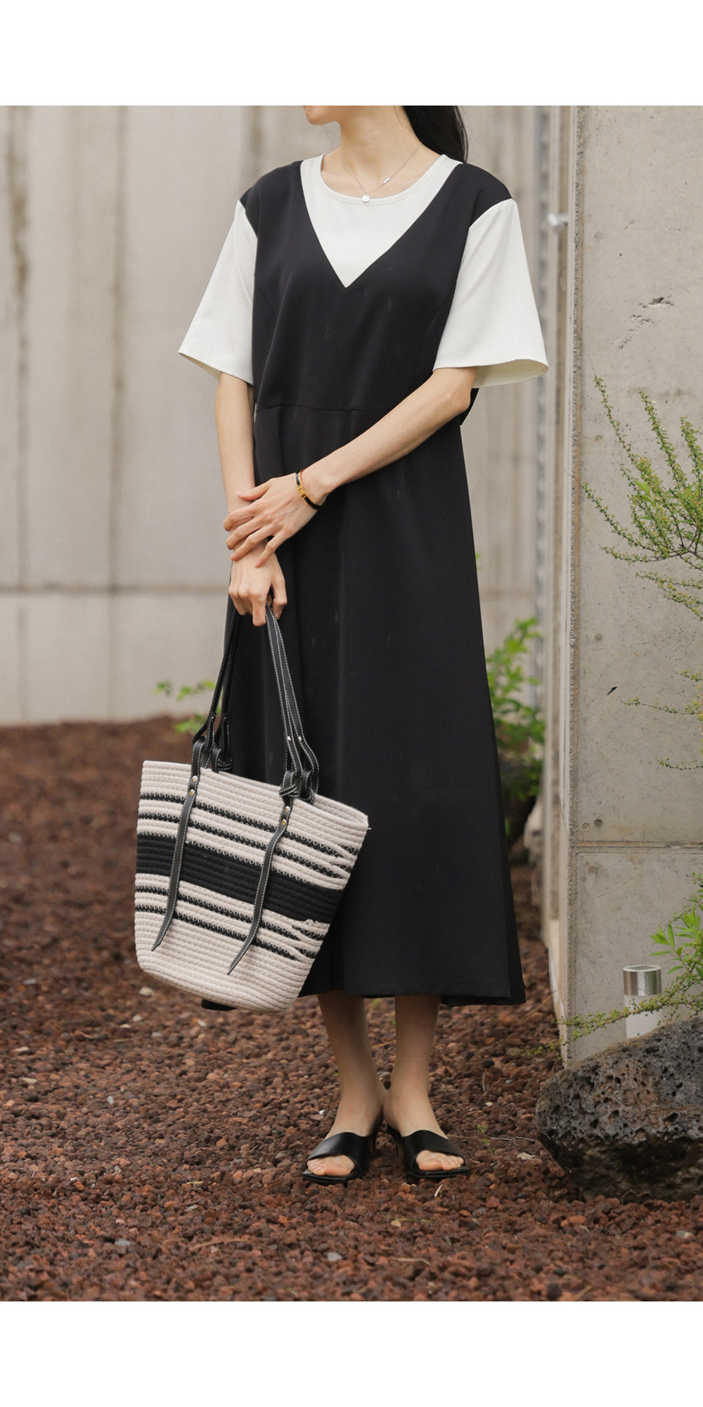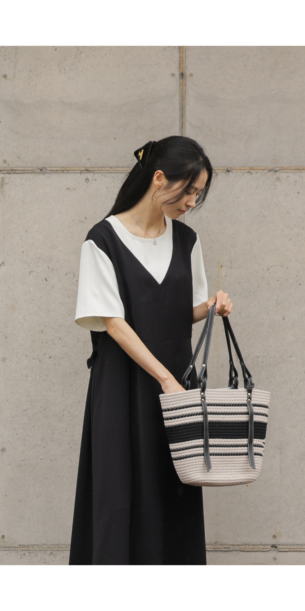 깔끔하고 단정한 무드를 자아내는 원피스에요. 상반신의 화이트 배색 디자인이 시선을 위로 끌어올려 주어 전체적인 비율을 훨씬 좋아 보이게 만들어준답니다.