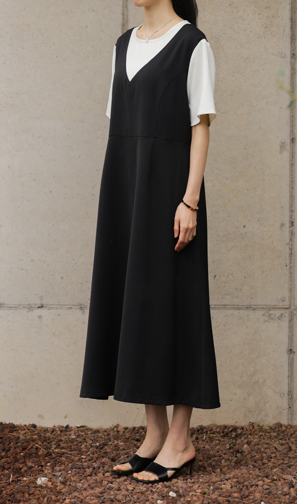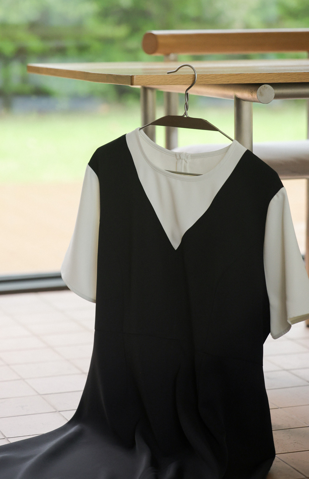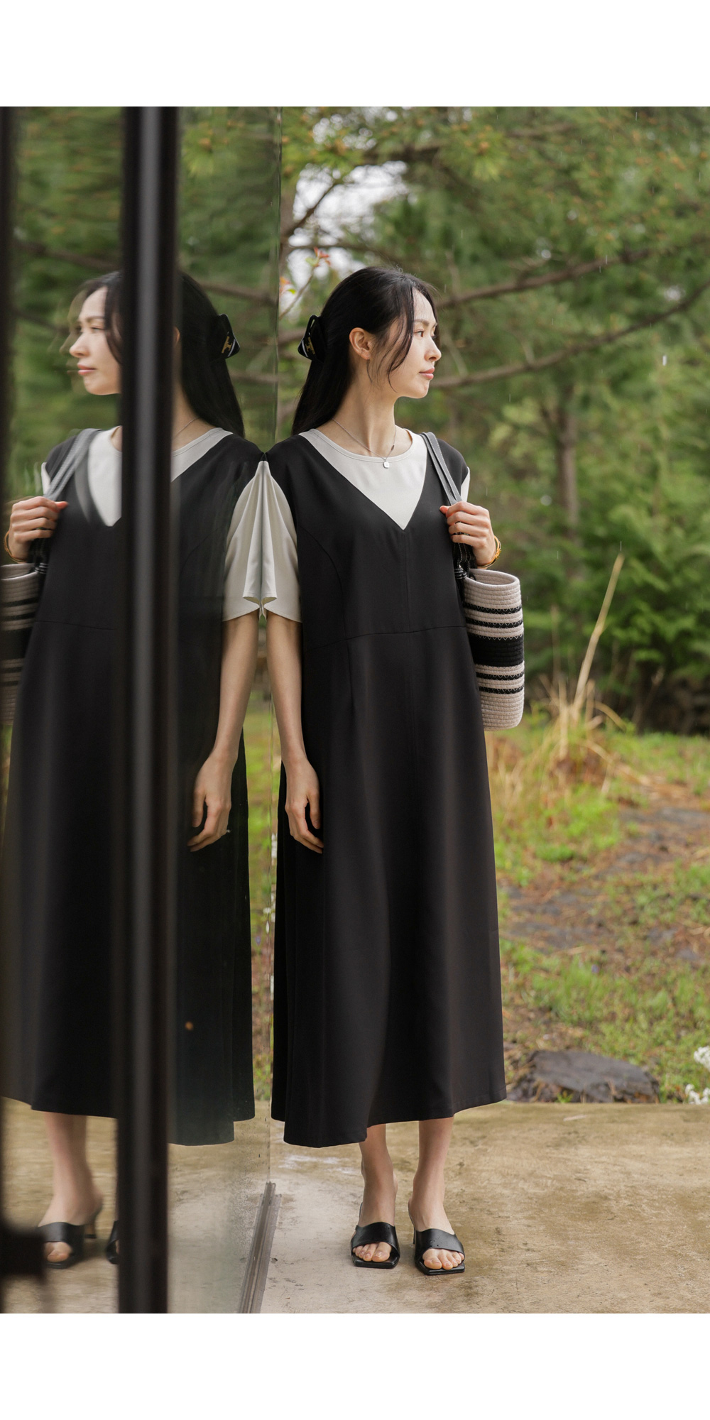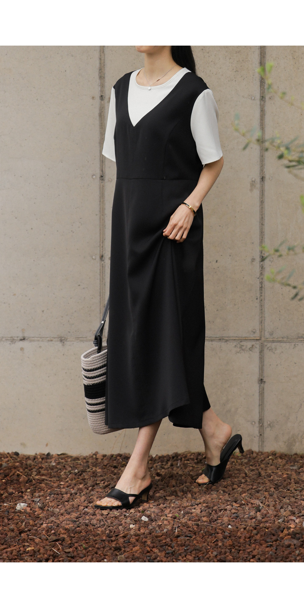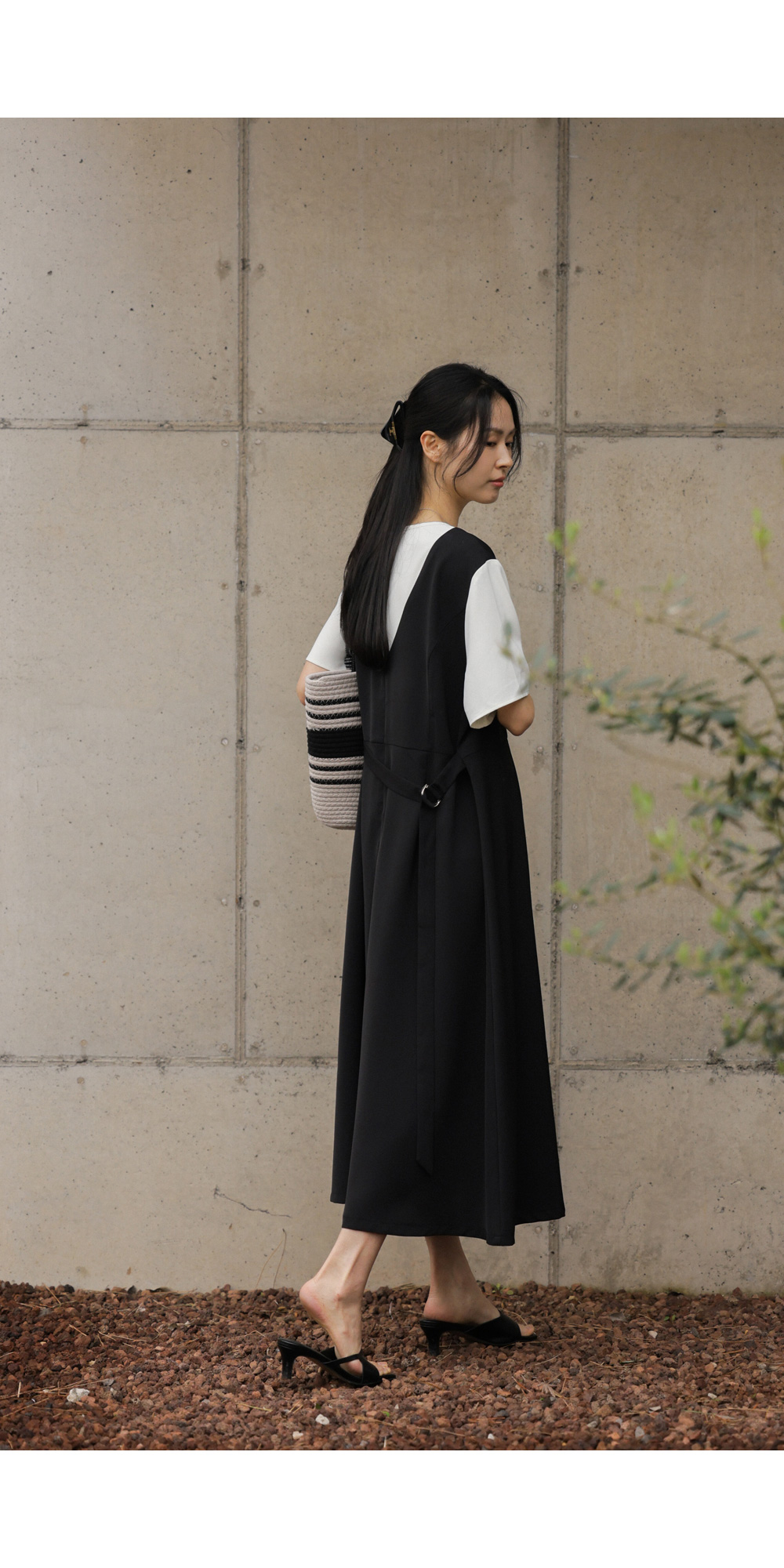깔끔하고 단정한 무드를 자아내는 원피스에요. 상반신의 화이트 배색 디자인이 시선을 위로 끌어올려 주어 전체적인 비율을 훨씬 좋아 보이게 만들어준답니다.