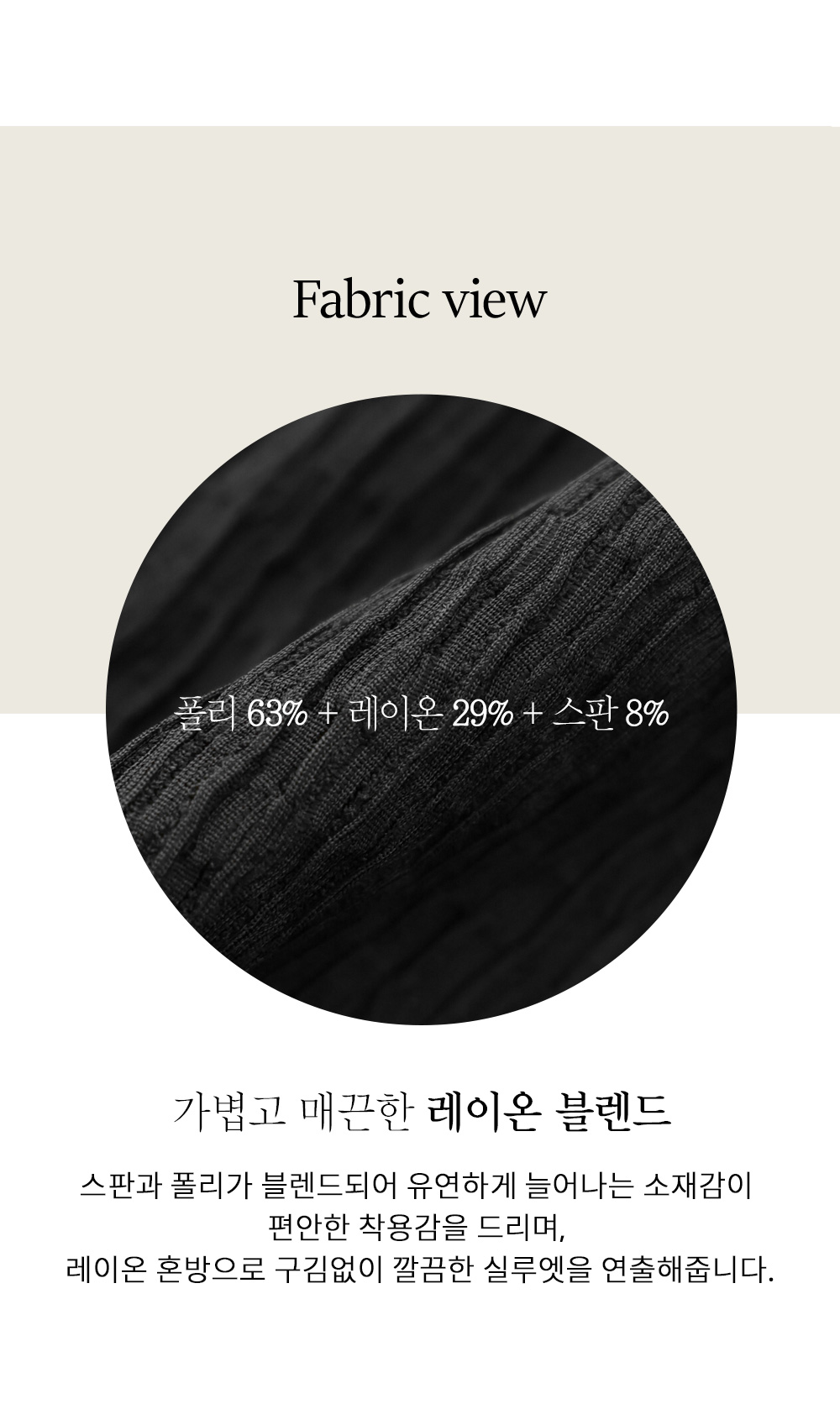 레이온이 혼방되어 피부에 닿는 느낌이 굉장히 소프트하고 매끄러워요. 여기에 탄탄한 폴리 소재와 적절한 스판이 가미되어 형태 변형이 적으면서도 신체의 움직임에 따라 유연하게 늘어나는 뛰어난 텐션감을 자랑한답니다. 원단 표면의 입체적인 굴곡은 구김을 최소화해 주어 장시간 착용 후에도 깔끔한 컨디션을 유지하기 아주 좋은 소재예요.