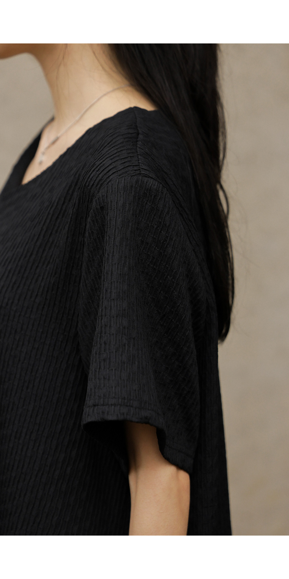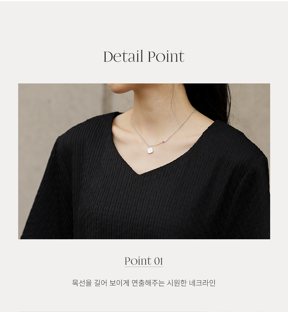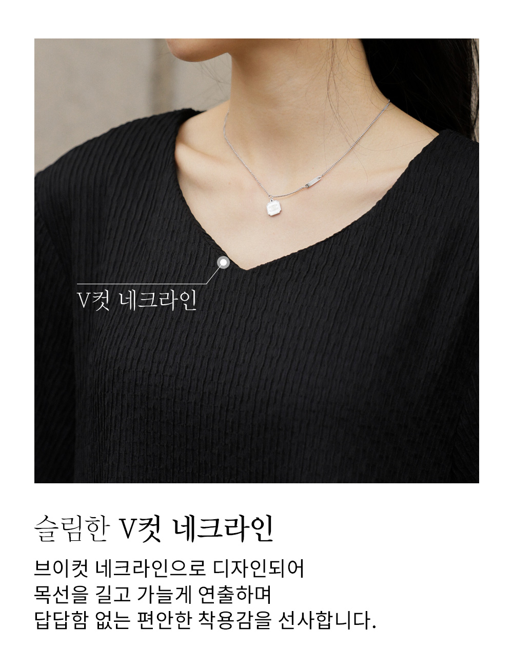 답답하지 않게 트인 V넥 라인은 얼굴형을 한결 슬림해 보이게 만들어주며, 어깨 라인부터 부드럽게 이어지는 소매는 군더더기 없이 팔뚝을 자연스럽게 가려주는 길이라 더욱 만족스러우실 거예요.