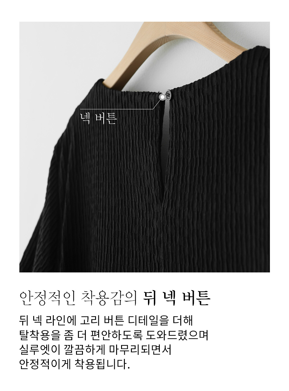 뒷목 부분에는 탈착용이 간편하도록 단추 디테일을 더해 실용성을 높였구요, 원단 자체의 세로 결이 시각적으로 체형을 슬림해 보이는 효과를 주어 실제보다 훨씬 날씬해 보이는 실루엣을 완성해 준답니다.