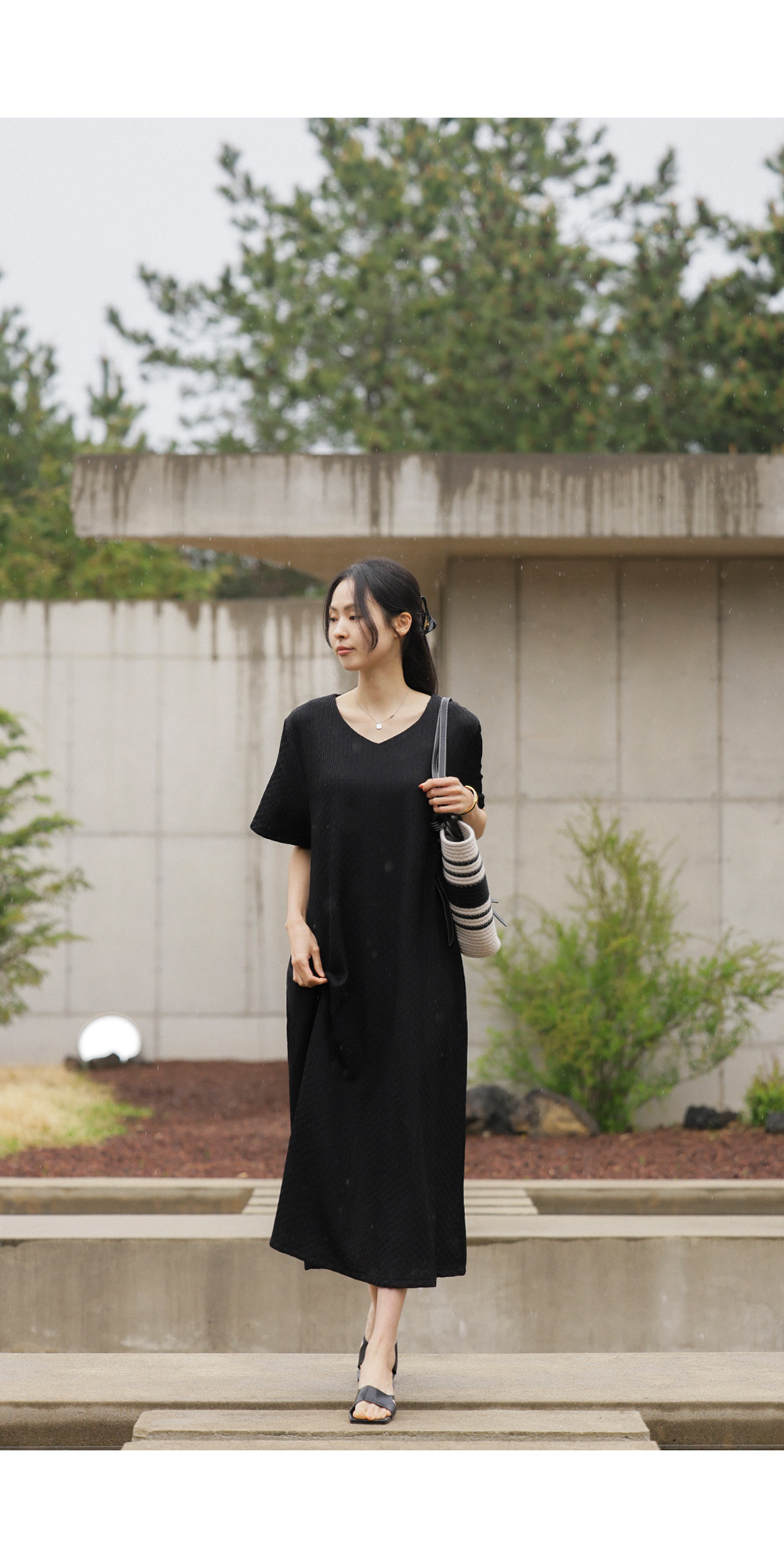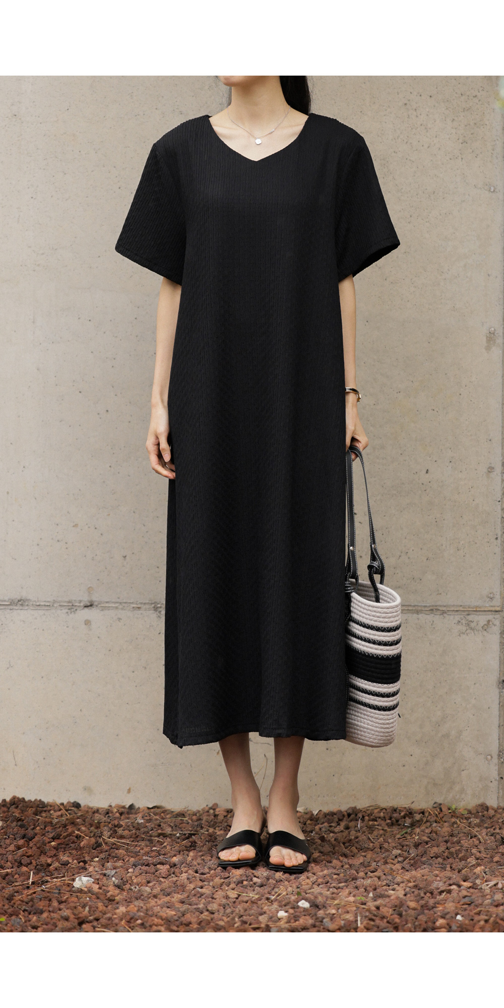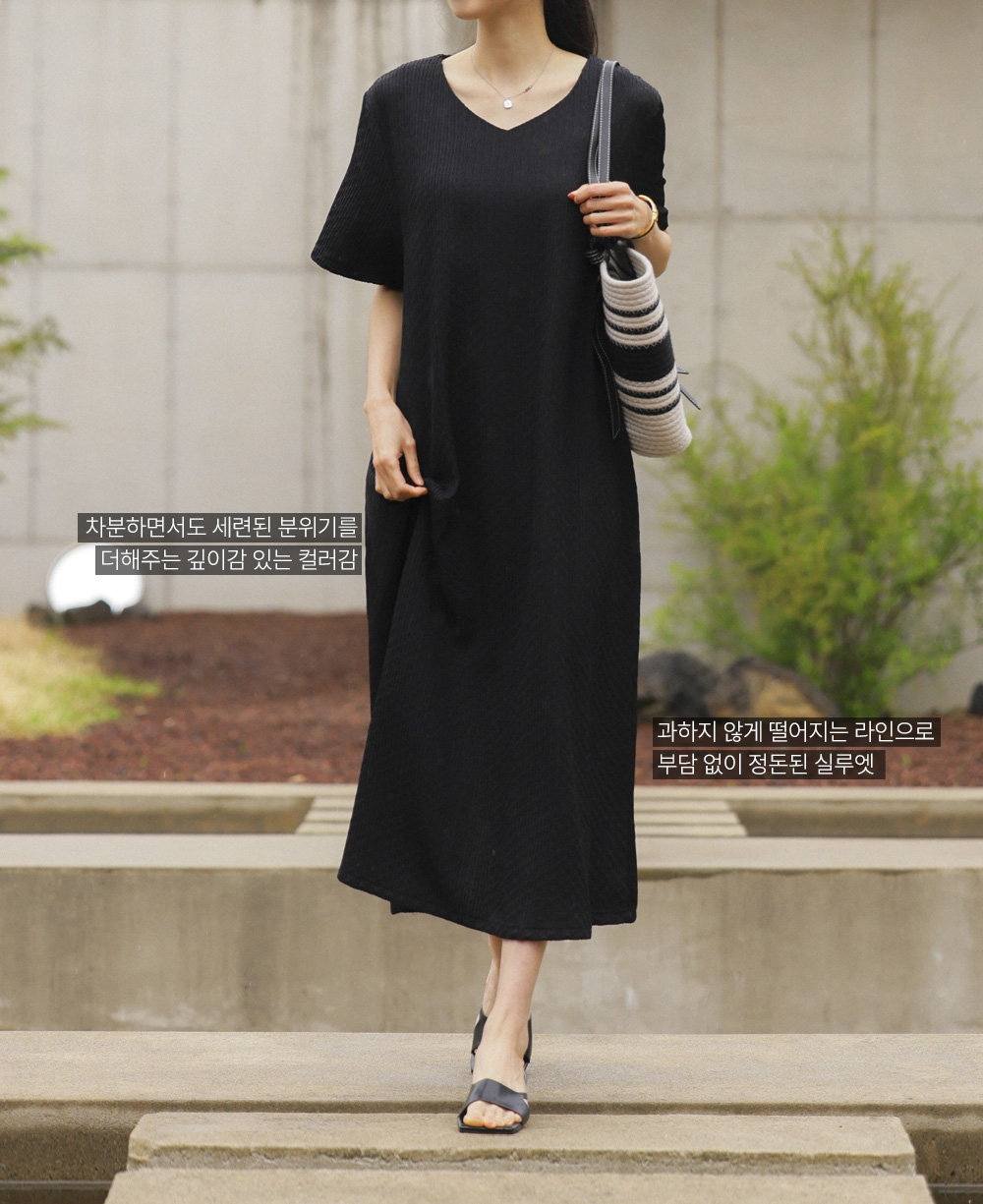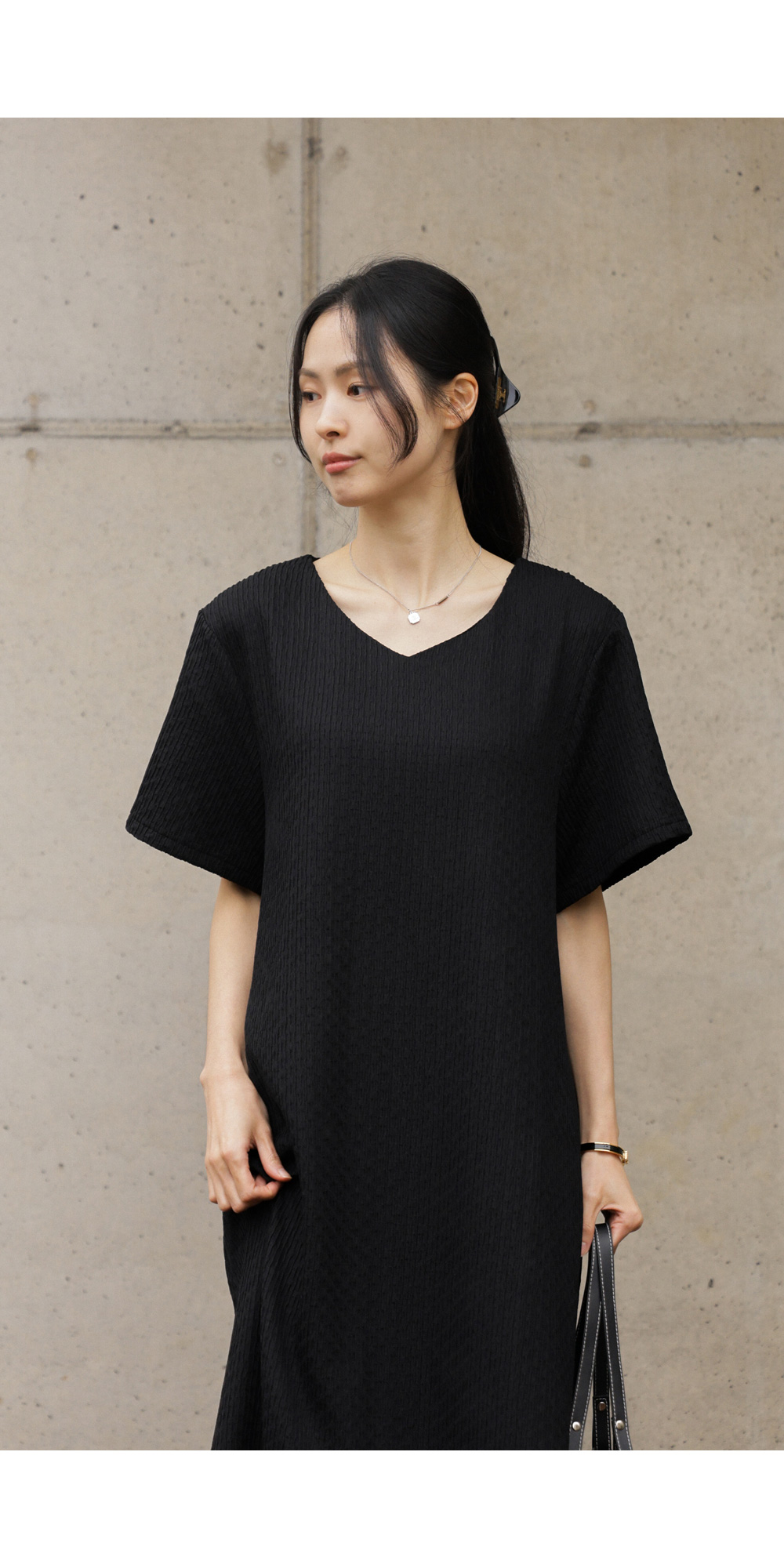 단독만으로 충분한 존재감을 발휘하는 제작 원피스 소개드려요. 몸에 달라붙지 않는 입체적인 텍스처 덕분에 단독으로 입어도 밋밋함 없이 세련된 무드가 느껴지구요, 적당한 깊이의 V넥이 목선을 길어 보이게 연출해 준답니다.