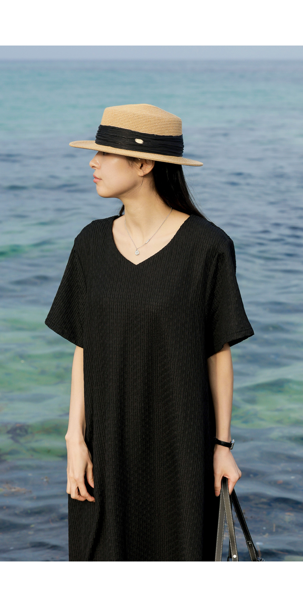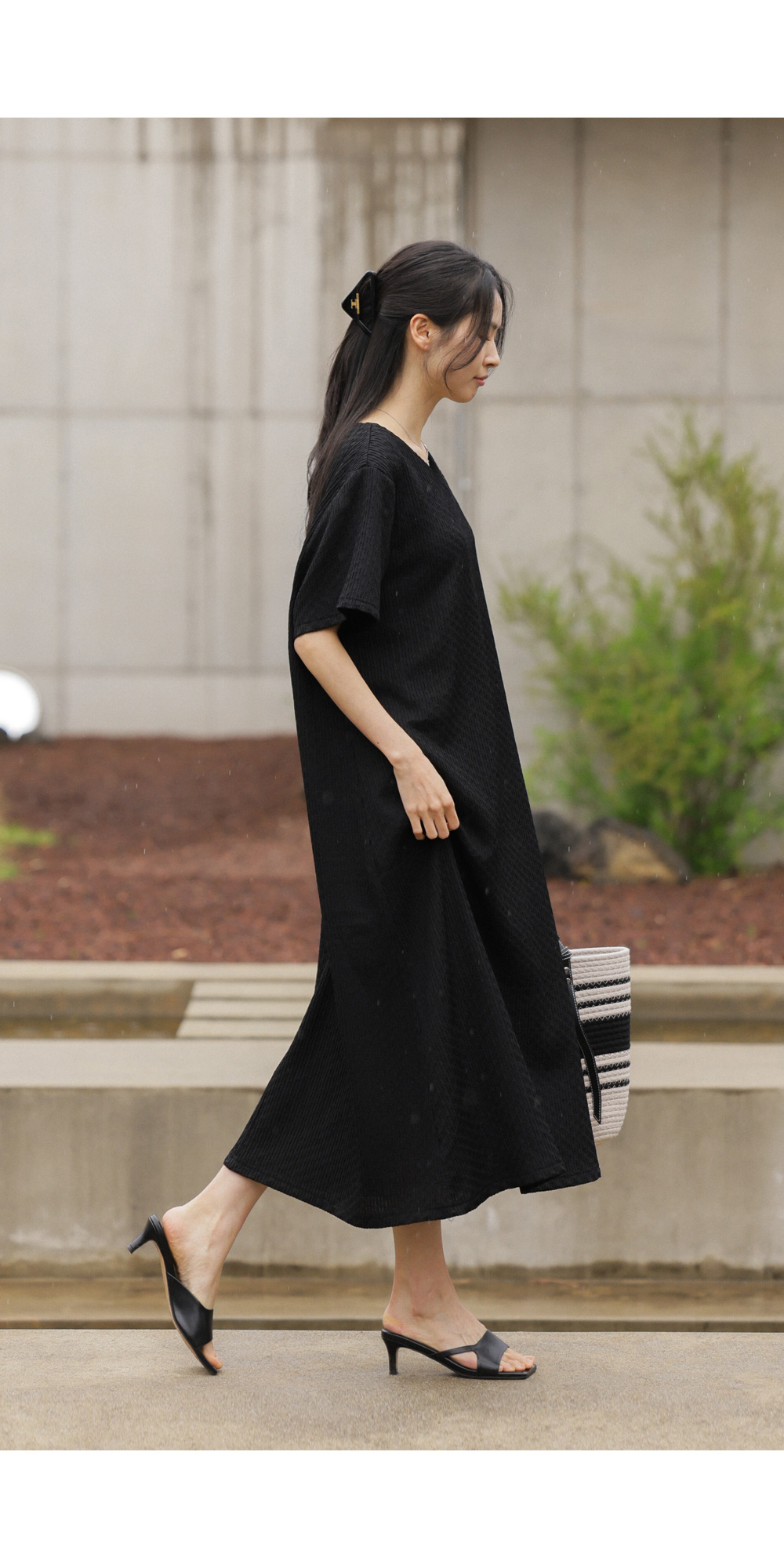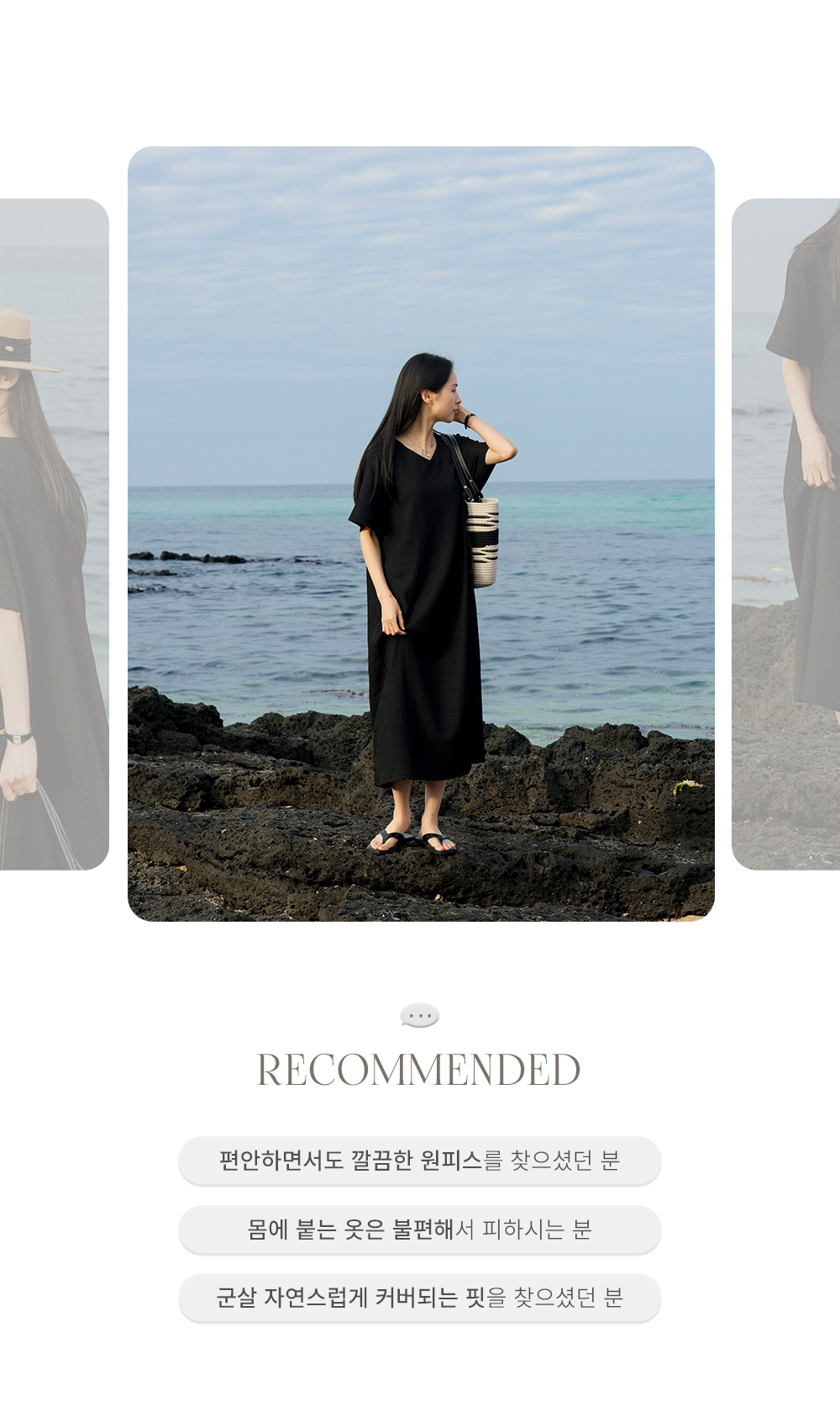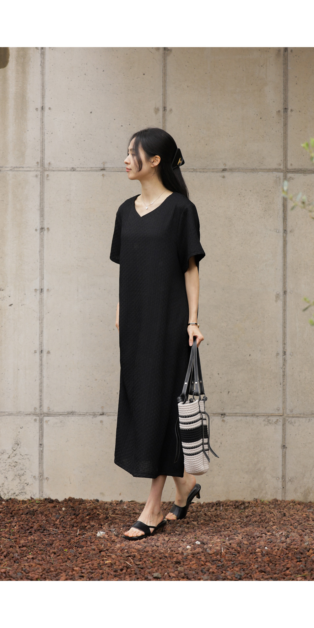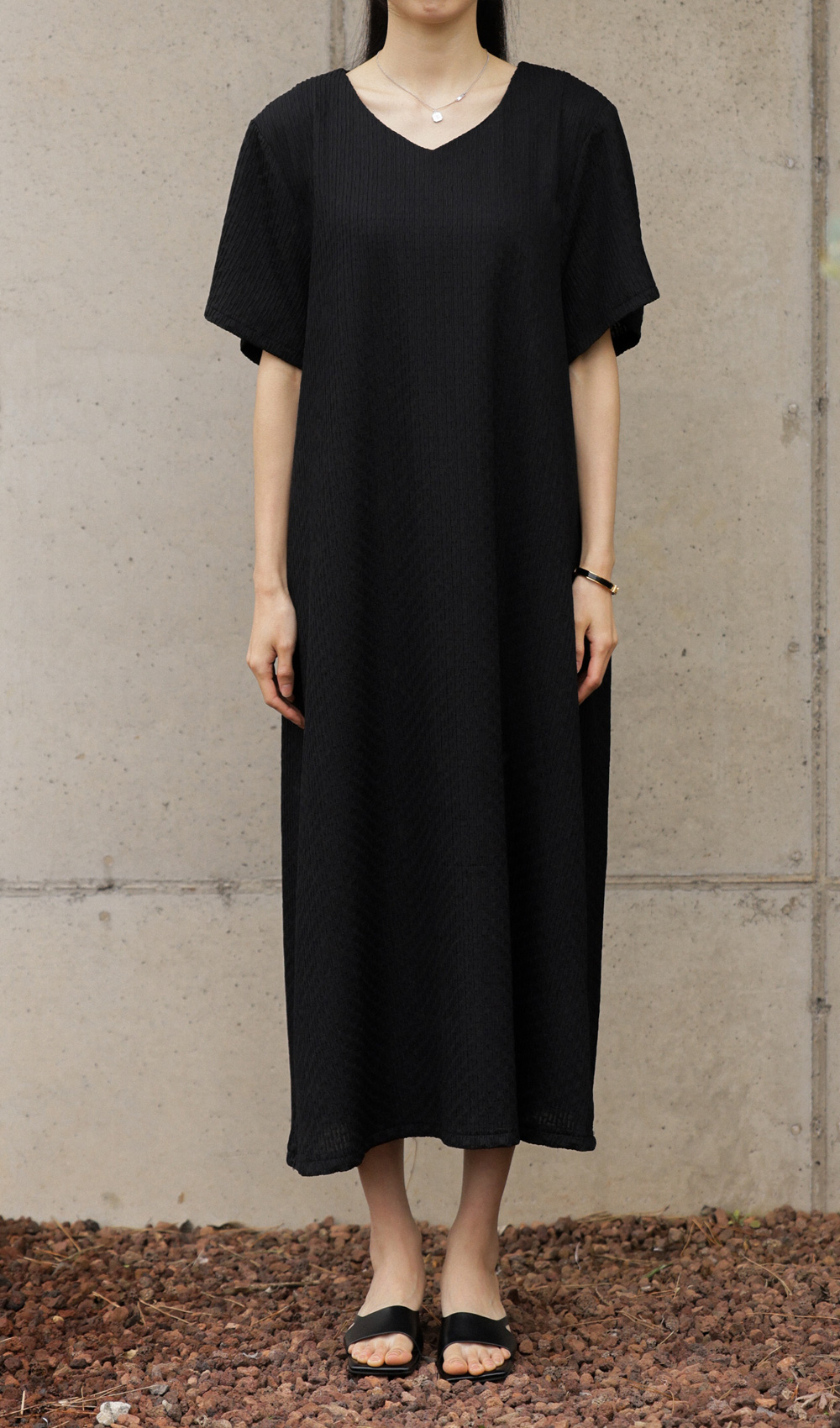 단독만으로 충분한 존재감을 발휘하는 제작 원피스 소개드려요. 몸에 달라붙지 않는 입체적인 텍스처 덕분에 단독으로 입어도 밋밋함 없이 세련된 무드가 느껴지구요, 적당한 깊이의 V넥이 목선을 길어 보이게 연출해 준답니다.