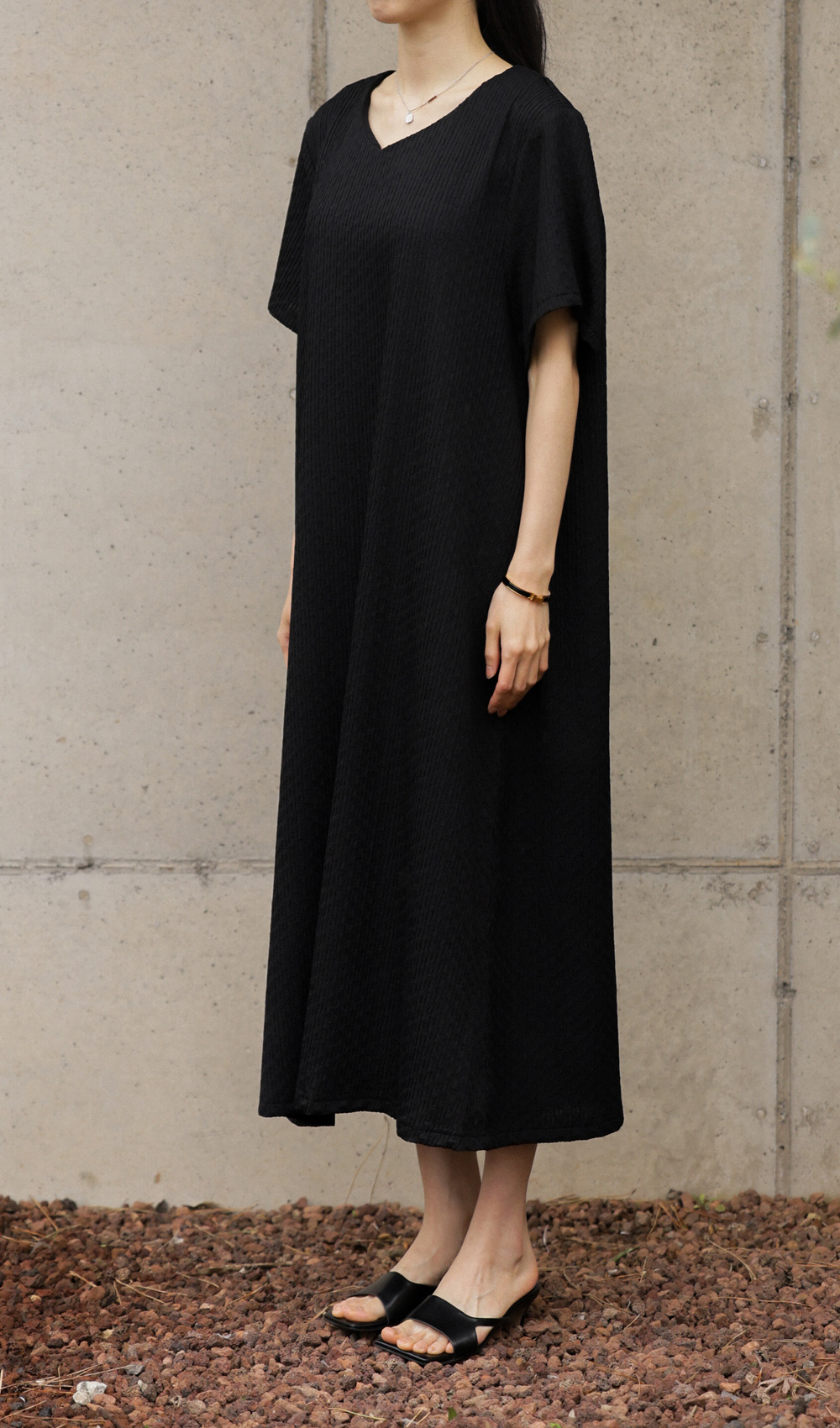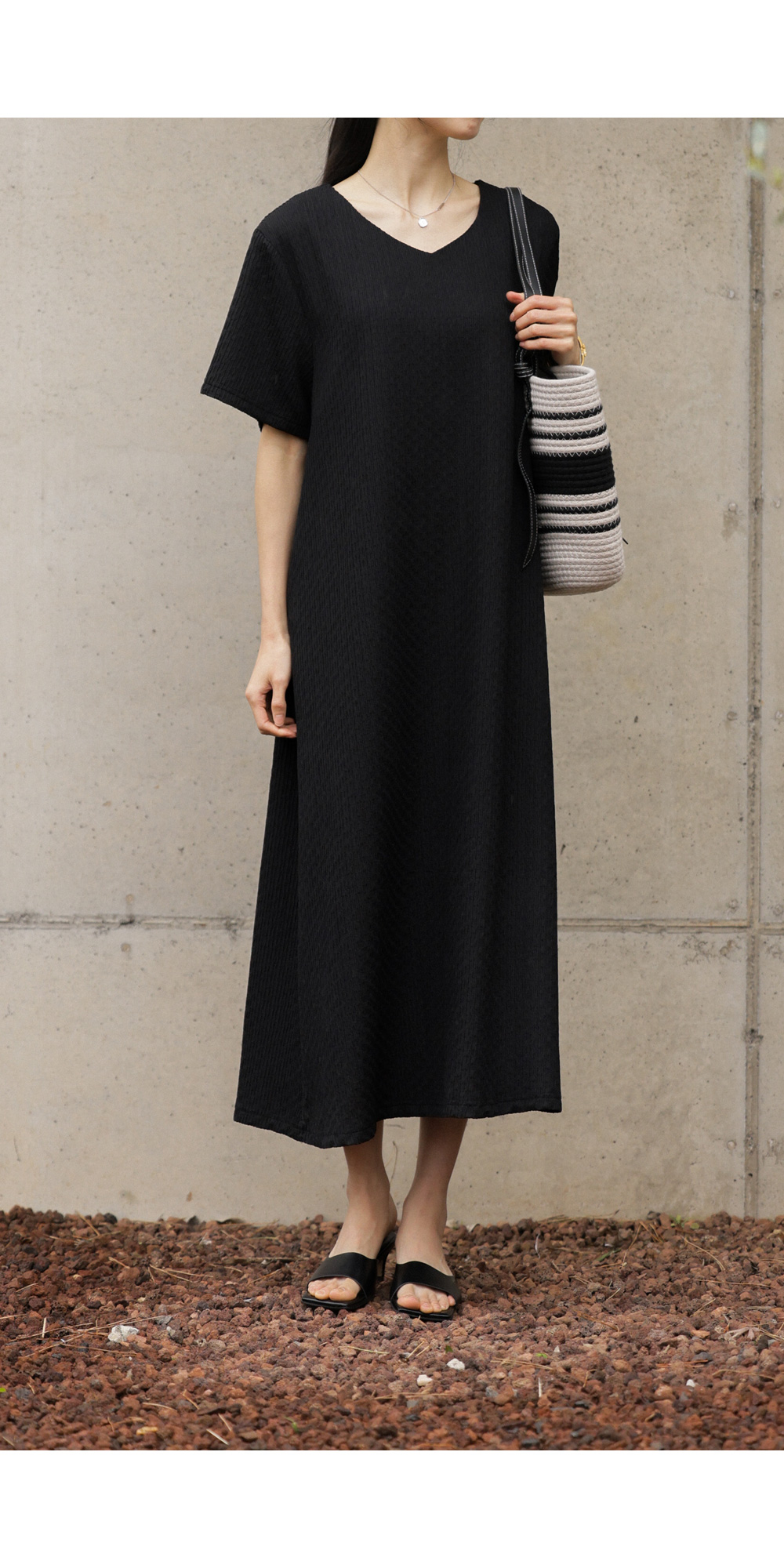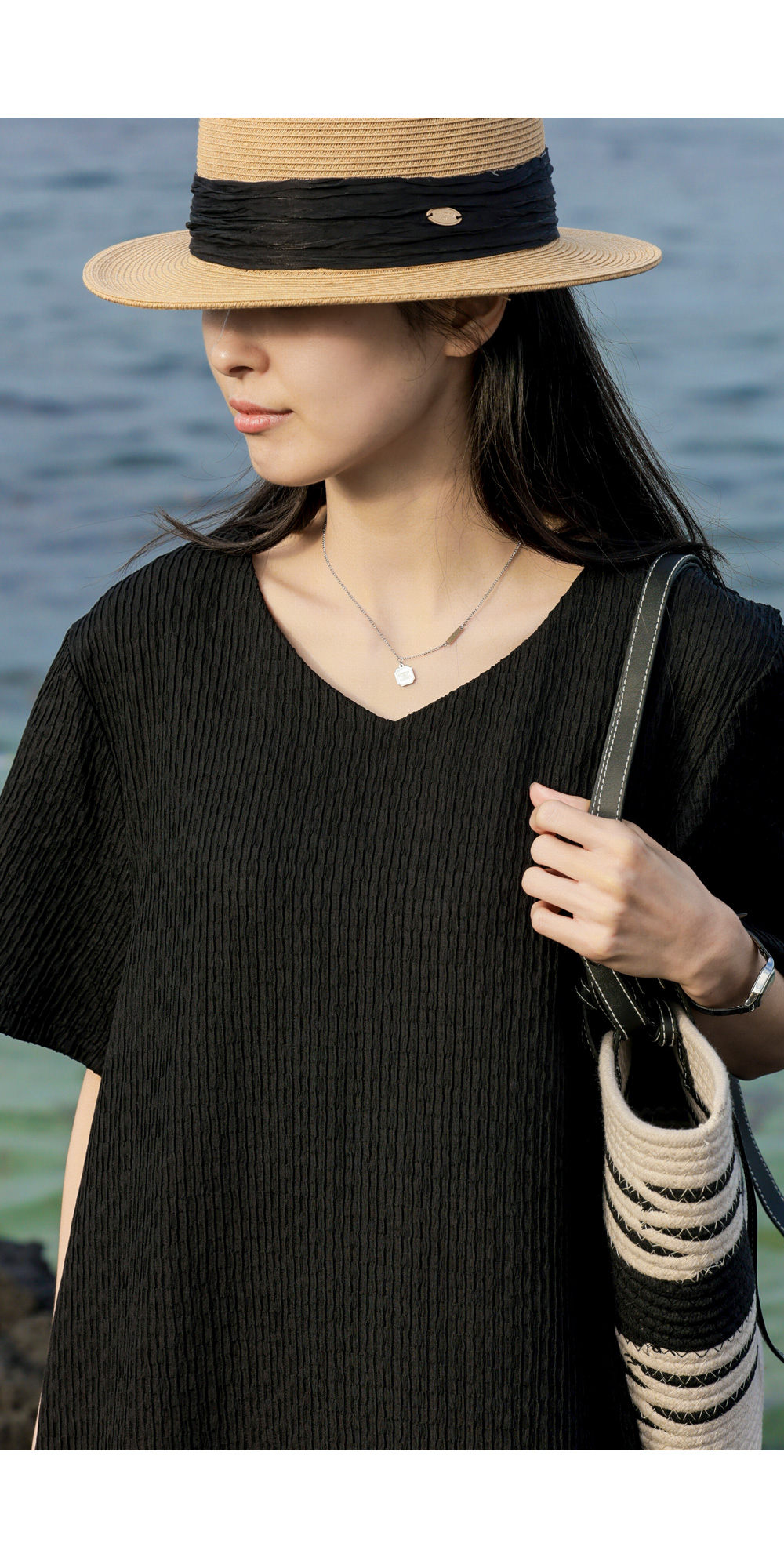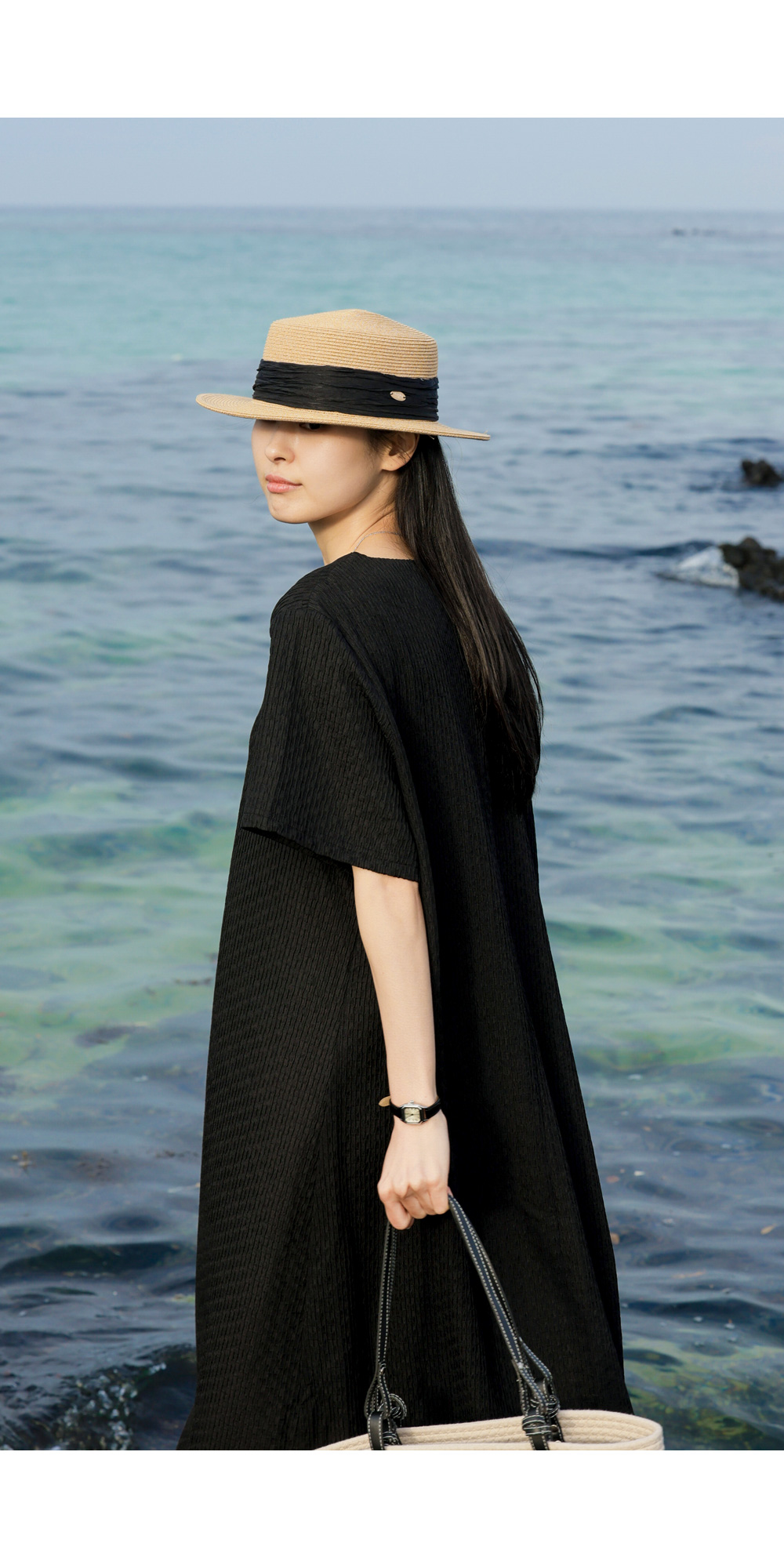 단독만으로 충분한 존재감을 발휘하는 제작 원피스 소개드려요. 몸에 달라붙지 않는 입체적인 텍스처 덕분에 단독으로 입어도 밋밋함 없이 세련된 무드가 느껴지구요, 적당한 깊이의 V넥이 목선을 길어 보이게 연출해 준답니다.