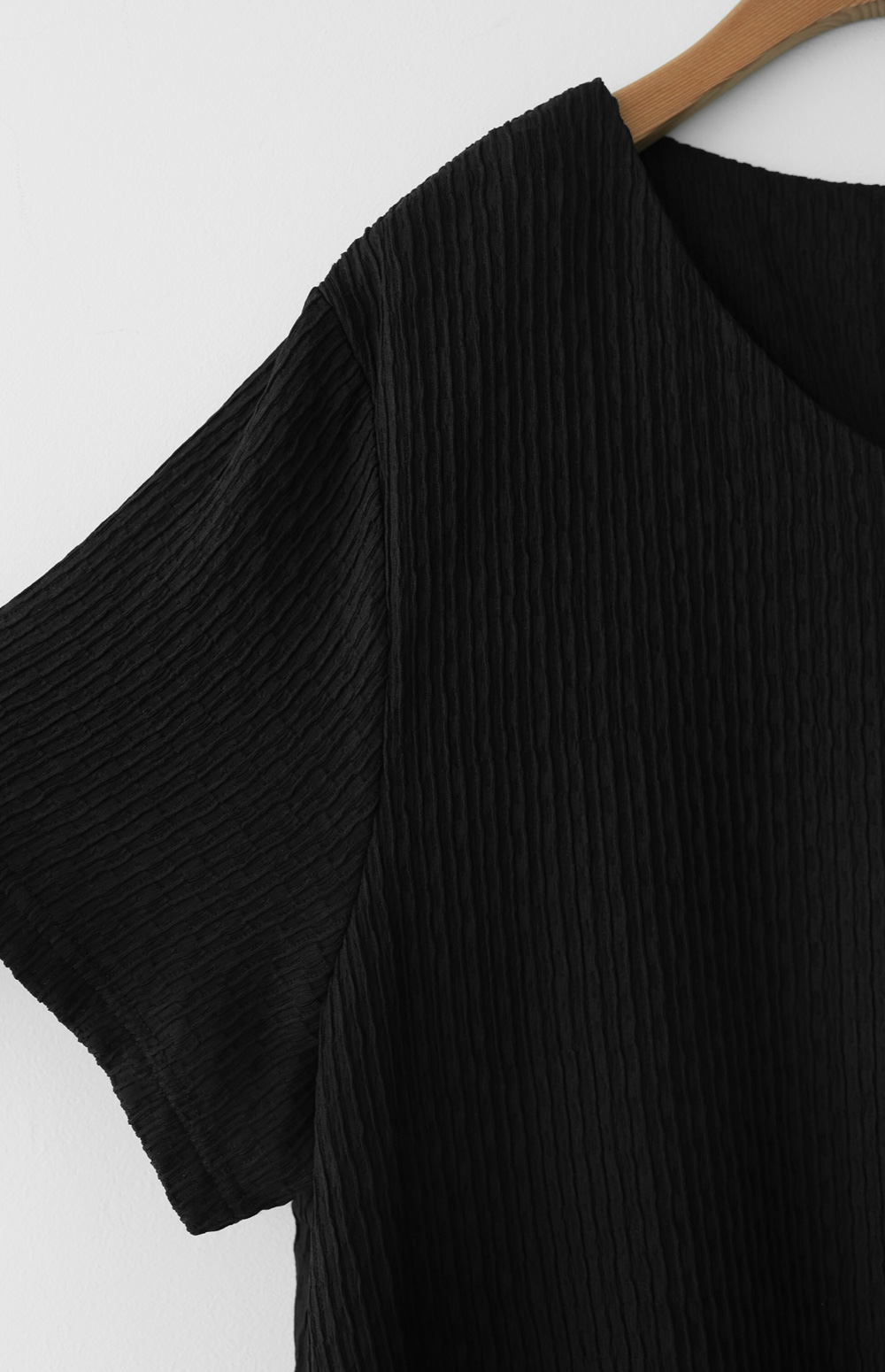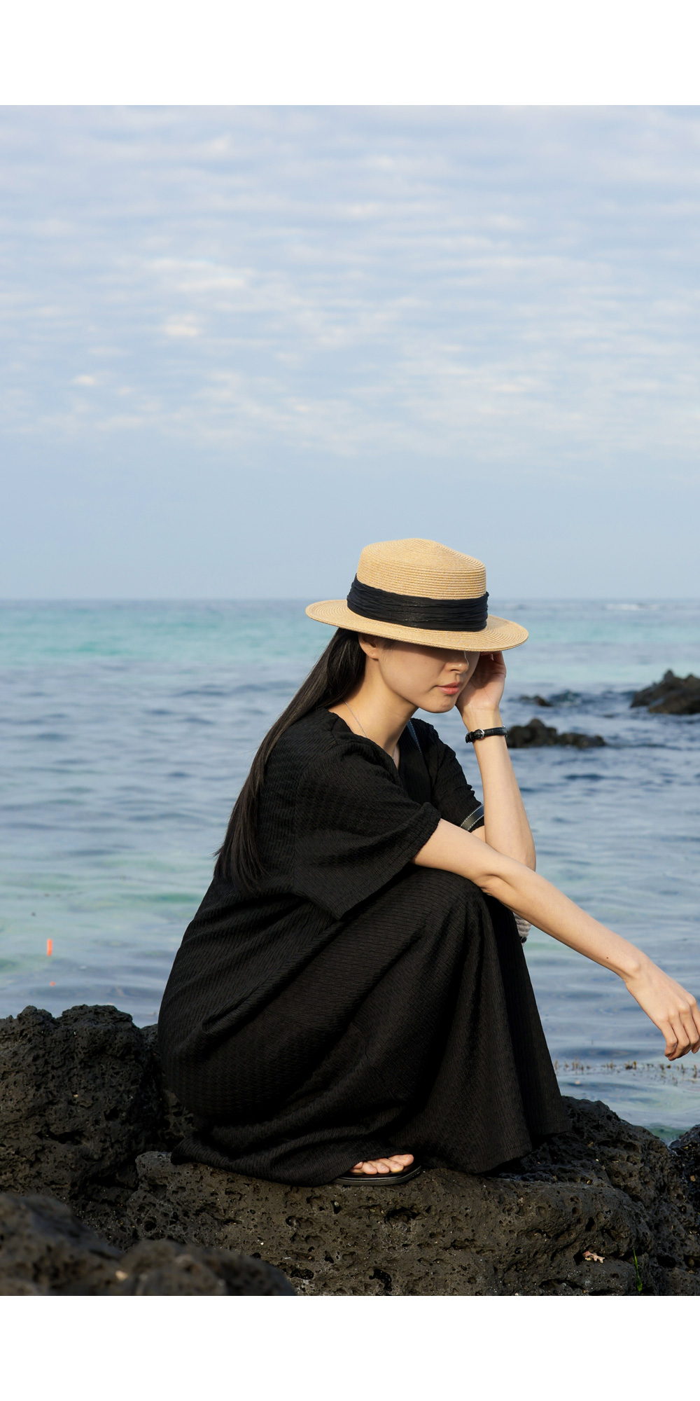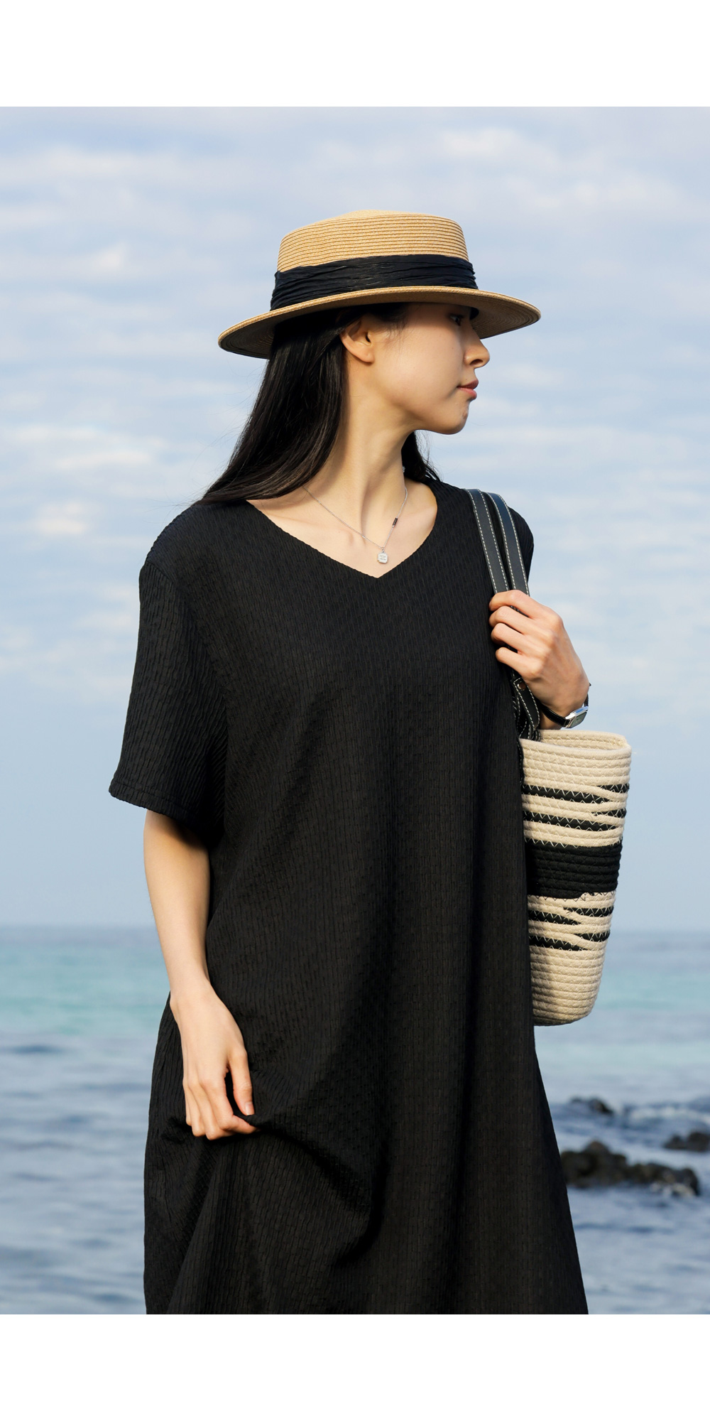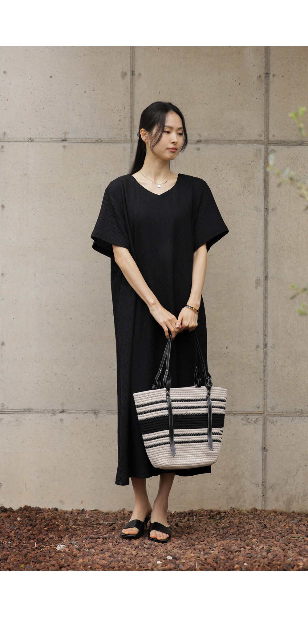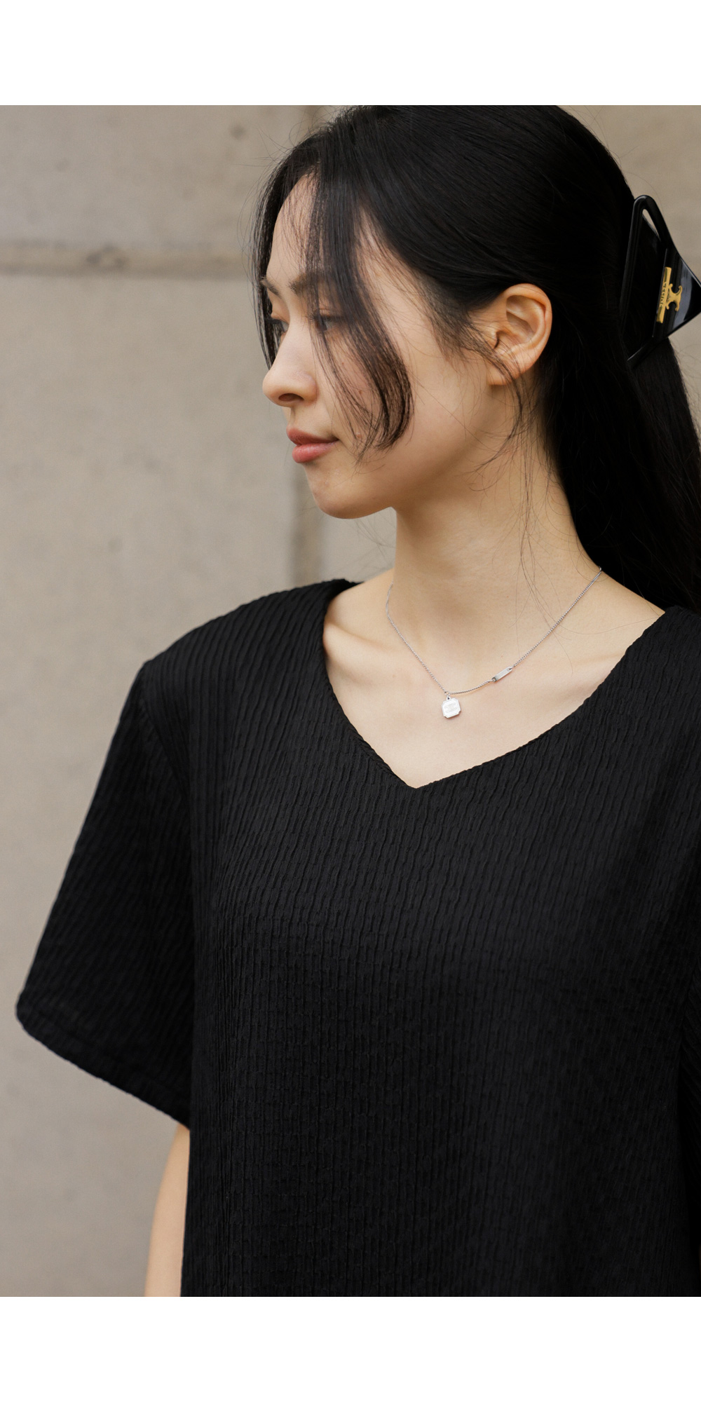 단독만으로 충분한 존재감을 발휘하는 제작 원피스 소개드려요. 몸에 달라붙지 않는 입체적인 텍스처 덕분에 단독으로 입어도 밋밋함 없이 세련된 무드가 느껴지구요, 적당한 깊이의 V넥이 목선을 길어 보이게 연출해 준답니다.