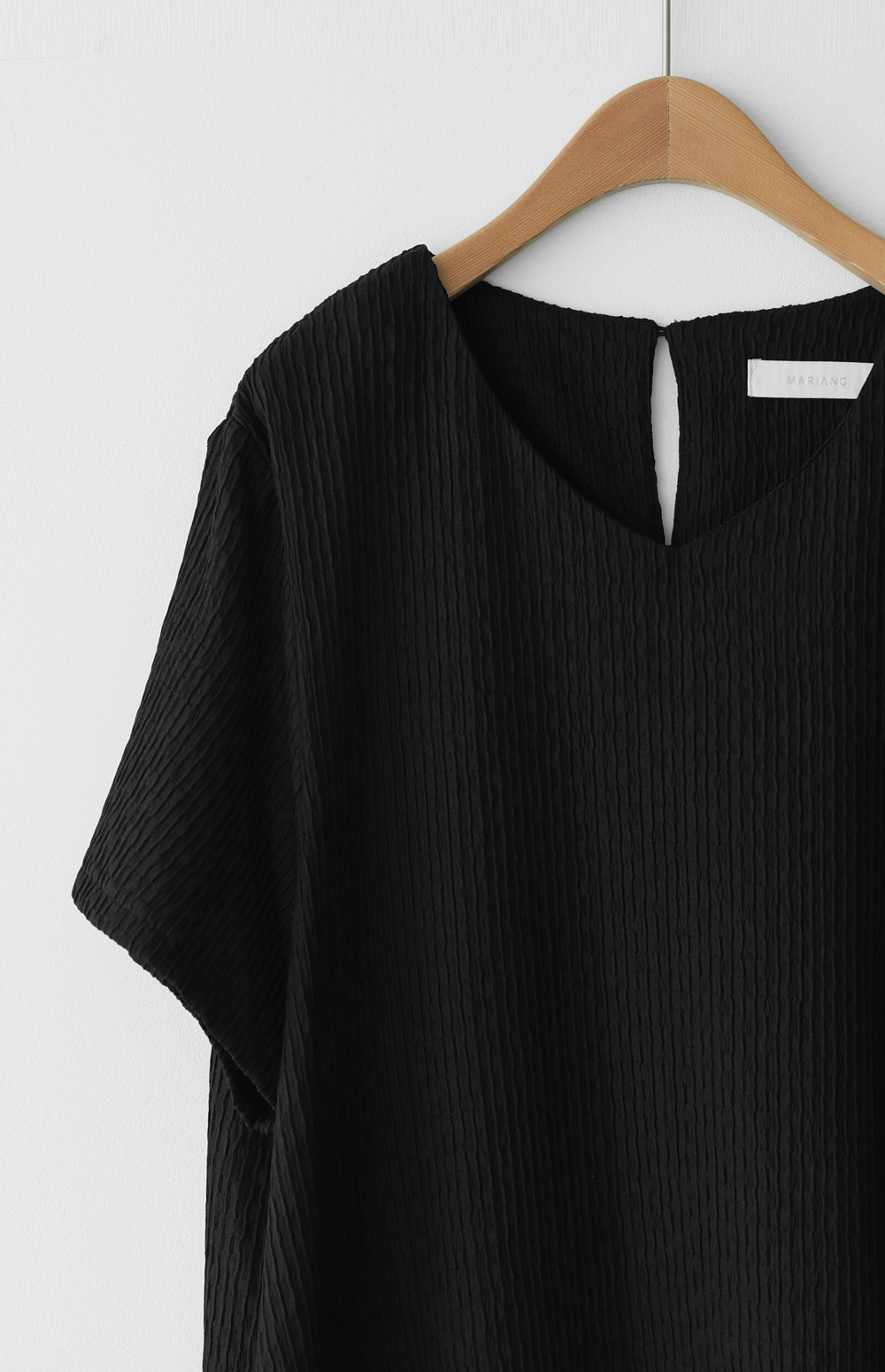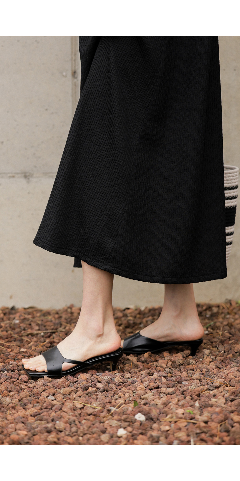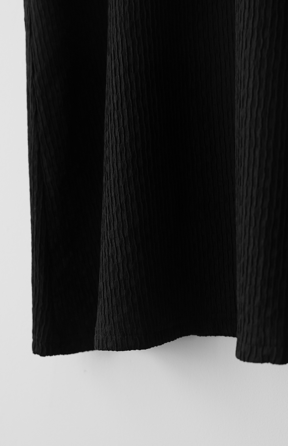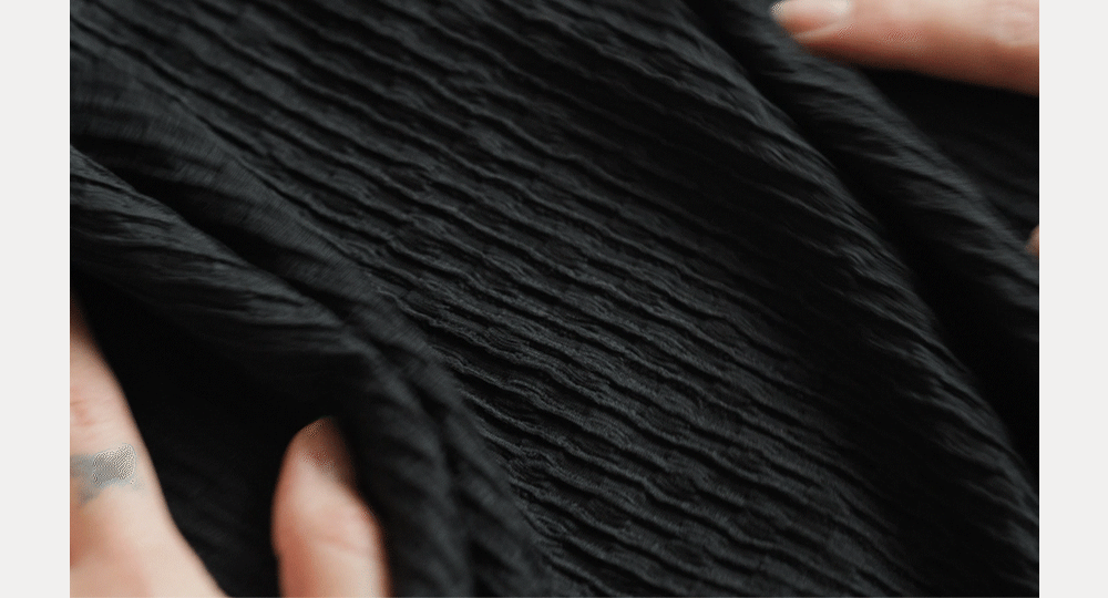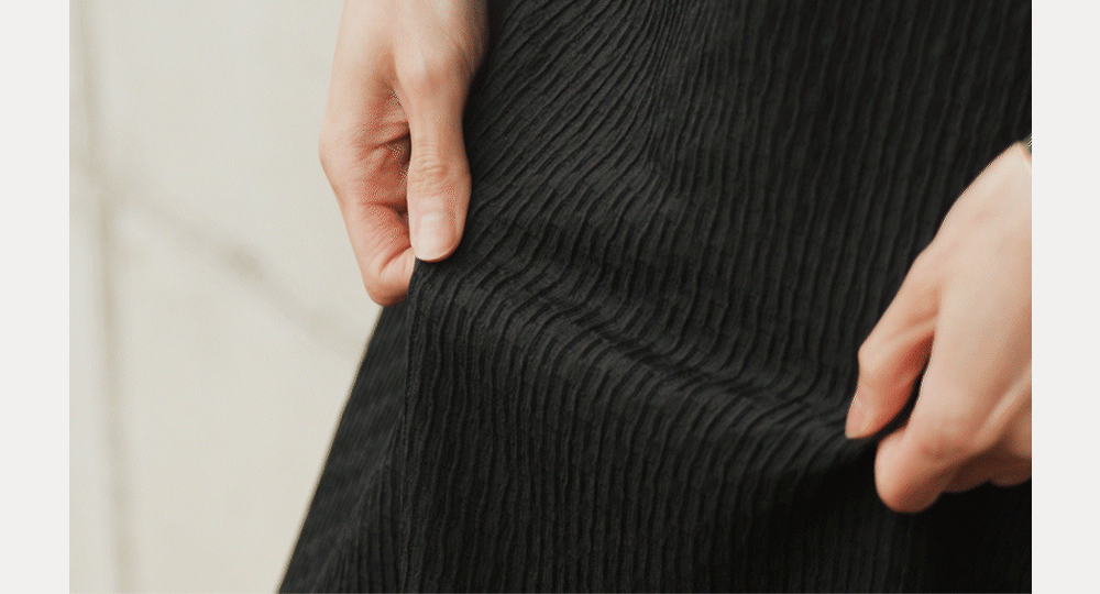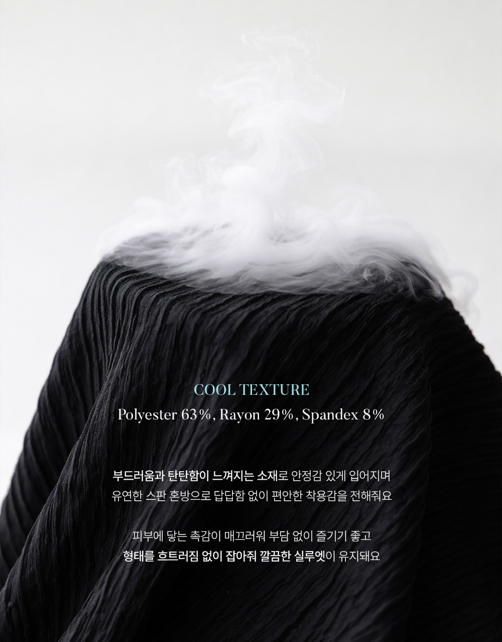 A:텍스처 자체가 피부에 쩍쩍 달라붙지 않는 쾌적한 소재라 오히려 다른 블랙 원단보다 시원하게 느껴지실 거예요.