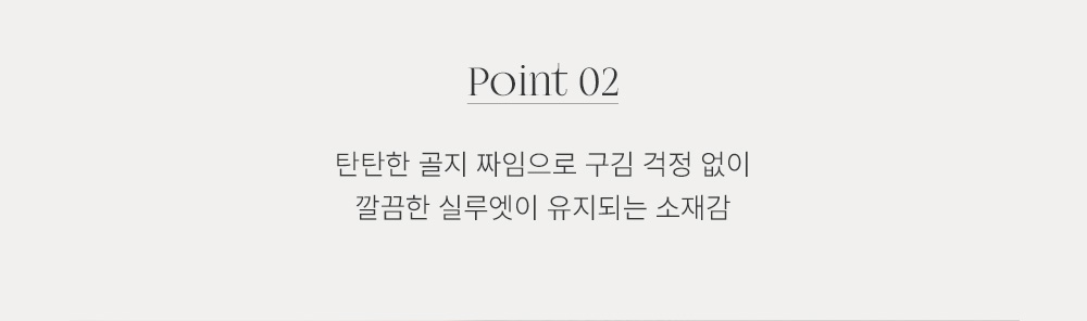 A:원단이 가볍게 아래로 툭 떨어지는 힘이 있어 부하게 뜨지 않고 차분하고 슬림하게 연출돼요.