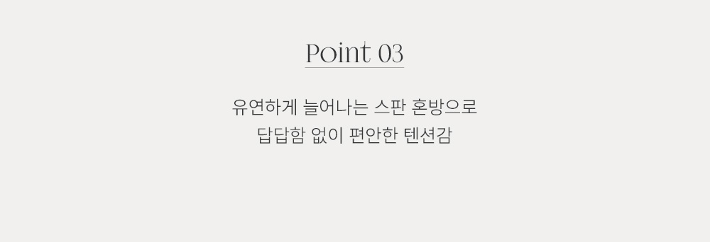 쫀쫀한 신축성까지 더해져 입었을 때 '정말 편하다'는 말이 절로 나올 정도로 만족스러운 착용감을 느끼실 수 있을 거예요.
