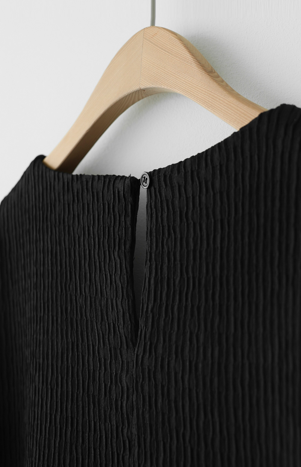 고슬고슬하면서도 부드러운 터칭감의 입체적인 텍스처가 가장 큰 포인트예요. 이 독특한 표면감이 피부에 닿는 면적을 줄여주어 쾌적함은 물론, 별도의 액세서리 없이도 원단 하나만으로 고급스러운 분위기를 자아낸답니다.