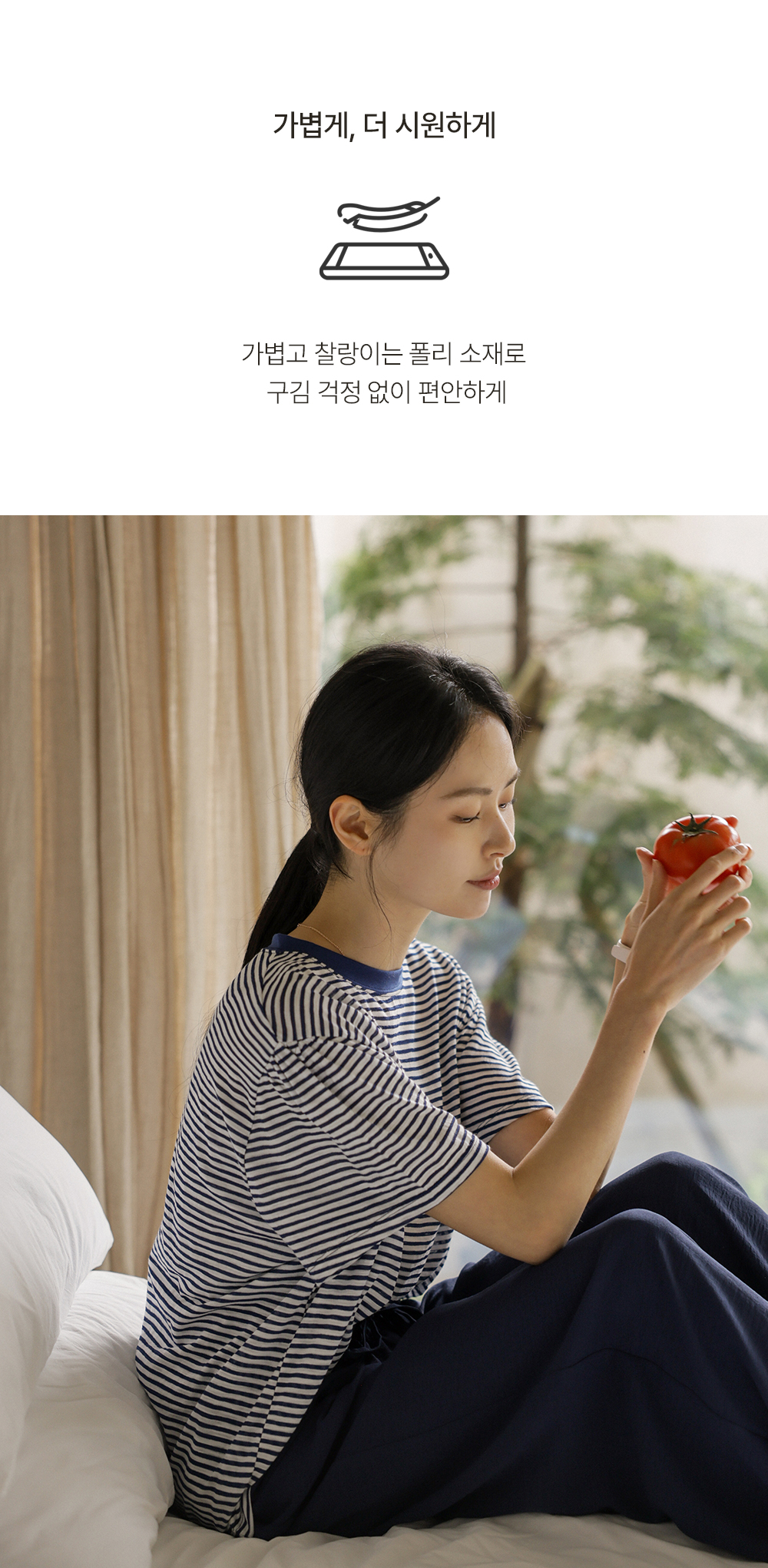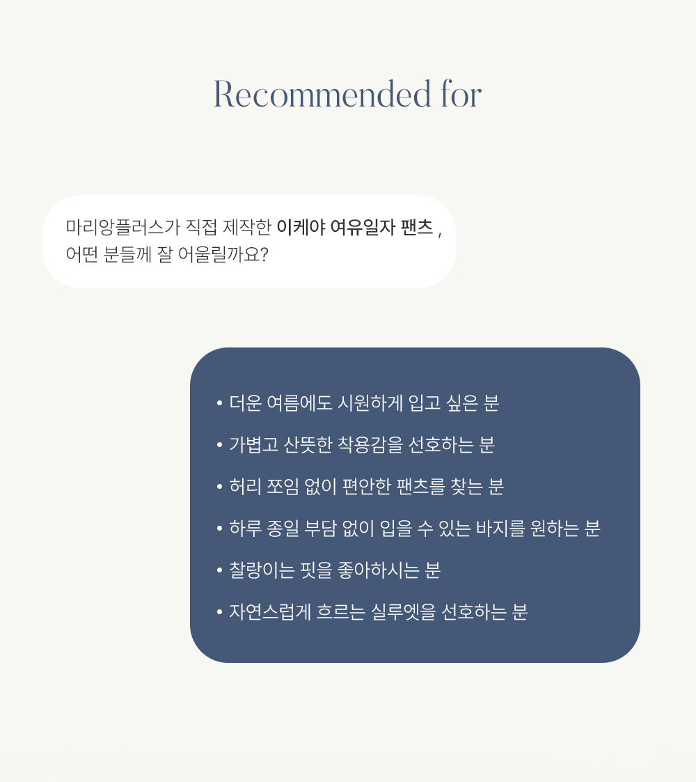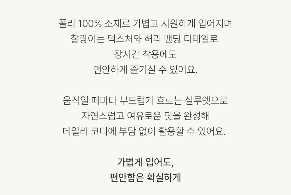 폴리 100% 소재로 제작되어 구김이 거의 없고 관리가 매우 쉬워요. 소재 특유의 가벼움과 시원한 터치감 덕분에 장시간 착용해도 피부에 자극이 없구요. 찰랑거리는 드레이프성이 뛰어나 움직일 때마다 우아한 실루엣을 만들어내며, 얇지만 탄탄한 조직감으로 쾌적하게 즐기기 좋은 소재랍니다. ![]() 핏 가이드 보러가기→ 밴딩 가이드 보러가기→ ![]() MD가 답하는 안심 Q&A