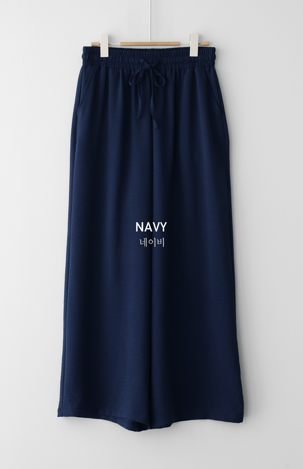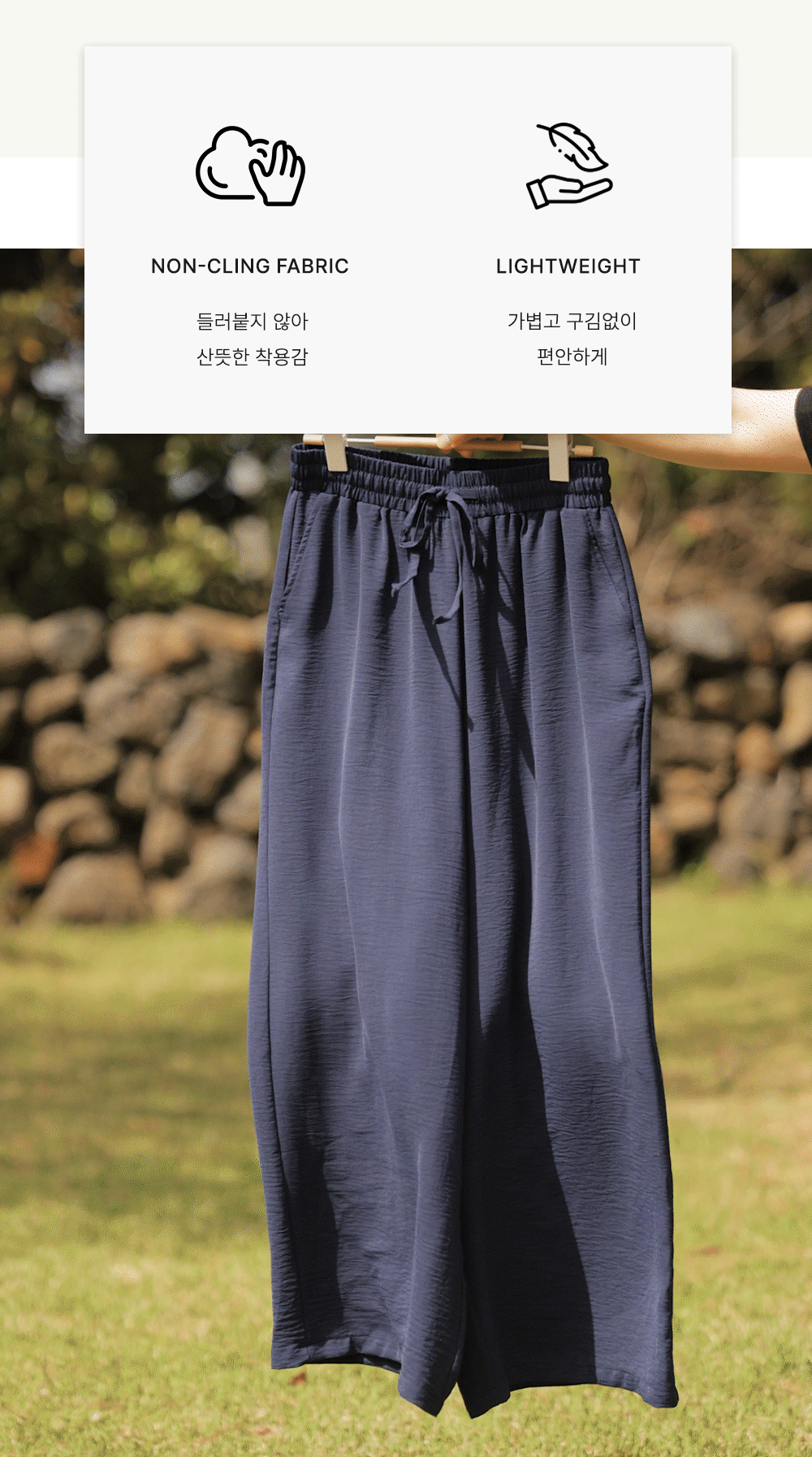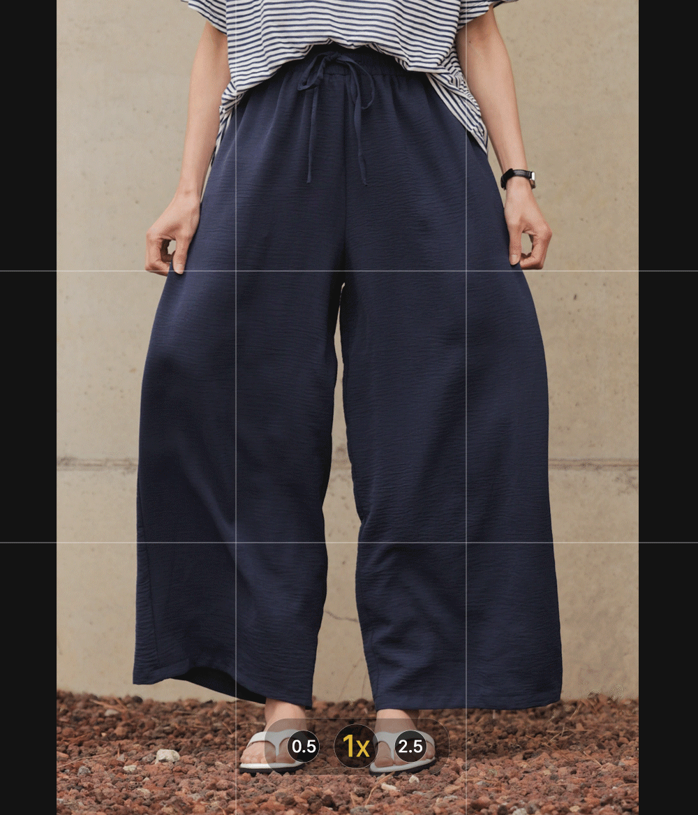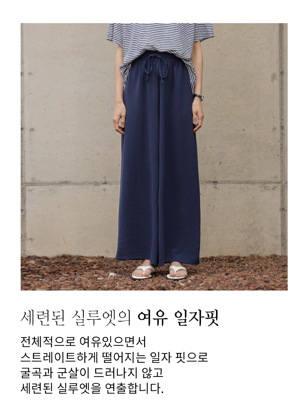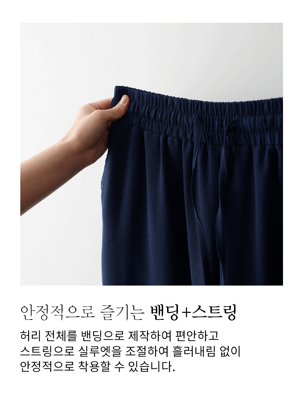 여유 있는 와이드 핏으로 제작되어 하체 라인을 드라마틱하게 커버해주는 팬츠예요. 몸에 달라붙지 않고 툭 떨어지는 실루엣이 걸을 때마다 찰랑이며 아주 세련된 분위기를 연출해주구요.