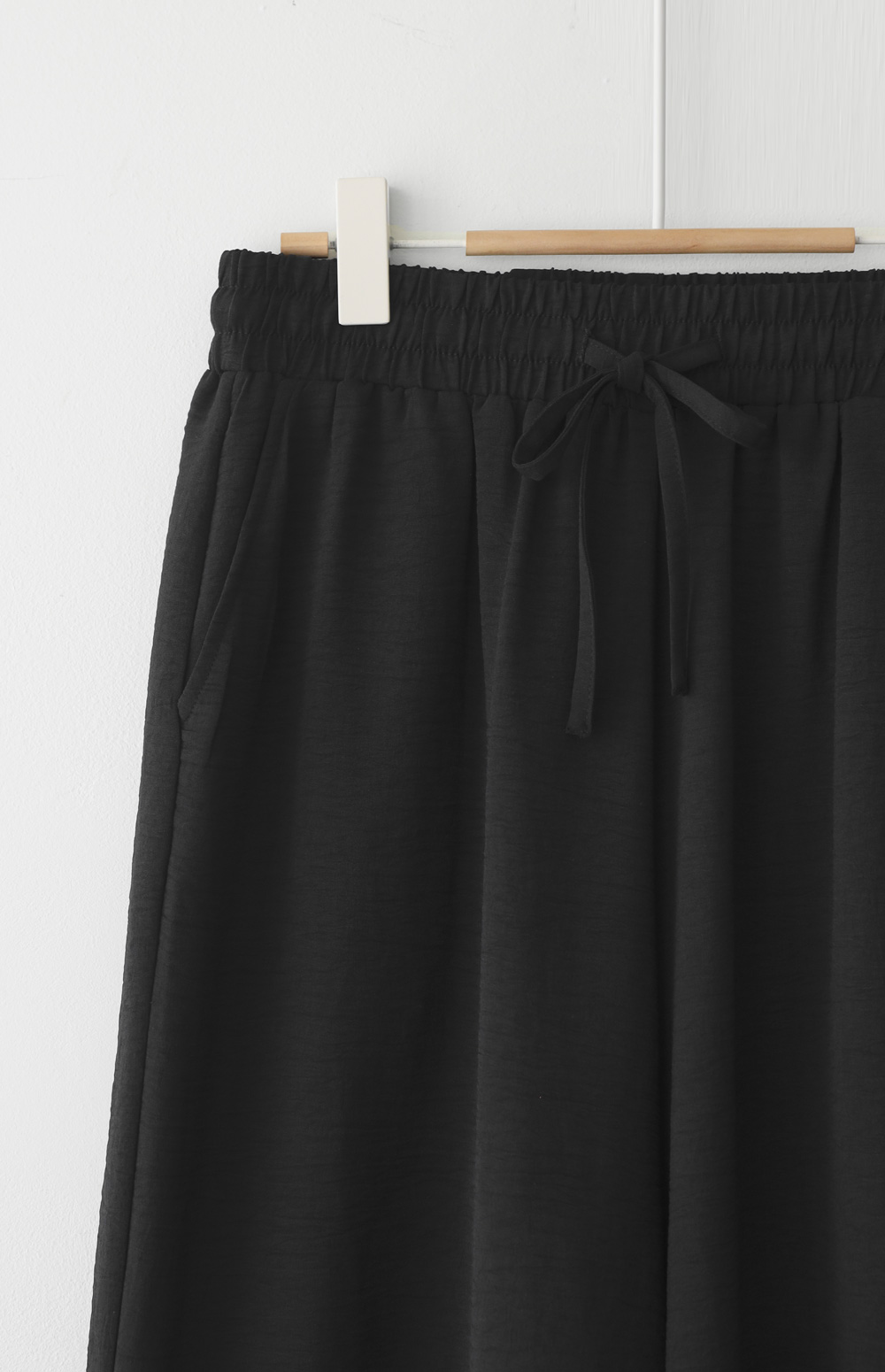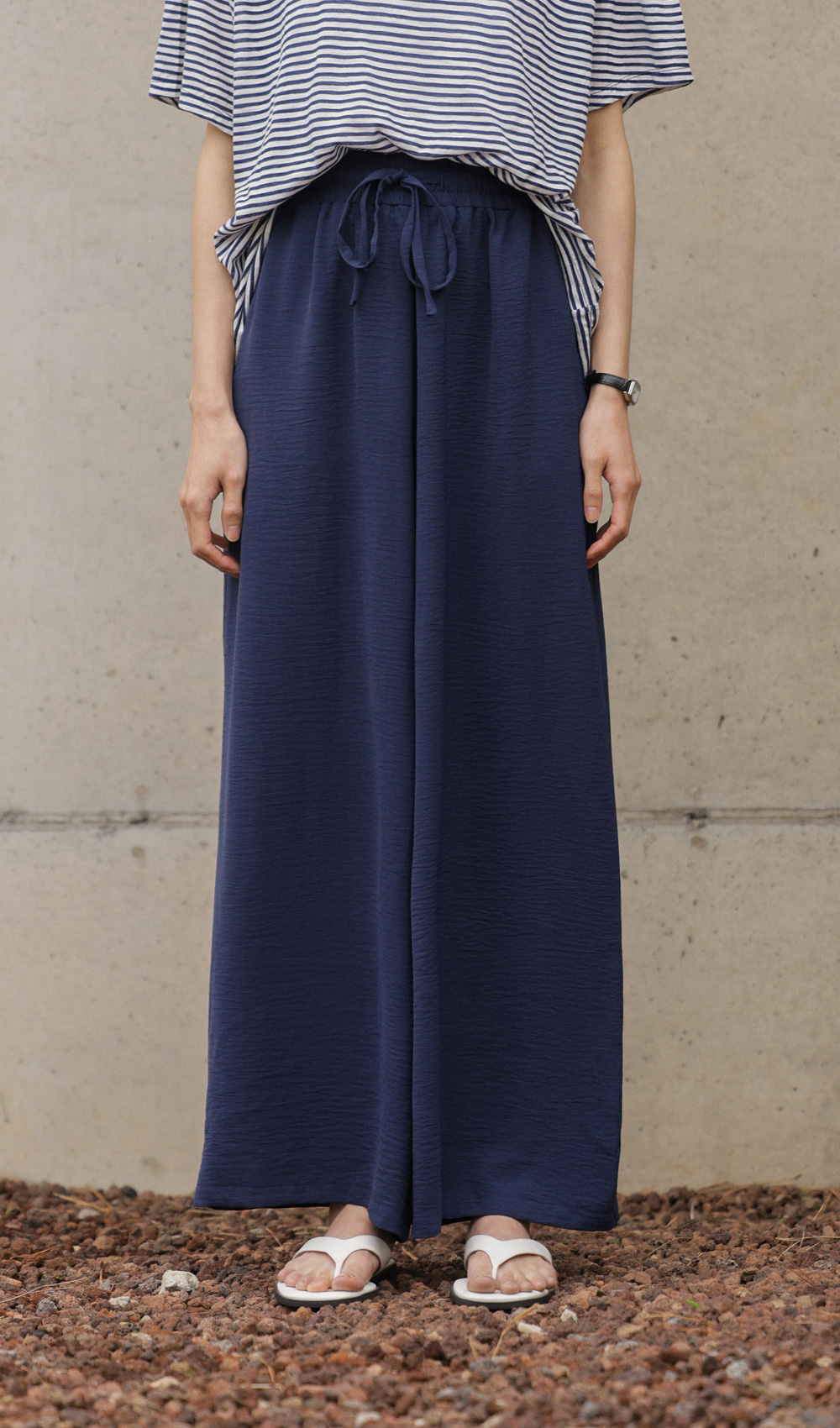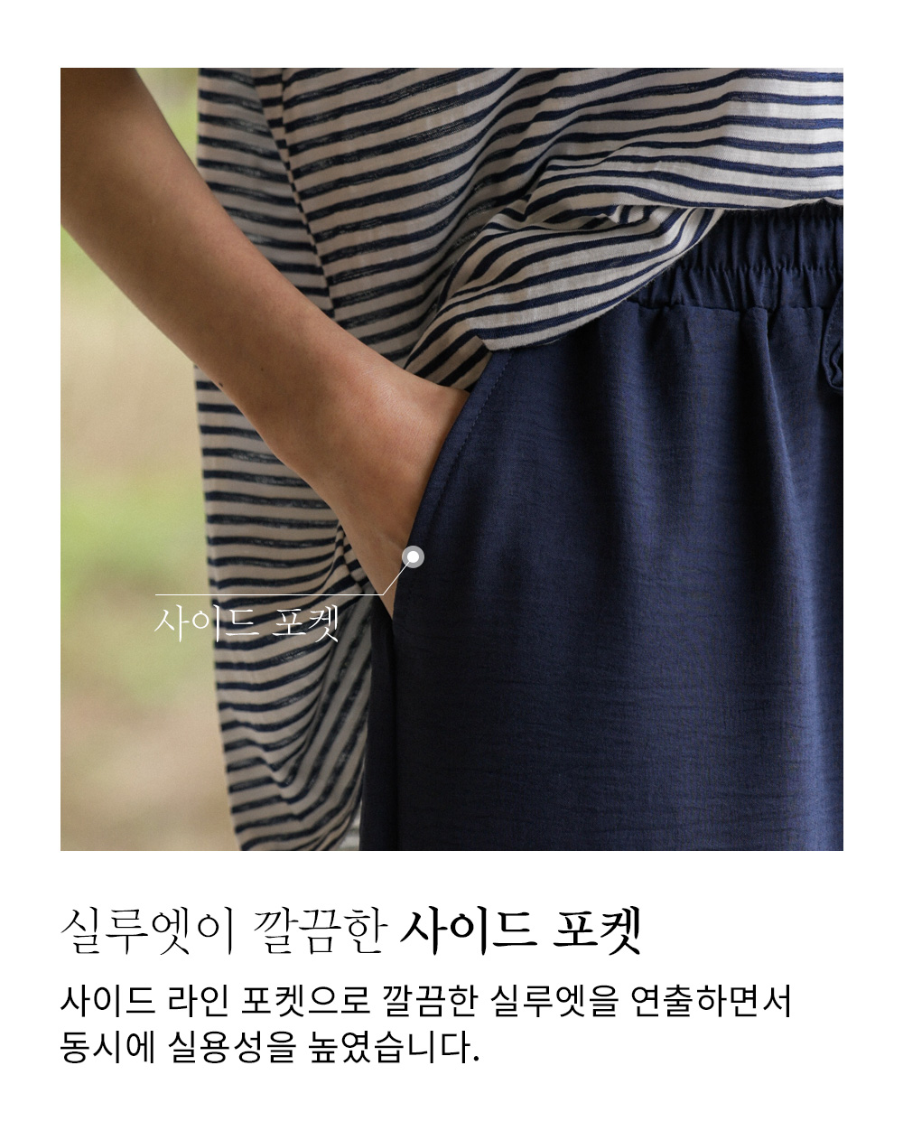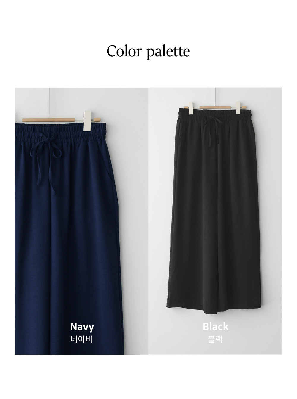 여유 있는 와이드 핏으로 제작되어 하체 라인을 드라마틱하게 커버해주는 팬츠예요. 몸에 달라붙지 않고 툭 떨어지는 실루엣이 걸을 때마다 찰랑이며 아주 세련된 분위기를 연출해주구요.