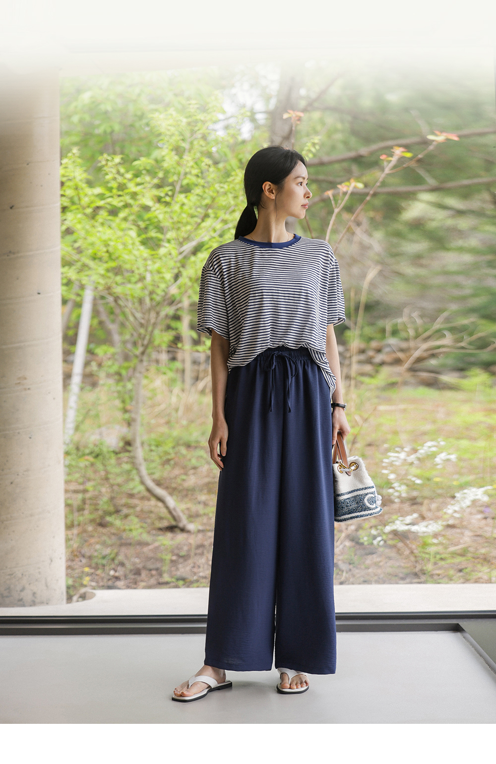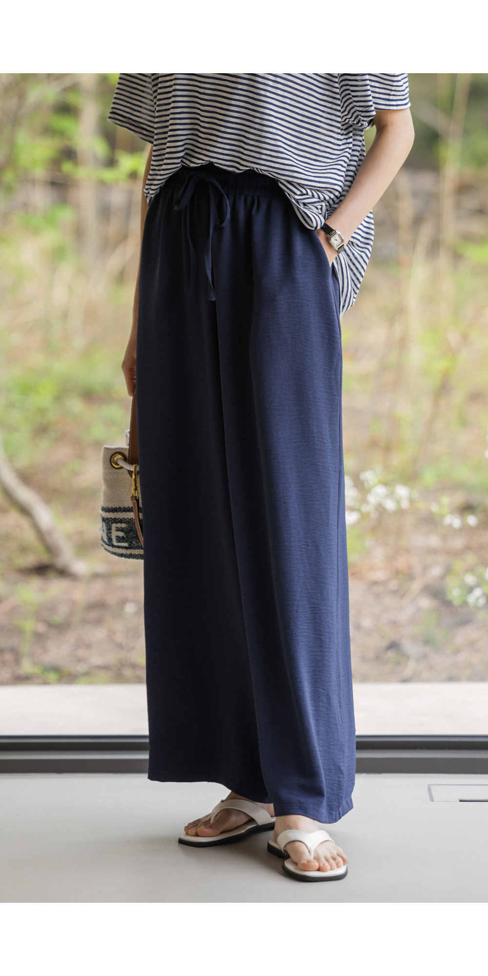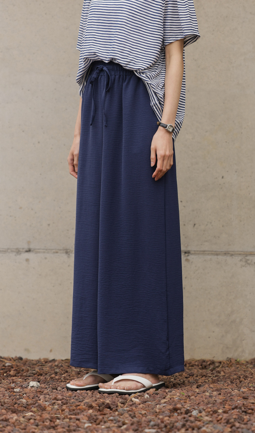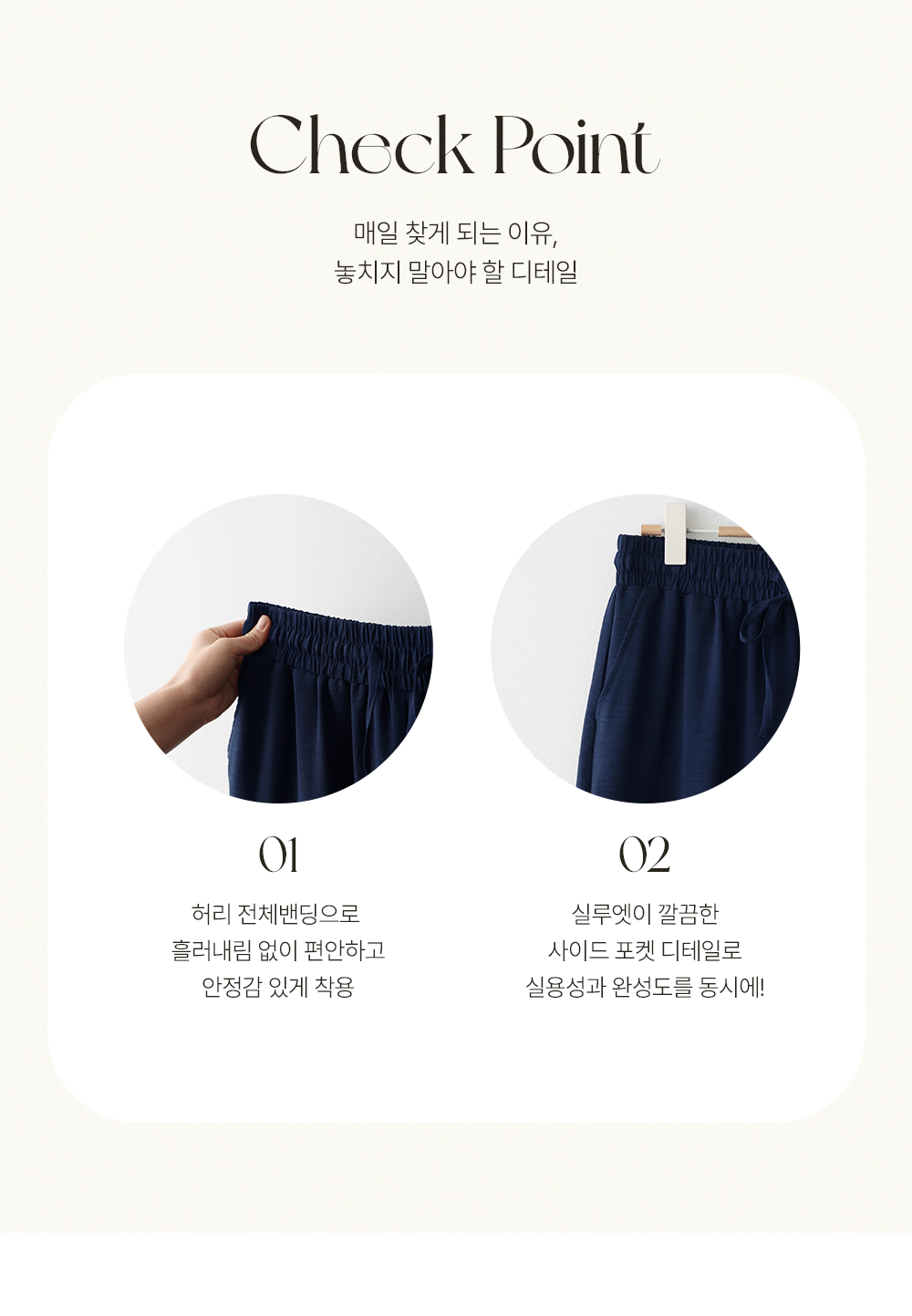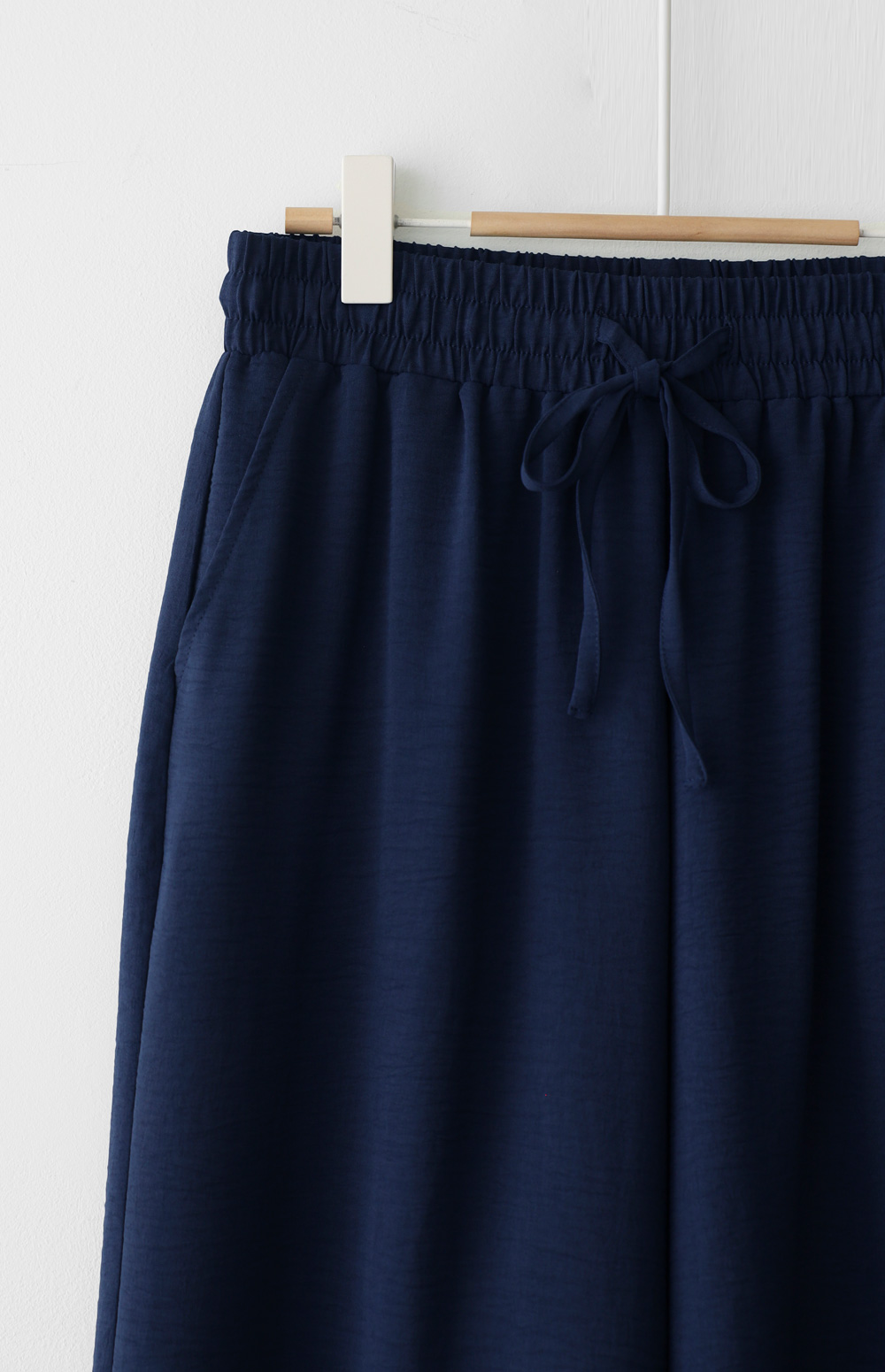 여유 있는 와이드 핏으로 제작되어 하체 라인을 드라마틱하게 커버해주는 팬츠예요. 몸에 달라붙지 않고 툭 떨어지는 실루엣이 걸을 때마다 찰랑이며 아주 세련된 분위기를 연출해주구요.