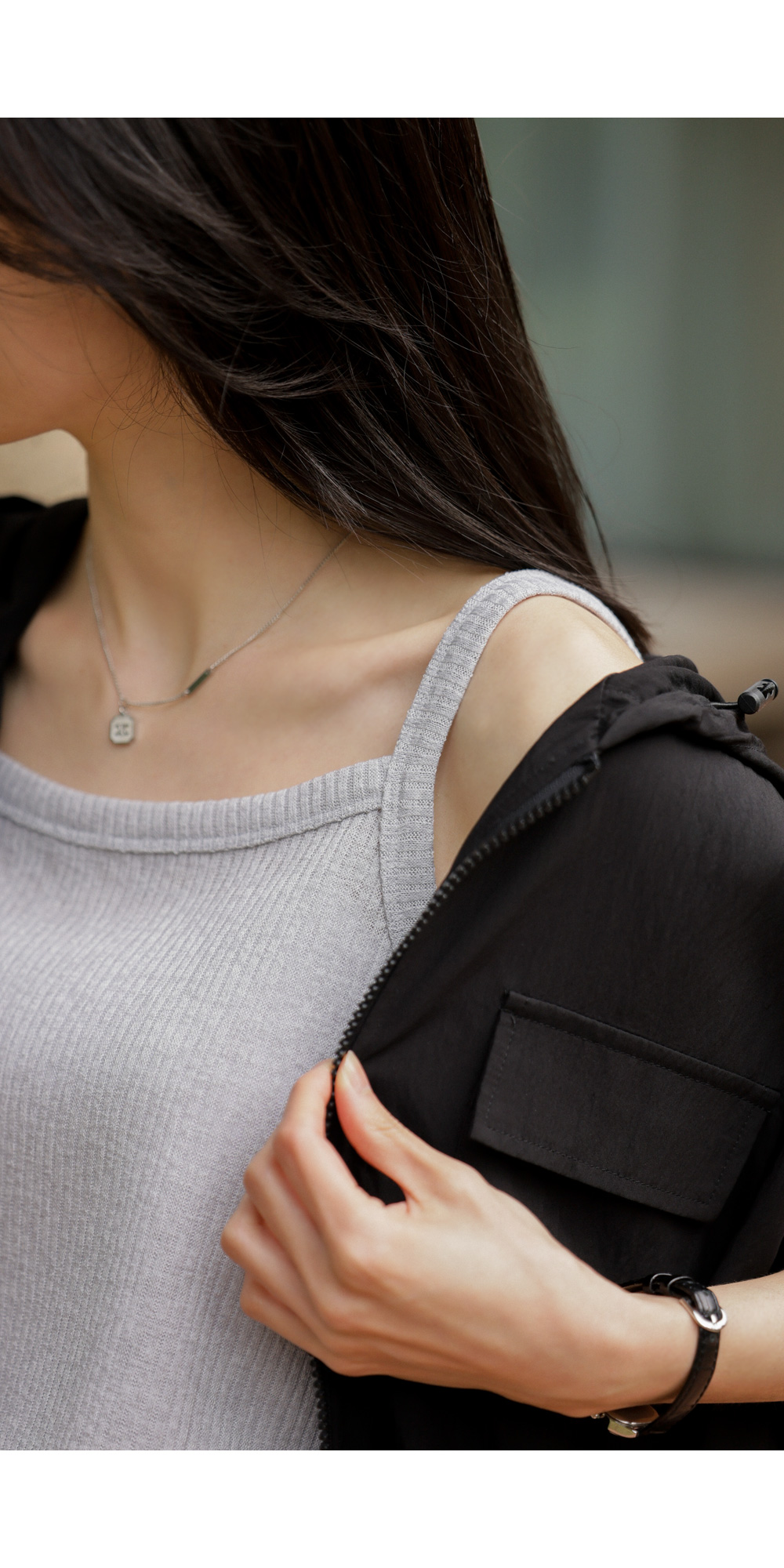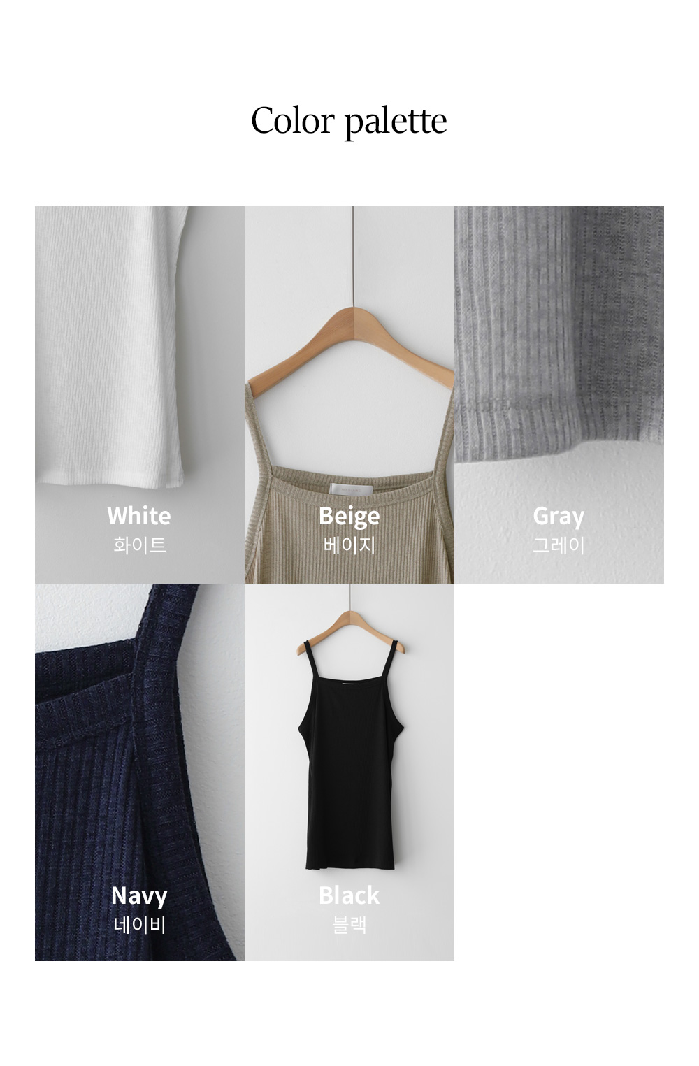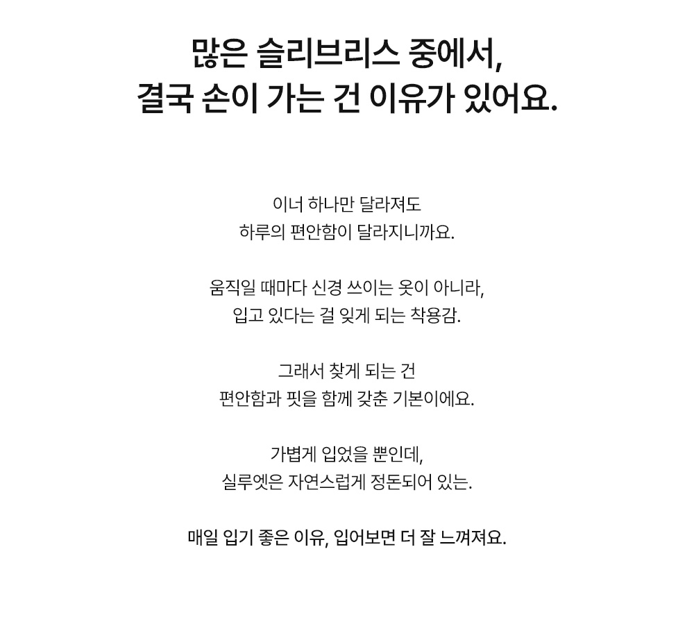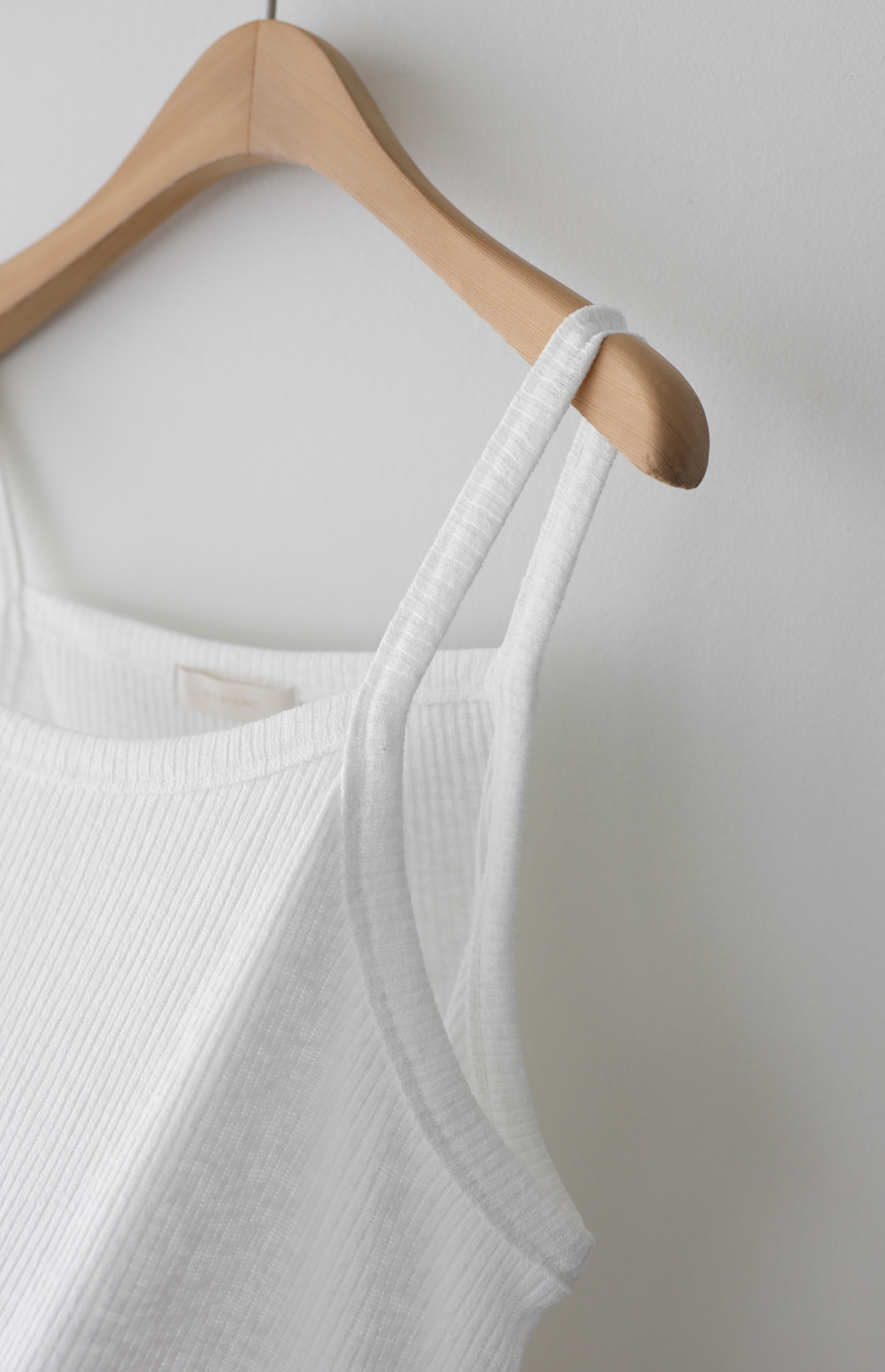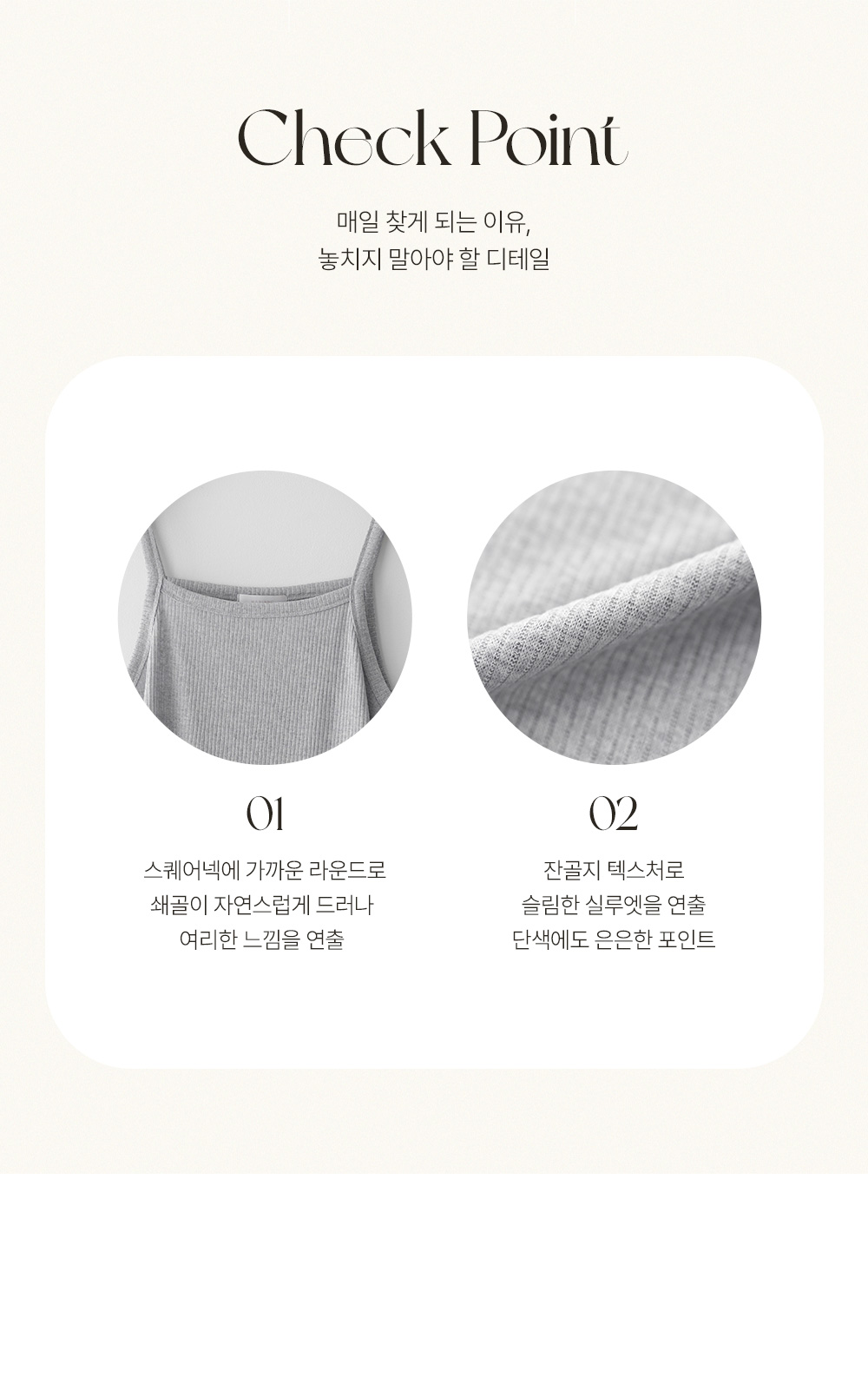 나시 아이템은 단독보다는 셔츠나 블라우스, 가디건 속에 받쳐 입는 이너로서의 역할이 가장 크죠. 이번 제품은 이너로서의 본분에 충실하면서도, 은은한 골지 텍스처를 더해 겉옷 사이로 살짝 비칠 때 더욱 세련된 무드를 완성해 준답니다.