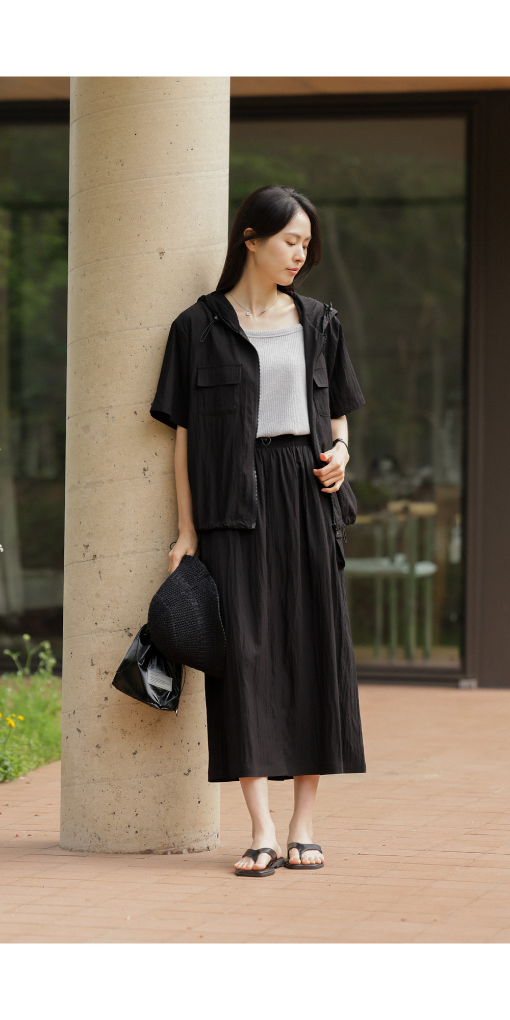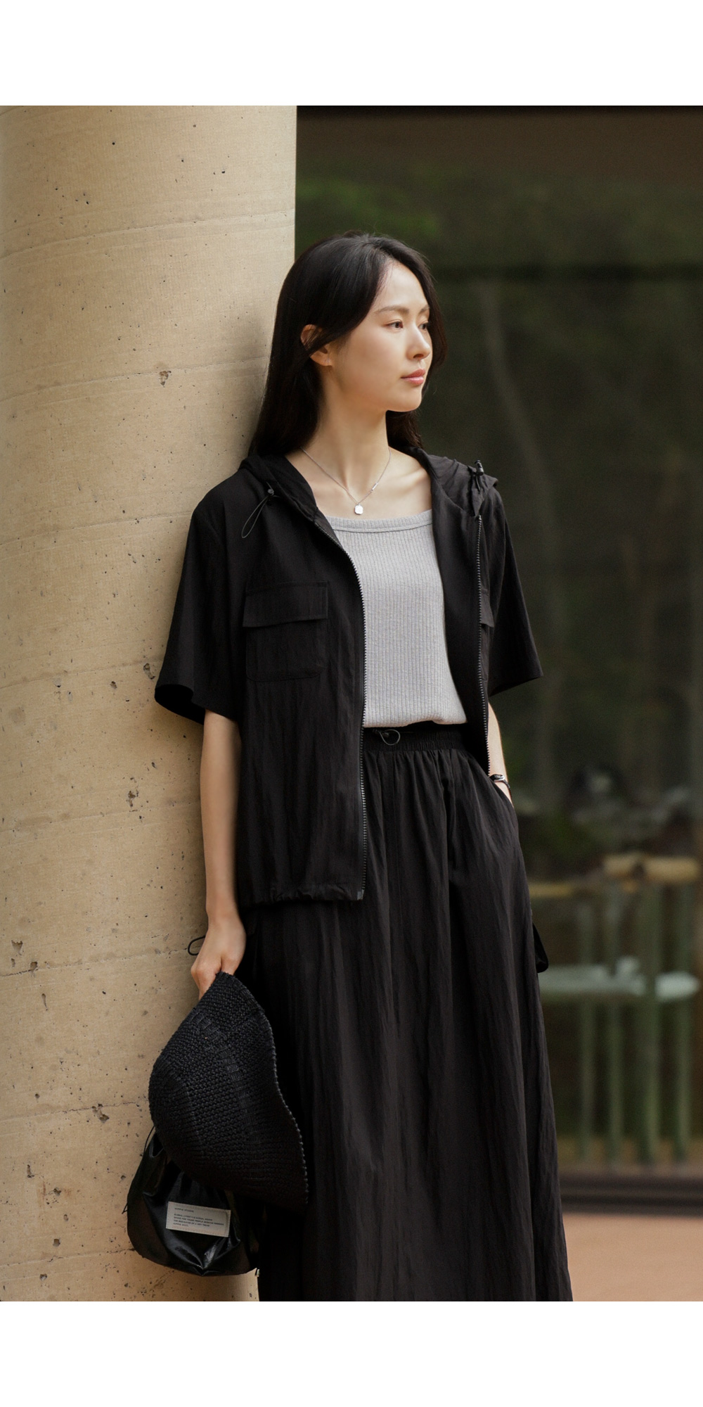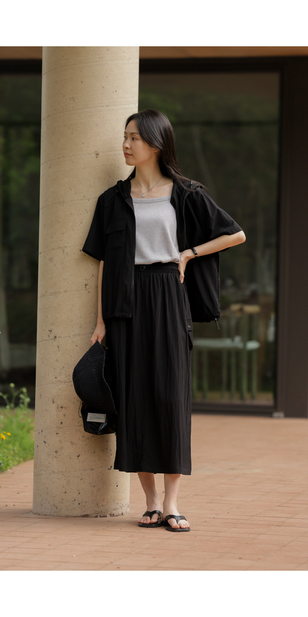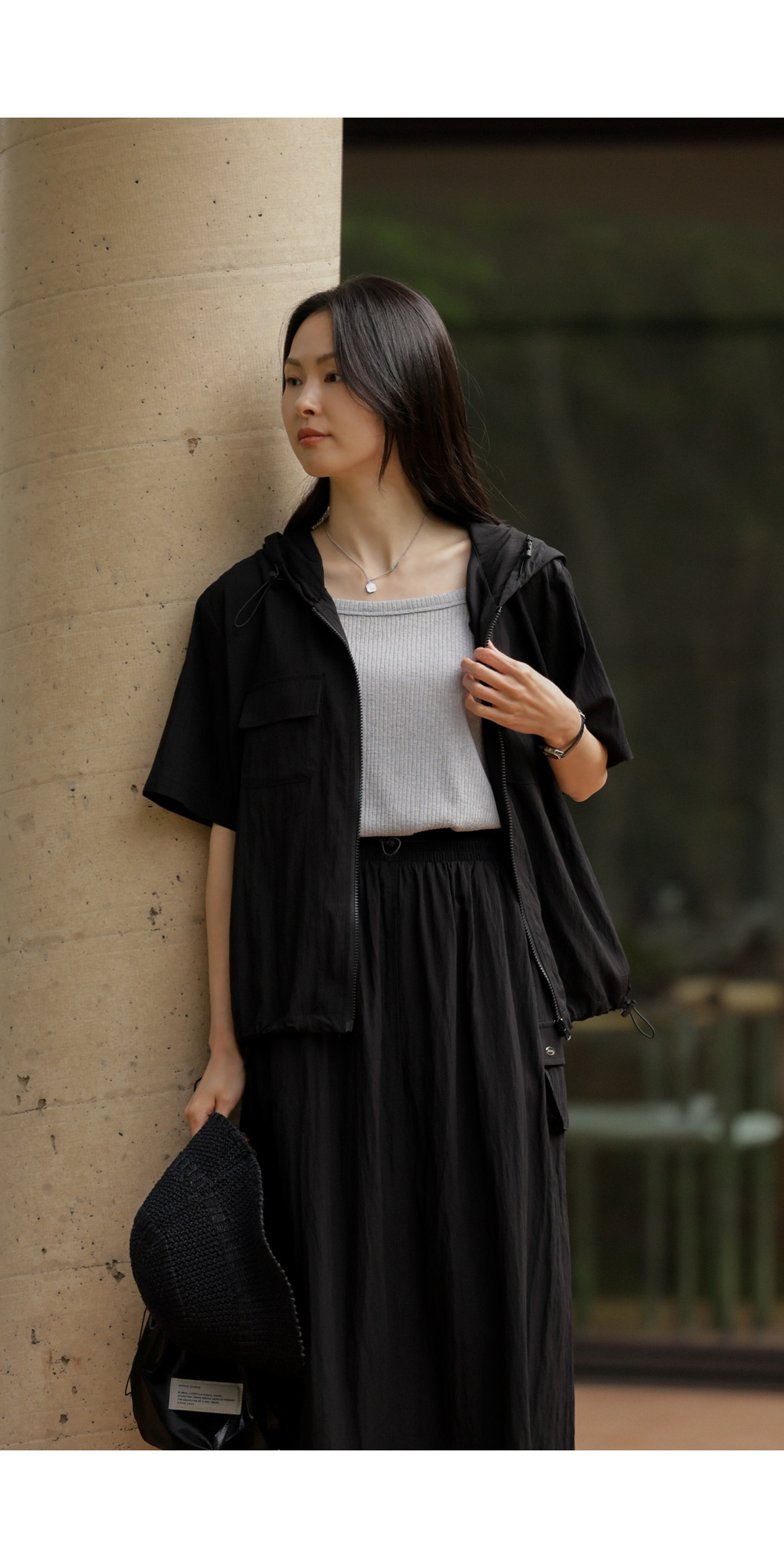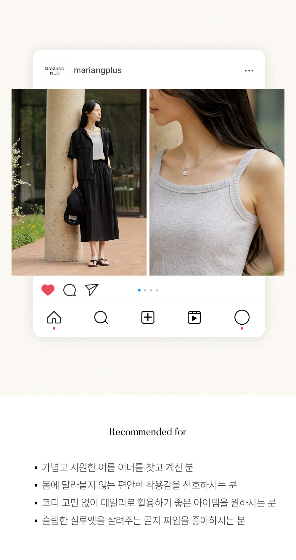 나시 아이템은 단독보다는 셔츠나 블라우스, 가디건 속에 받쳐 입는 이너로서의 역할이 가장 크죠. 이번 제품은 이너로서의 본분에 충실하면서도, 은은한 골지 텍스처를 더해 겉옷 사이로 살짝 비칠 때 더욱 세련된 무드를 완성해 준답니다.