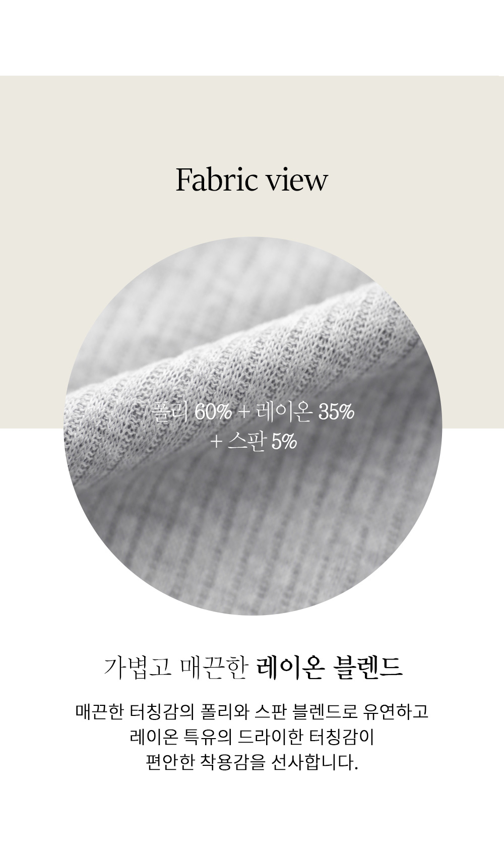 레이온과 폴리가 적절히 혼방되어 피부에 닿는 감촉이 부드러우면서도 탄탄한 힘이 느껴지는 소재예요. 입체적인 골지 텍스처가 원단 표면에 결을 만들어주어 고급스럽고, 가벼운 무게감 덕분에 이너로 겹쳐 입어도 몸에 닿는 느낌이 아주 산뜻하답니다. 소재 자체가 유연하여 몸의 움직임에 부드럽게 반응하며, 장시간 착용해도 쾌적함을 유지해 주는 훌륭한 소재감을 갖췄어요. ![]() MD가 답하는 안심 Q&A