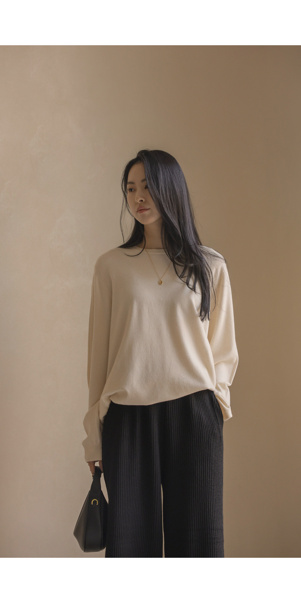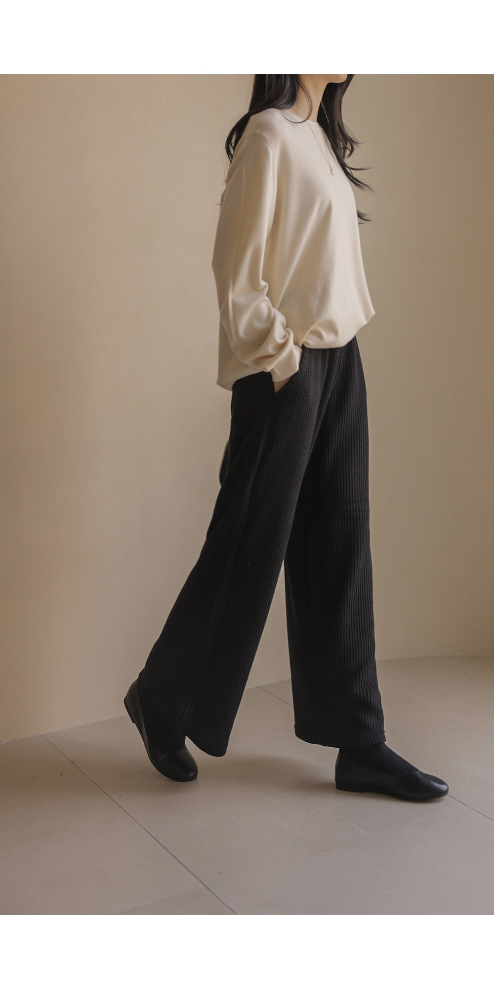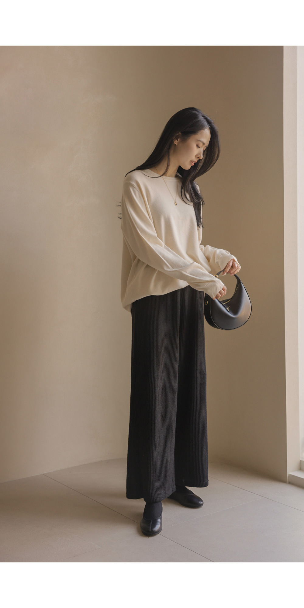 포그램 캐시미어 니트 _ 아이보리이보르 여유일자 팬츠 _ 블랙